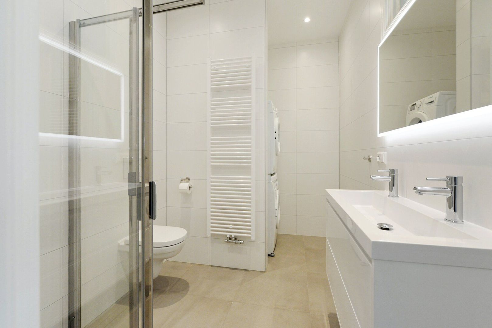 Moderne nieuwe keuken met diverse inbouwapparatuur zoals combi oven/magnetron, inductie kookplaat, afzuigkap, afwasmachine, koelkast en vriezer. Dubbele openslaande deuren naar het lange balkon van ca. 7.20x1m. Doorloop naar de hoofdslaapkamer ca. 3.50x3.25 met een echte inloopkast. Moderne badkamer met wastafelmeubel met dubbele mengkraan, douche, toilet en wasmachine en droger.