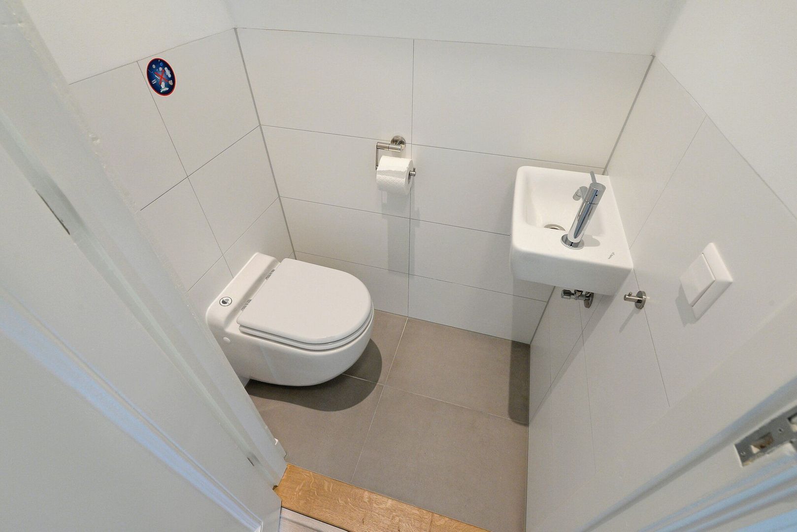Entree van het appartement, hal, modern toilet met fontein, slaapkamer/studeerkamer I ca.3.64/2.63 x 2.38 met deur tot klein balkon met 2 balkonkasten.