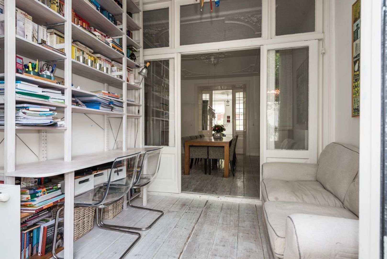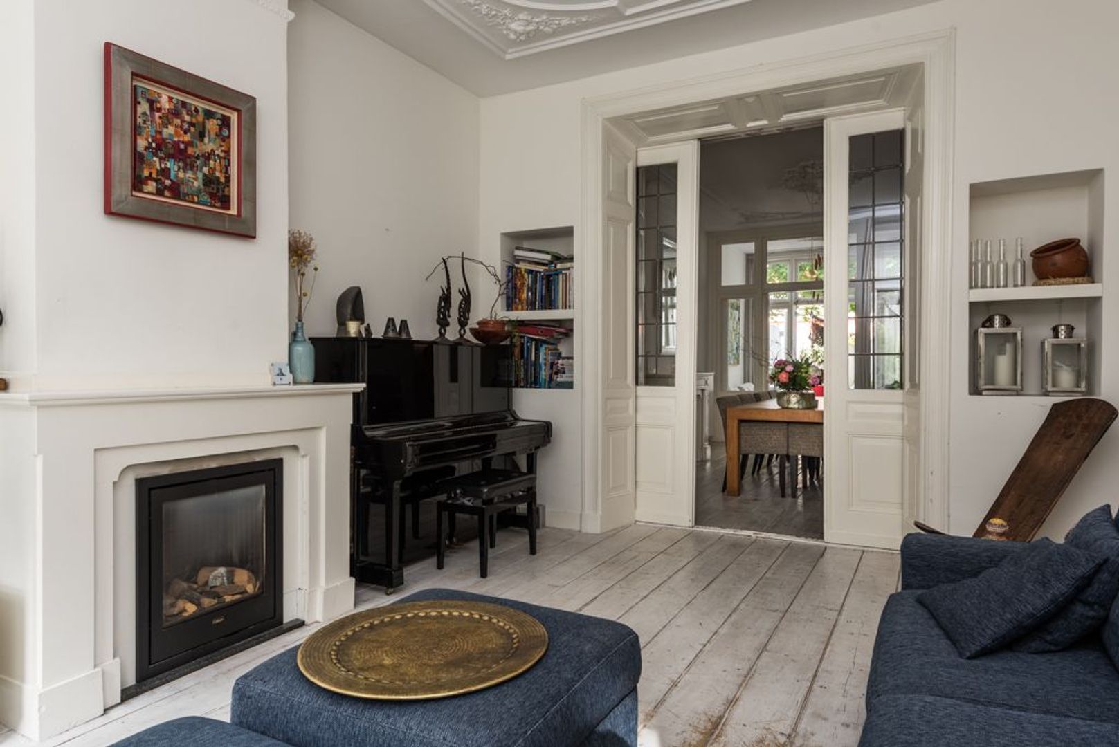 Living room (approx. 5.38x3.88) with adjoining dining room (approx. 5.52x3.88) and conservatory (approx. 2.93x2.24) with moulded ceilings, leaded glass separation, cupboards, wooden parquet flooring, fireplace and entrance to the sunny backyard (approx. 10.97x2.93), with a lounge area.