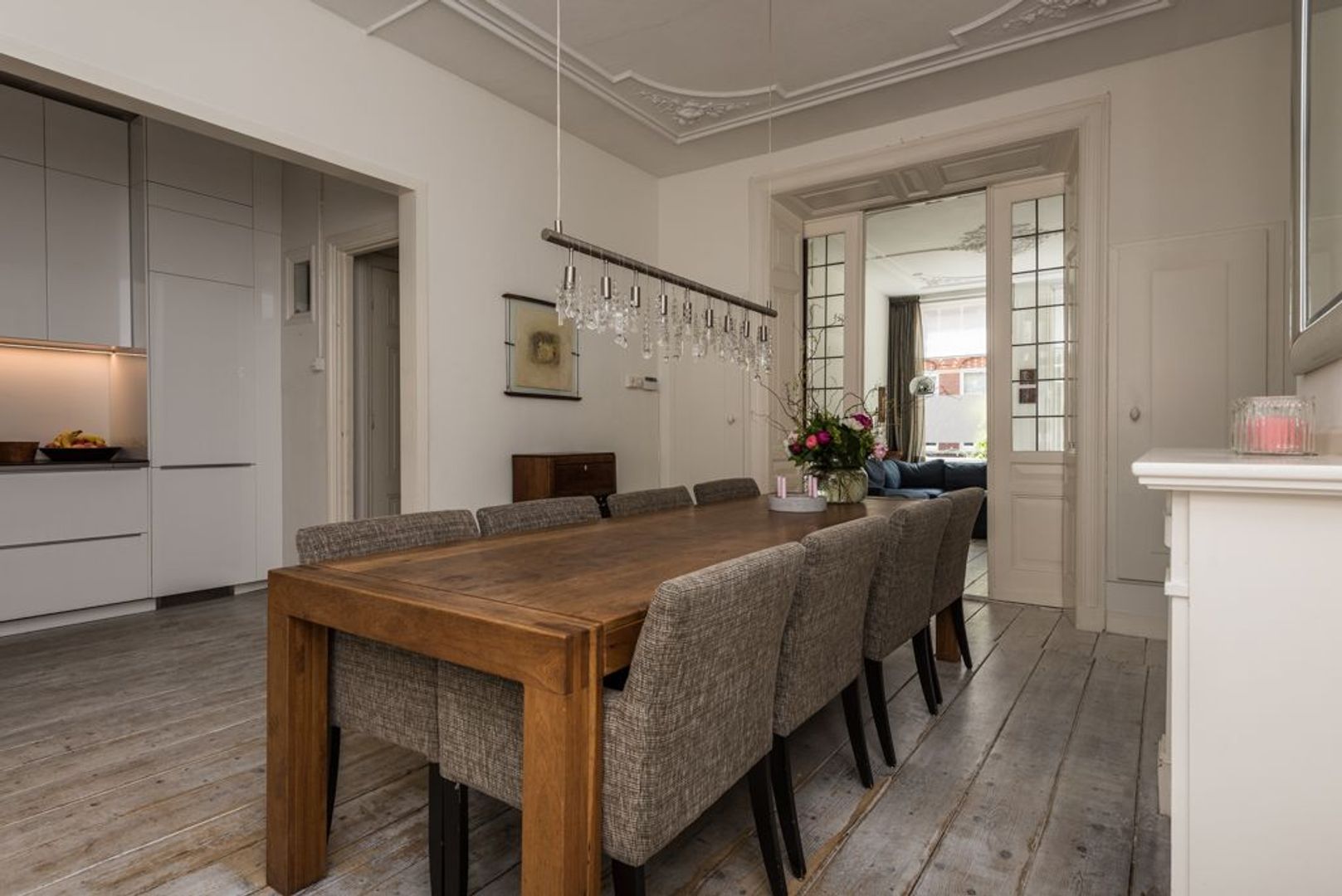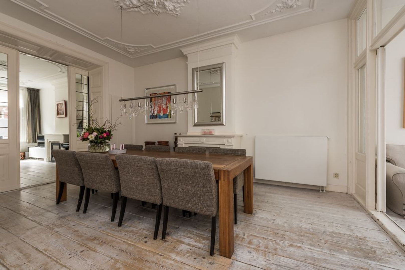Woonkamer (ca. 5.38x3.88) en suite met eetkamer (ca. 5.52.3.88) en serre (ca. 2.93x2.24) met lijstenplafonds, glas in lood suiteseparatie, vaste kasten, houten vloerdelen, schouwen en opslaande deuren naar e zonnige achtertuin (ca. 10.97x2.93), met lounge gedeelte.