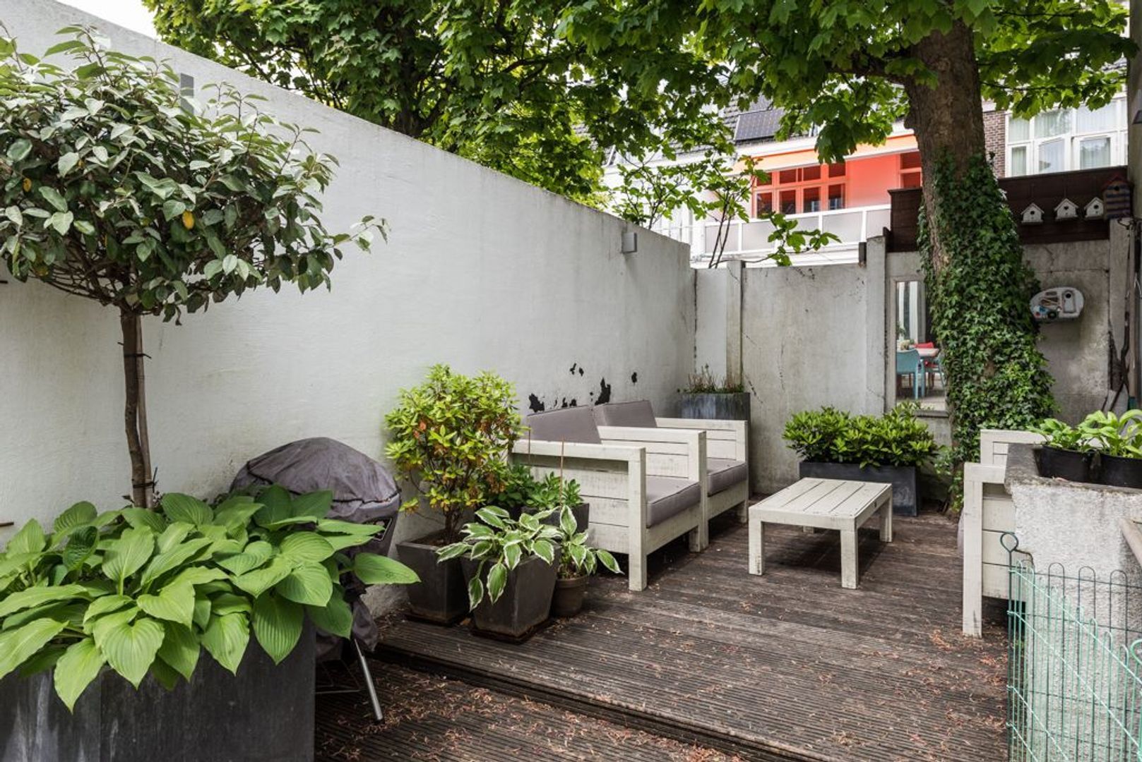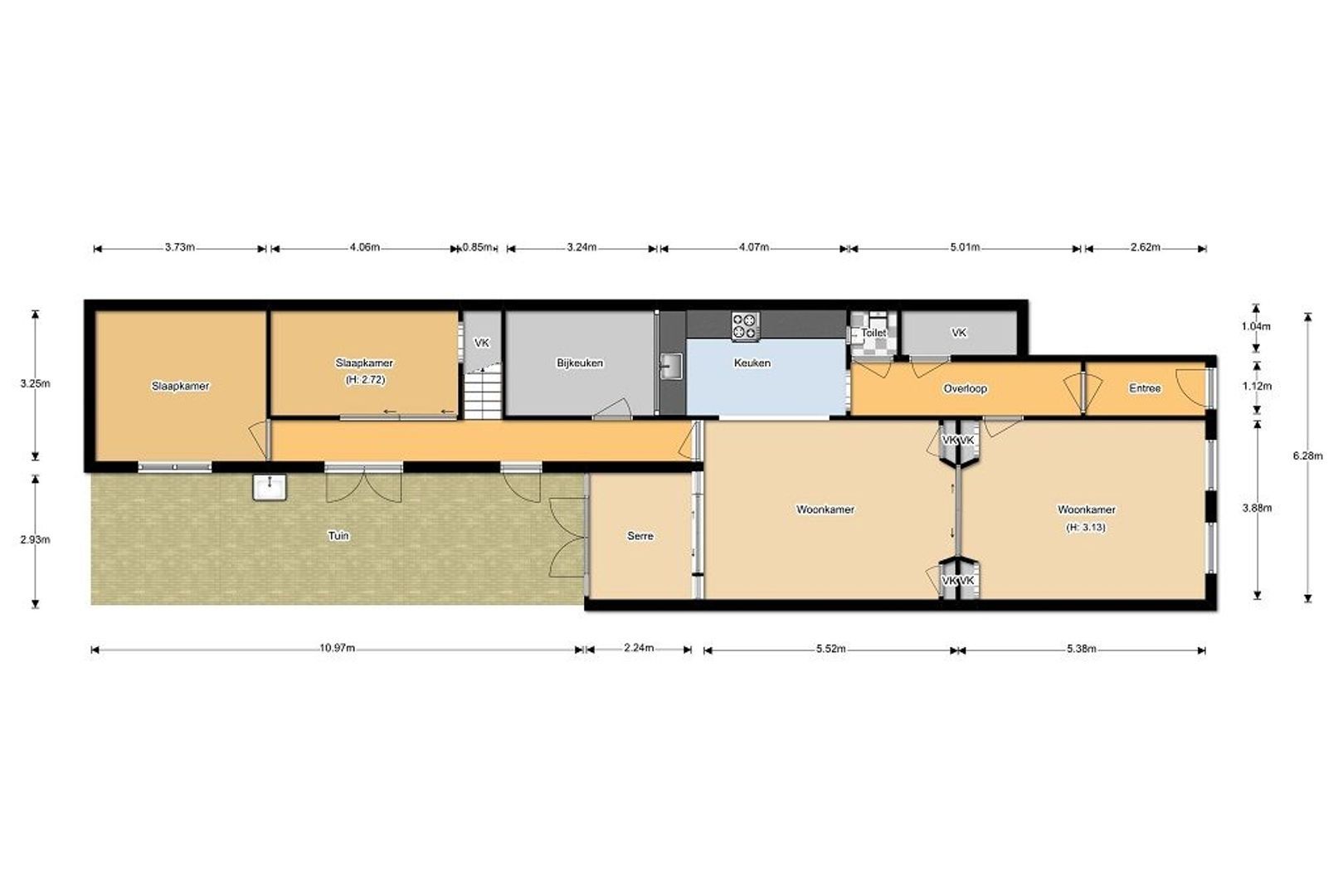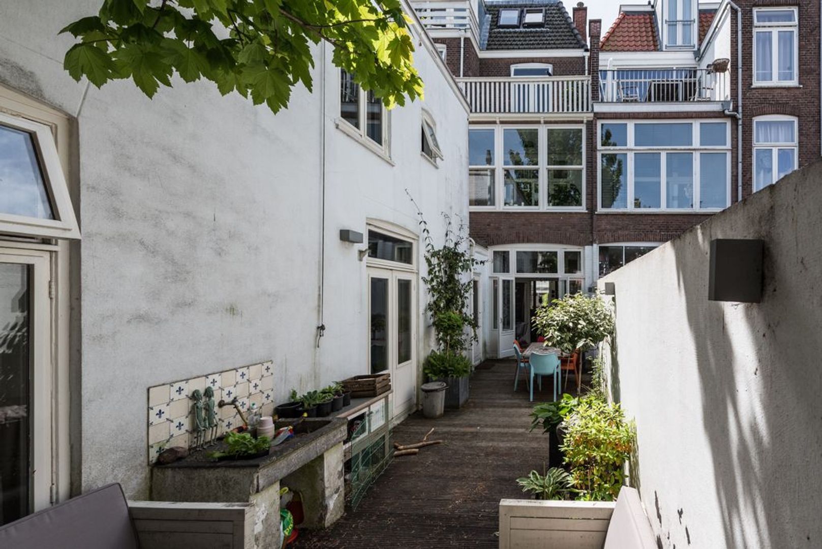 Afgesloten gang met bijkeuken (ca. 2.40x3.24), slaapkamer I (ca. 3.25x3.73), slaapkamer II (ca. 4.06x2.40) en openslaande deuren naar de achtertuin.