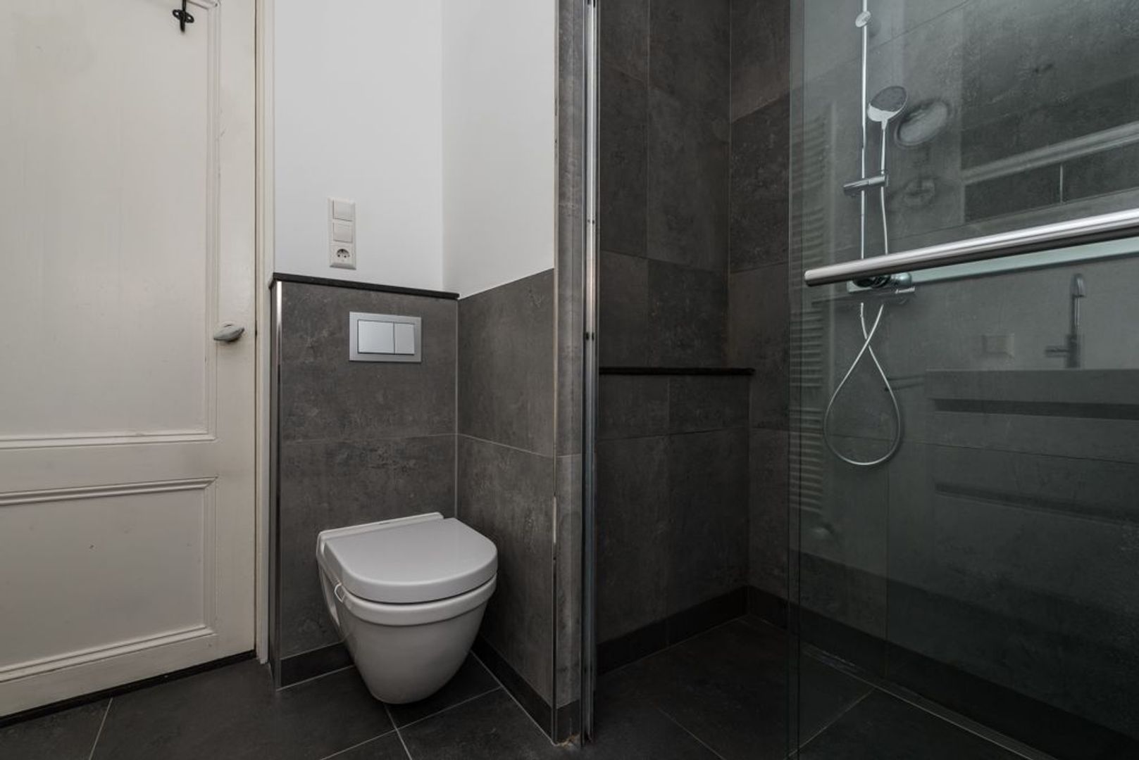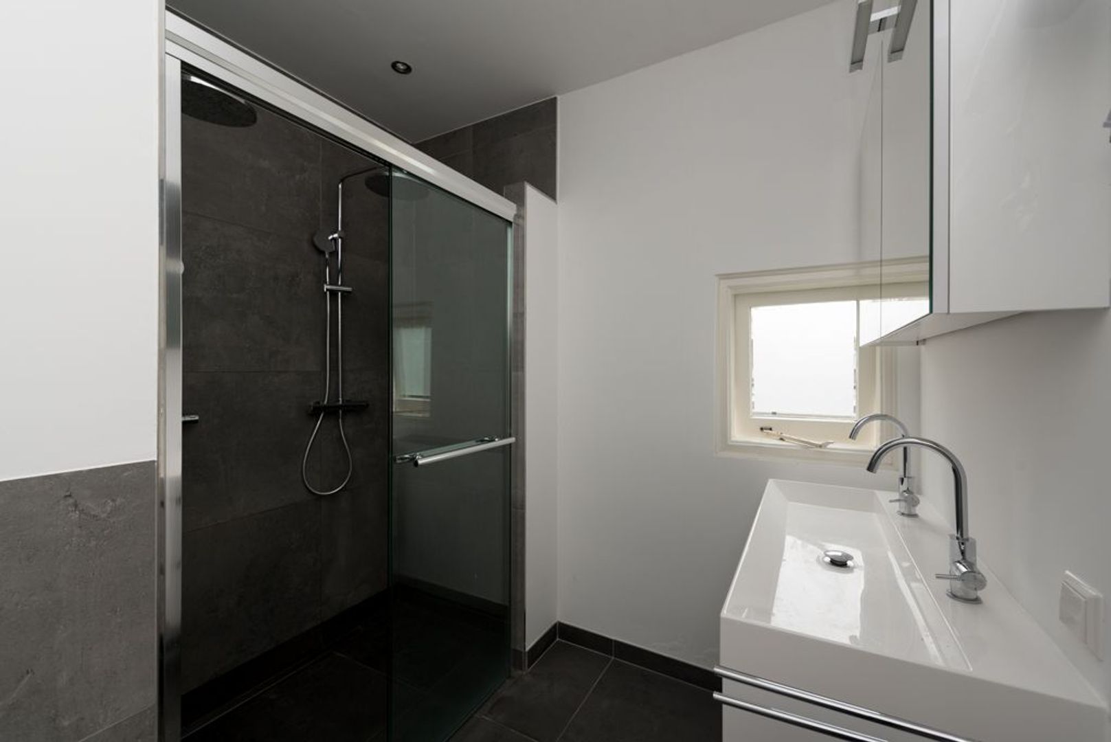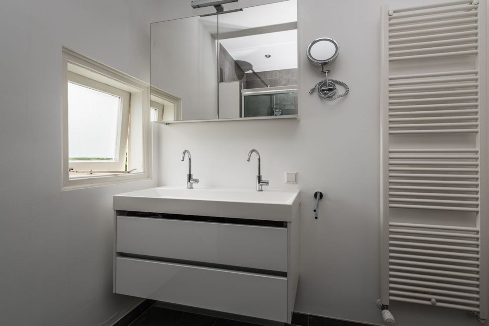 Eerste etage: overloop met toegang tot slaapkamer III (ca. 6.32x3.25) en de badkamer (ca. 2.38x2.25) met dubbele inloopdouche, dubbele wastafel in meubel met bovenkast, tweede toilet en design handdoekradiator.