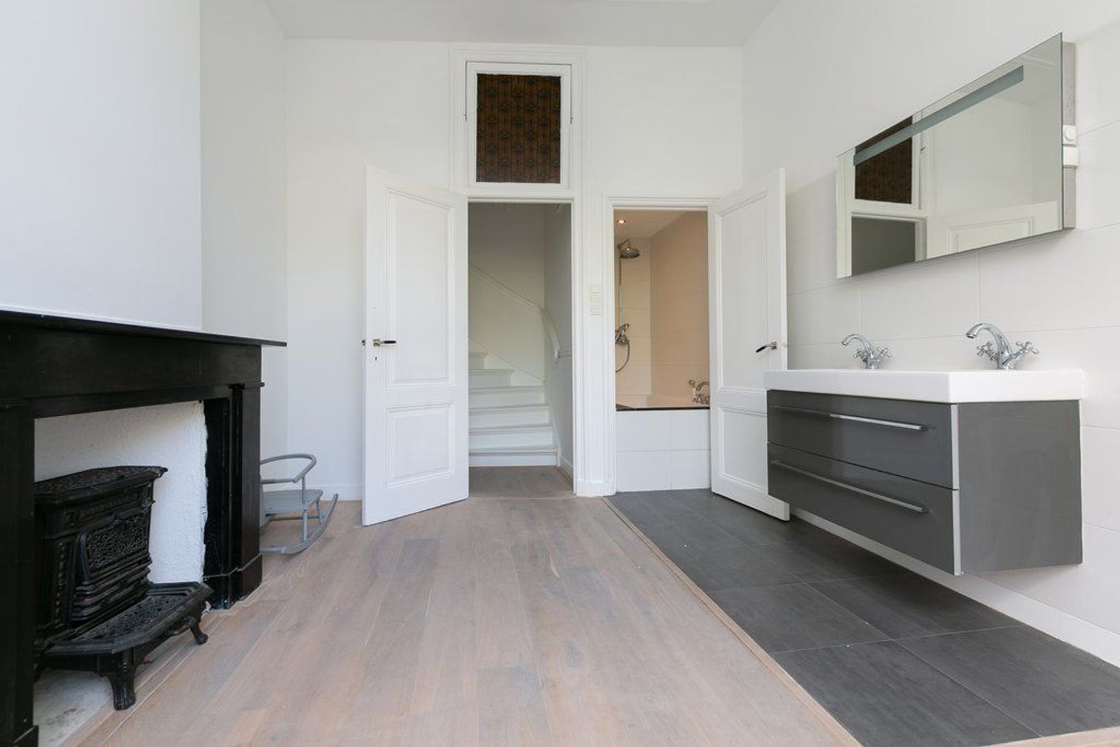 Stairs to the first floor, bedroom groundfloor, storage room, bedroom with en-suite bathroom with double washbasin and bath with shower. Beautiful French doors to the balcony.