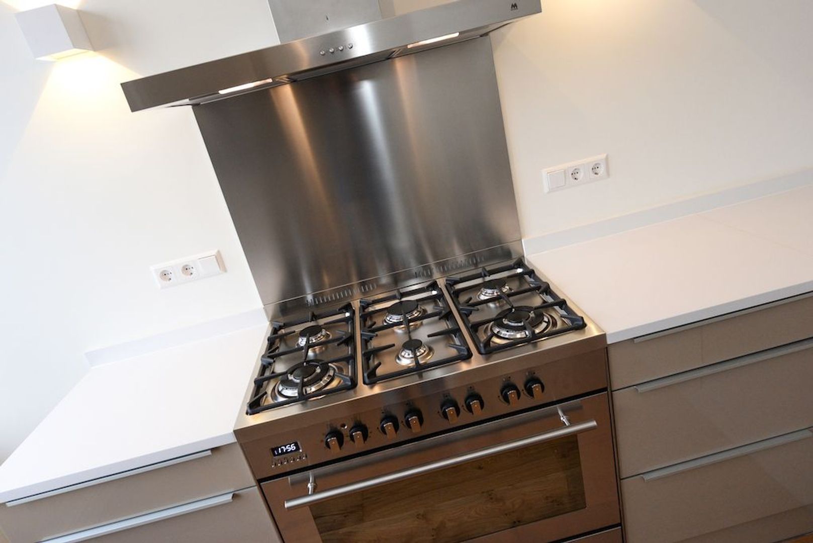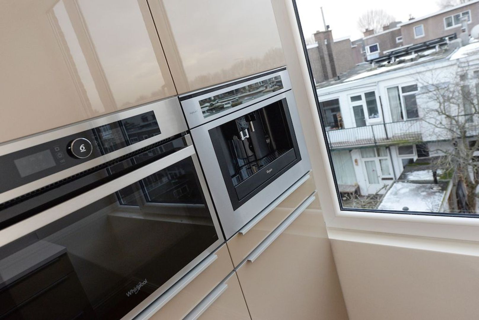 Indeling: entree via open portiek op 1e etage, royale overloop met mogelijkheid tot plaatsen meerdere fietsen en opstelplaats voor de uitgebreide meterkast installatie, trap naar 2e tevens top etage, royale hal met aangenaam lichtinval. Middels 2 hoge en geheel openslaande zwart stalen kozijnen met glas betreedt u de doorgebroken woon/eetkamer met aan de achterzijde de luxe in L-vorm opgestelde keuken welke in in populaire kleuren uitgevoerd, een stijlvolle combinatie van een wit (composiet) aanrechtblad en moccakleurige keukenkasten, links bevinden zich een tweetal hoge kasten, deze bestaan uit 2 bovenkasten, hieronder de combimagnetron/oven en koffiemachine (bonen), daaronder 2-handige uitschuifbare werkbladen en tenslotte daaronder de koelkast en de vriezer. Het in L-vorm opgestelde gedeelte bestaat uit een ladekast, het vrijstaande 90cm brede rvs-gasfornuis met grote oven en 6 kookpitten (M-System) alsmede afzuigkap en wederom een ladekast, aan het eind hiervan bevindt zich een breder gedeelte, het aanrechtblad is hier 90cm diep waardoor een bargedeelte ontstaan is. In dit gedeelte bevinden zich de carrouselkast, spoelkast en vaatwasmachine.