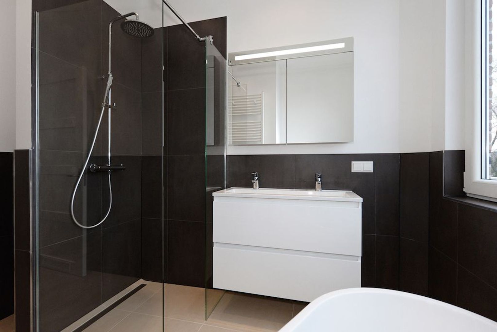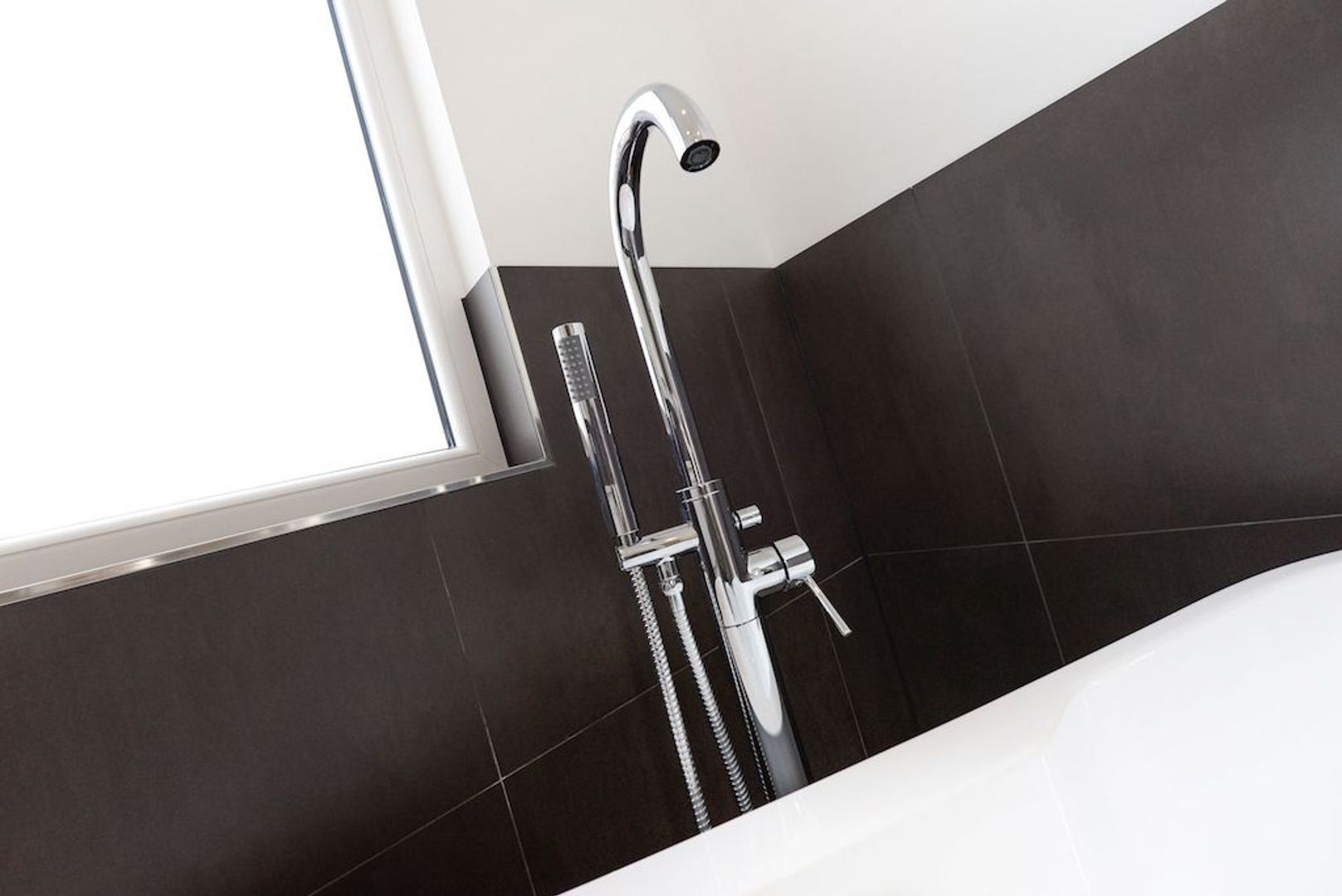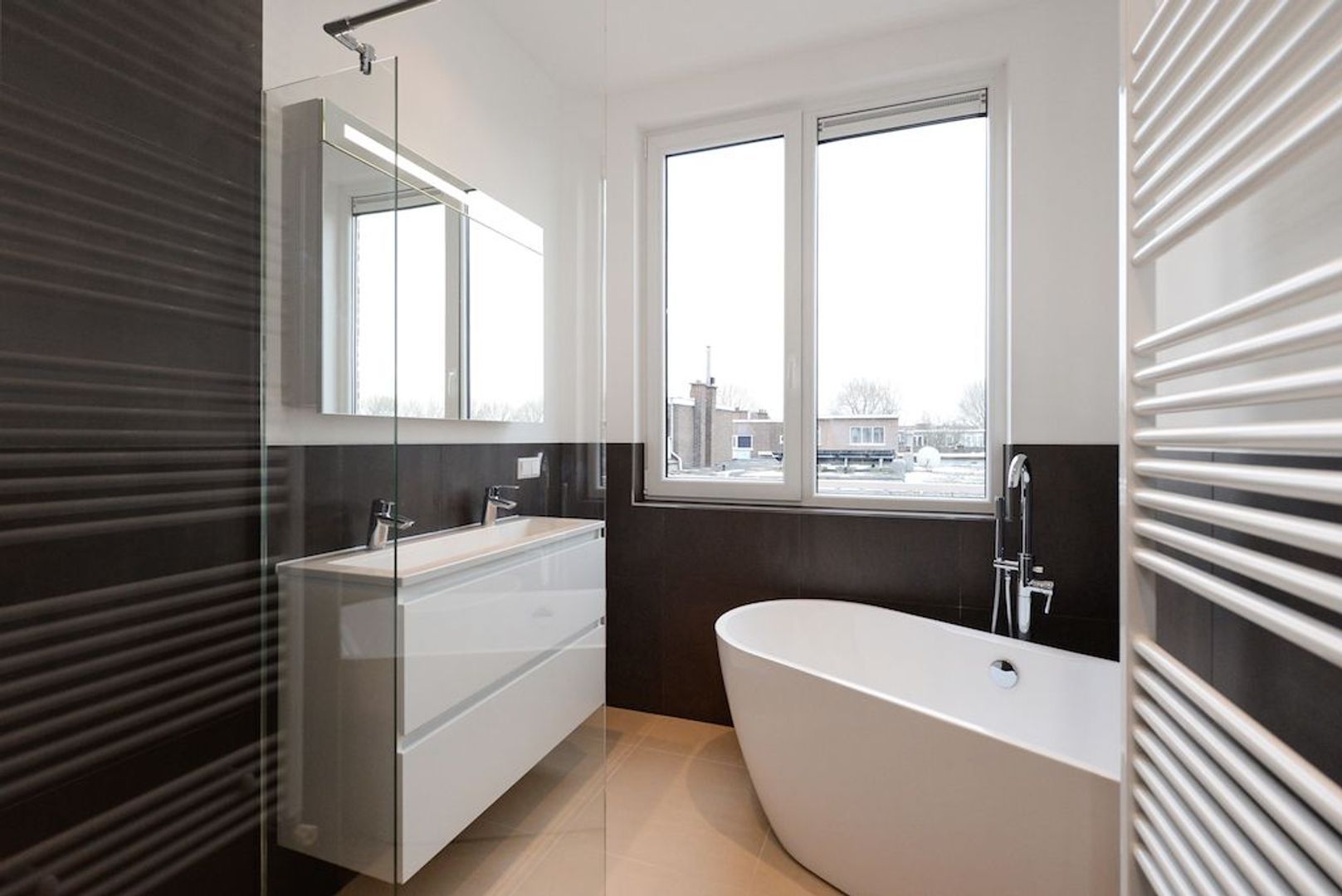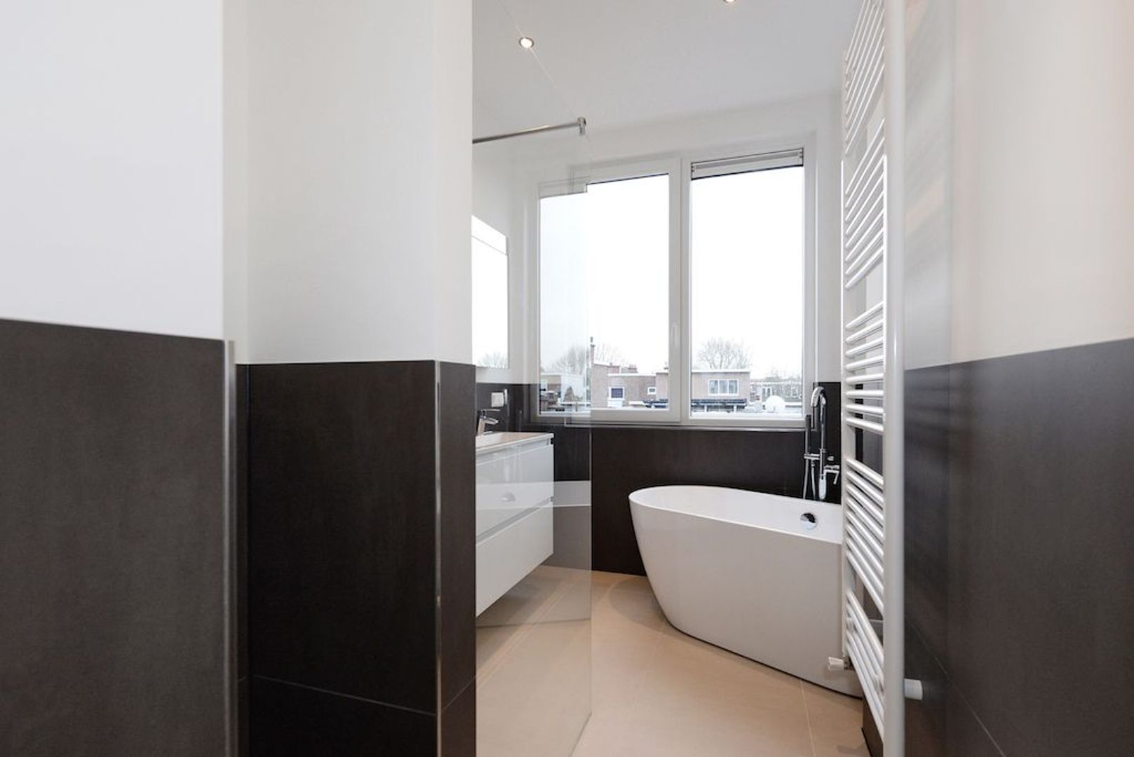Terug naar de hal, daar bevinden zich de toiletruimte met voornoemd trendy tegelwerk en een separate ruime kast alwaar zich de opstelplaats voor de wasmachine/droger en nieuwe cv-installatie bevindt. Aan de voorzijde bevinden zich een tweetal slaapkamers, de ruimste is op slimme wijze vergroot waardoor er ook hier een afmeting van een master bedroom is ontstaan 437x244, de andere slaapkamer is ook 437x244 (grotendeels, op achterliggende wasmachineruimte na). De hoofdslaapkamer bevindt zich aan de achterzijde 441x297 en heeft toegang tot het aan de achterzijde gelegen balkon (voorzien van bankirai). De luxe badkamer is ook aan de achterzijde gelegen en is voorzien van stijlvol tegelwerk 60x60 darkbrown wandtegels en 60x60 zandkleurige vloertegels, trendy combinatie. De badkamer is voorzien van een inloopdouche met easydrain, regen- en handdouche. Verder een vrijstaand ligbad met fraaie vrijstaande badkraan, modern wastafelmeubel met 2 kranen en spiegelkast, handdoekradiator en zelfs nog vloerverwarming.