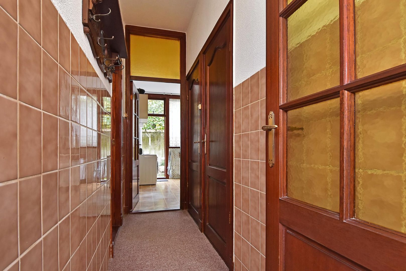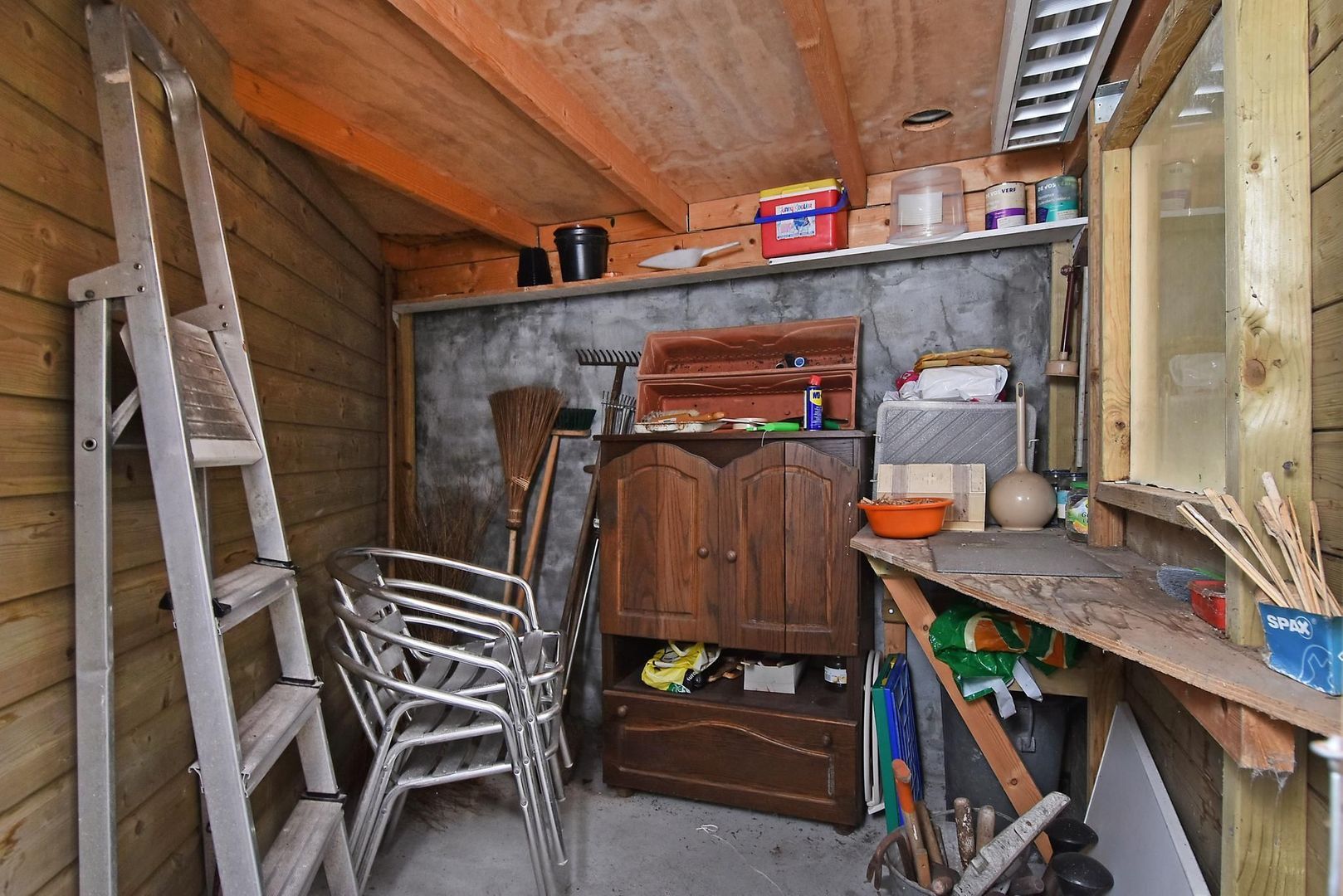 Indeling: entree, vestibule, gang met douche in trapkast, separaat toilet, toegang tot de woonkamer 1011 x 323 met twee vaste kasten en toegang tot de achtertuin. Voorslaapkamer 474x228 met ook hier 2 vaste kasten. Aan het eind van de voornoemde gang bevindt zich de eenvoudige keuken 360x190. De achtertuin is eveneens vanuit de keuken toegankelijk. De tuin ca. 430x790 is op het oosten gelegen en is voorzien van een houten schuur met elektra.
