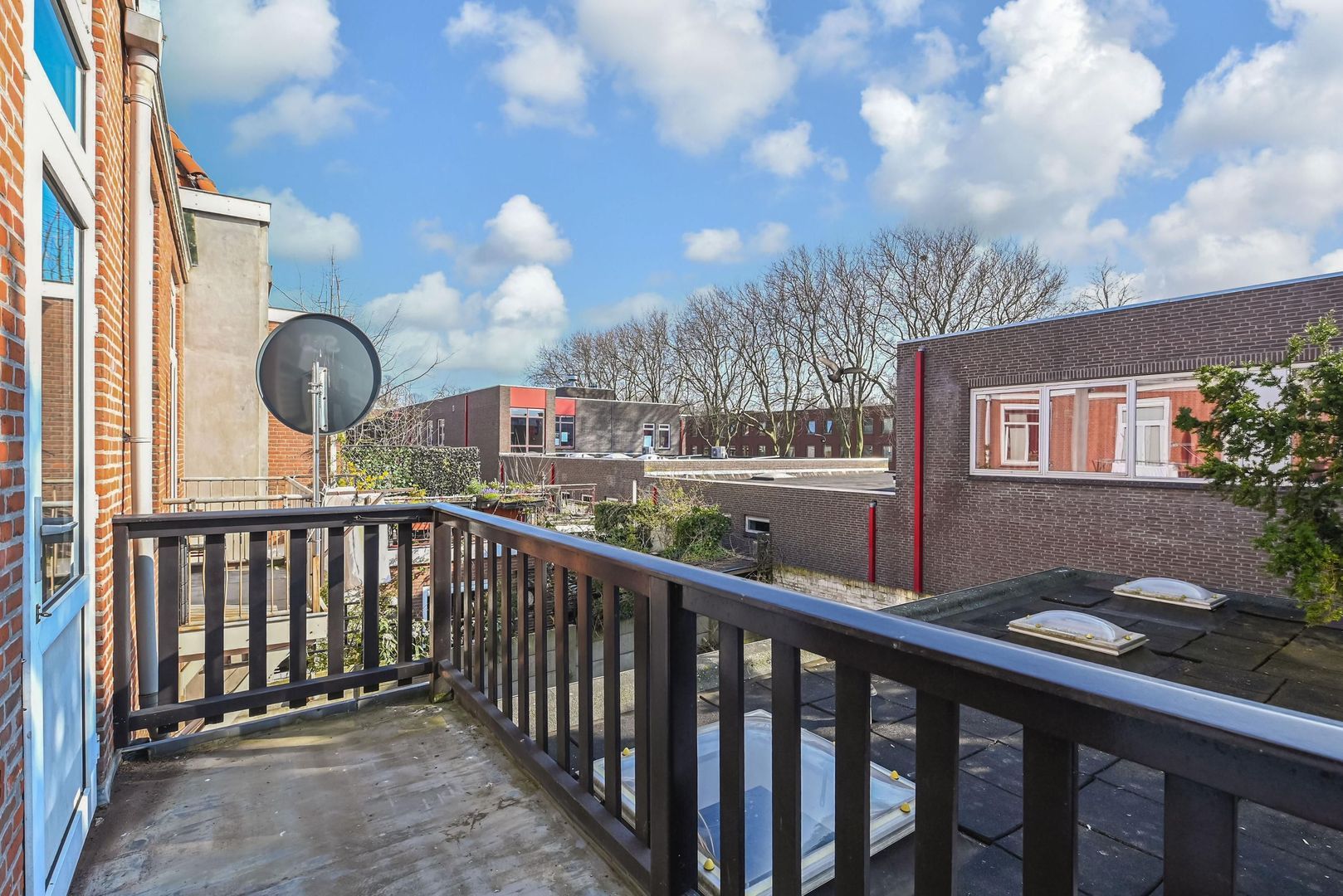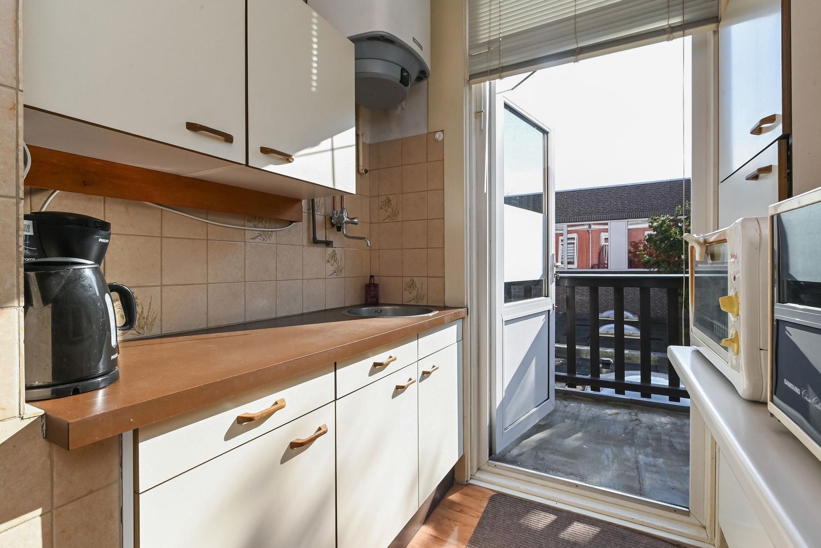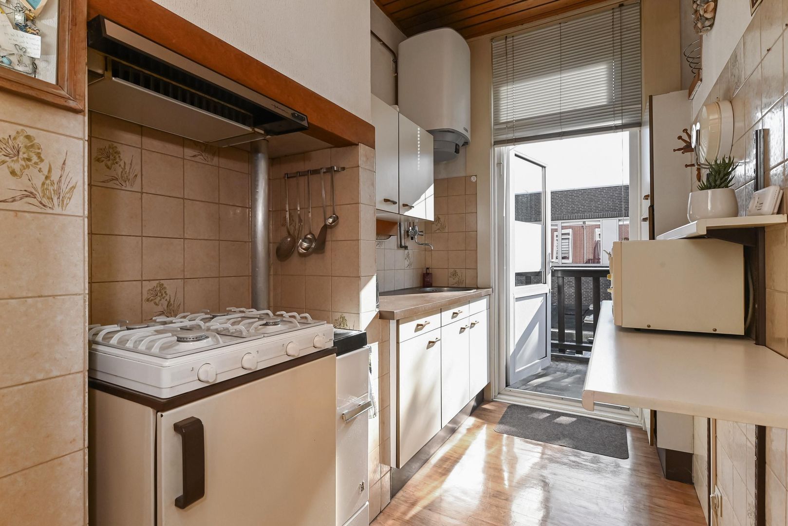 - entree met intercom, bredere overloop met opstelplaats voor fiets, trap naar 1e etage, gang, entree tot de doorgebroken woon/kamer en suite 997x330, eenvoudige keuken 298x215 aan de achterzijde gelegen met toegang tot het zeer zonnig gelegen (middag- en avondzon) achterbalkon 402x127.