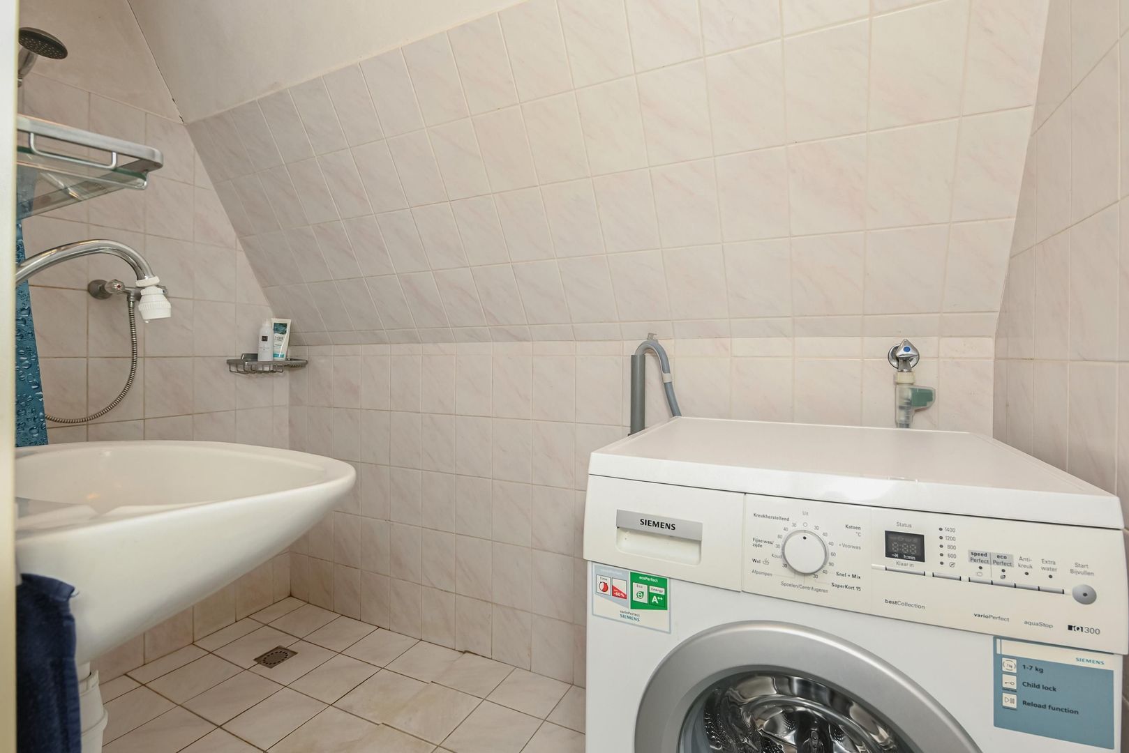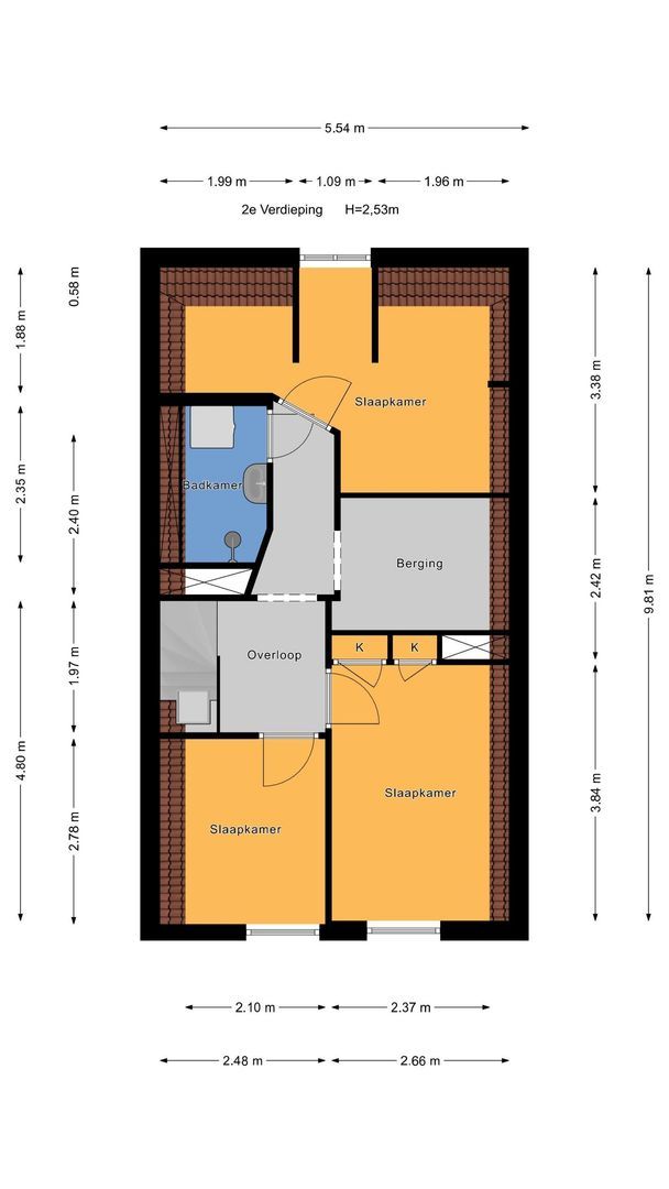 Trap naar 1e etage: met ruime overloop, 2 slaapkamers aan de voorzijde gelegen 384x266 met vaste kasten wand en 278x248. De 3e slaapkamer bevindt zich aan de achterzijde en is L-vormig en is gelegen over de volle breedte (338/188x554). Tussenliggende bergruimte waar met gemakt een goede en ruime badkamer gecreëerd kan worden 242x266. En als laatste de beknopte badkamer met douche, wastafel en aansluiting voor de wasmachine.