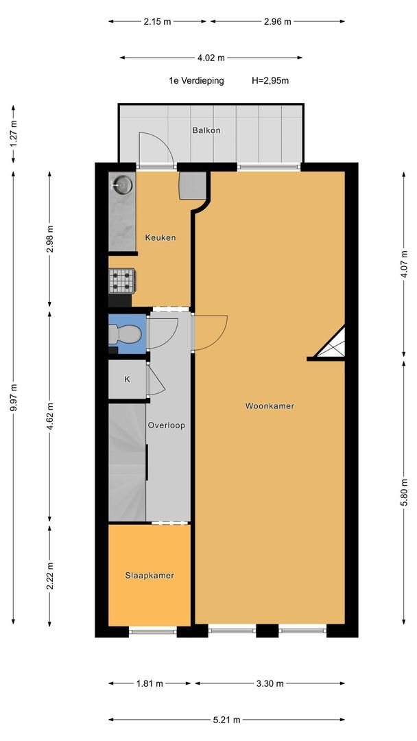 -Woonoppervlakte bedraagt 97m2 (BBMI), zie voor de indeling van de woning de plattegrond met maatvoering