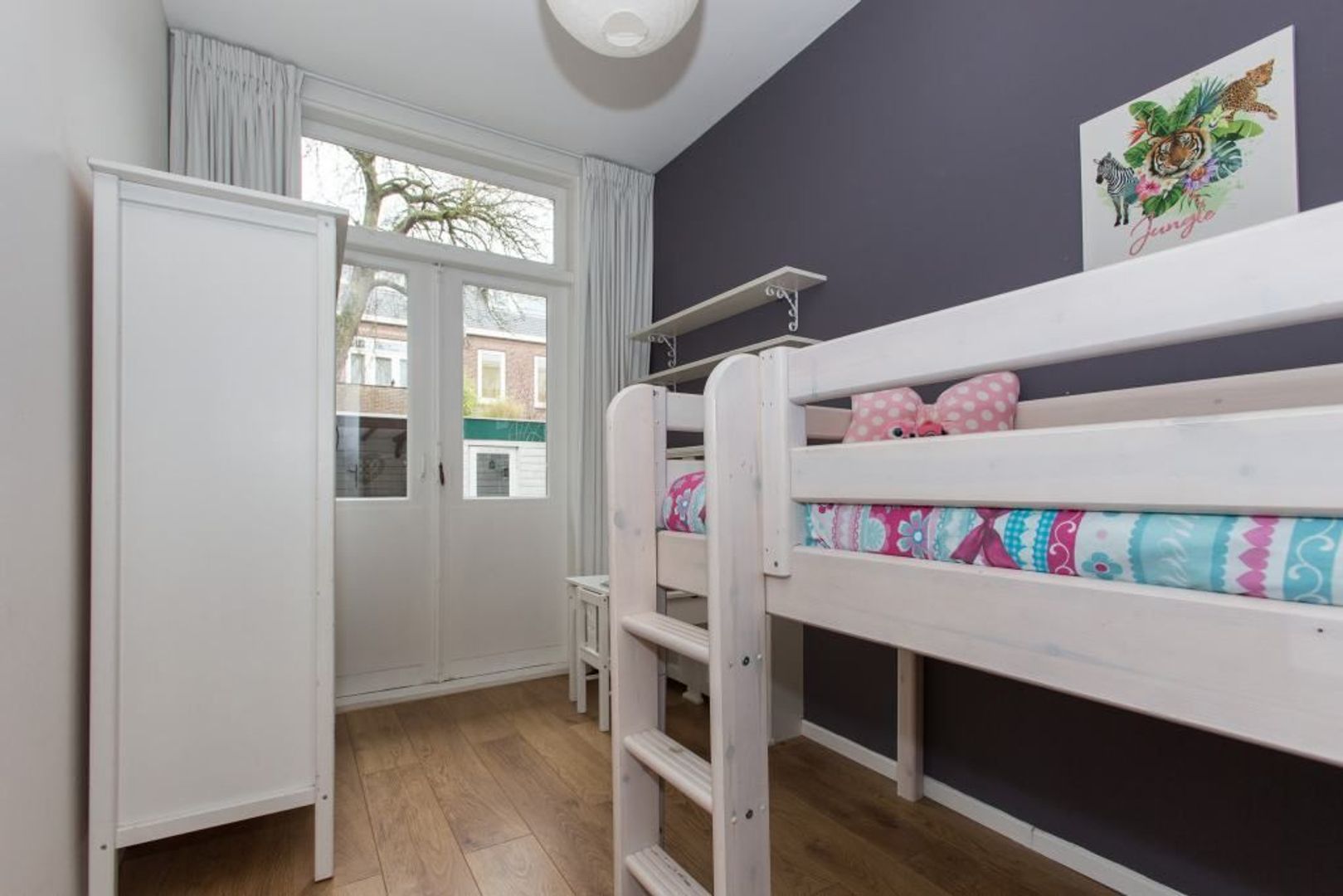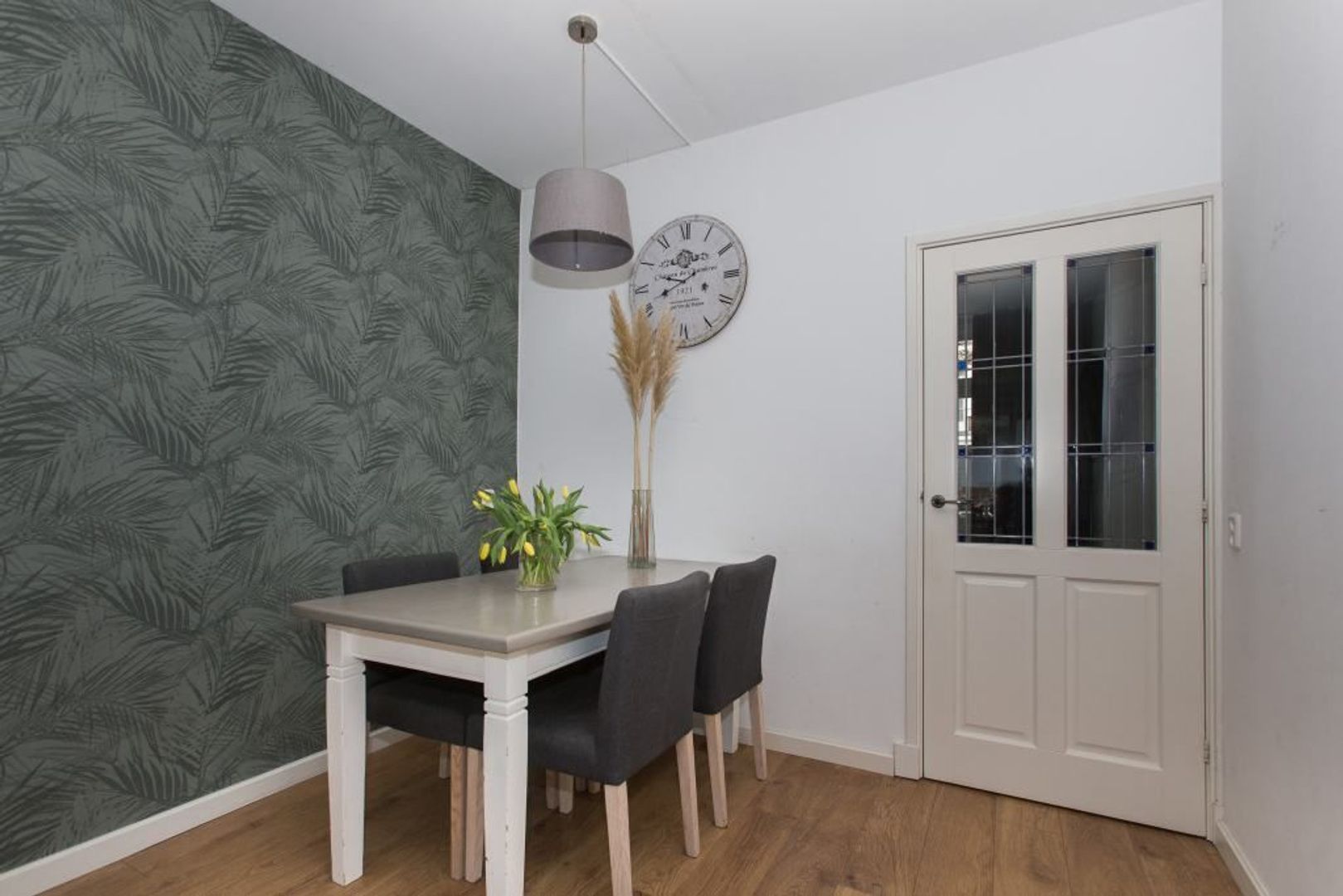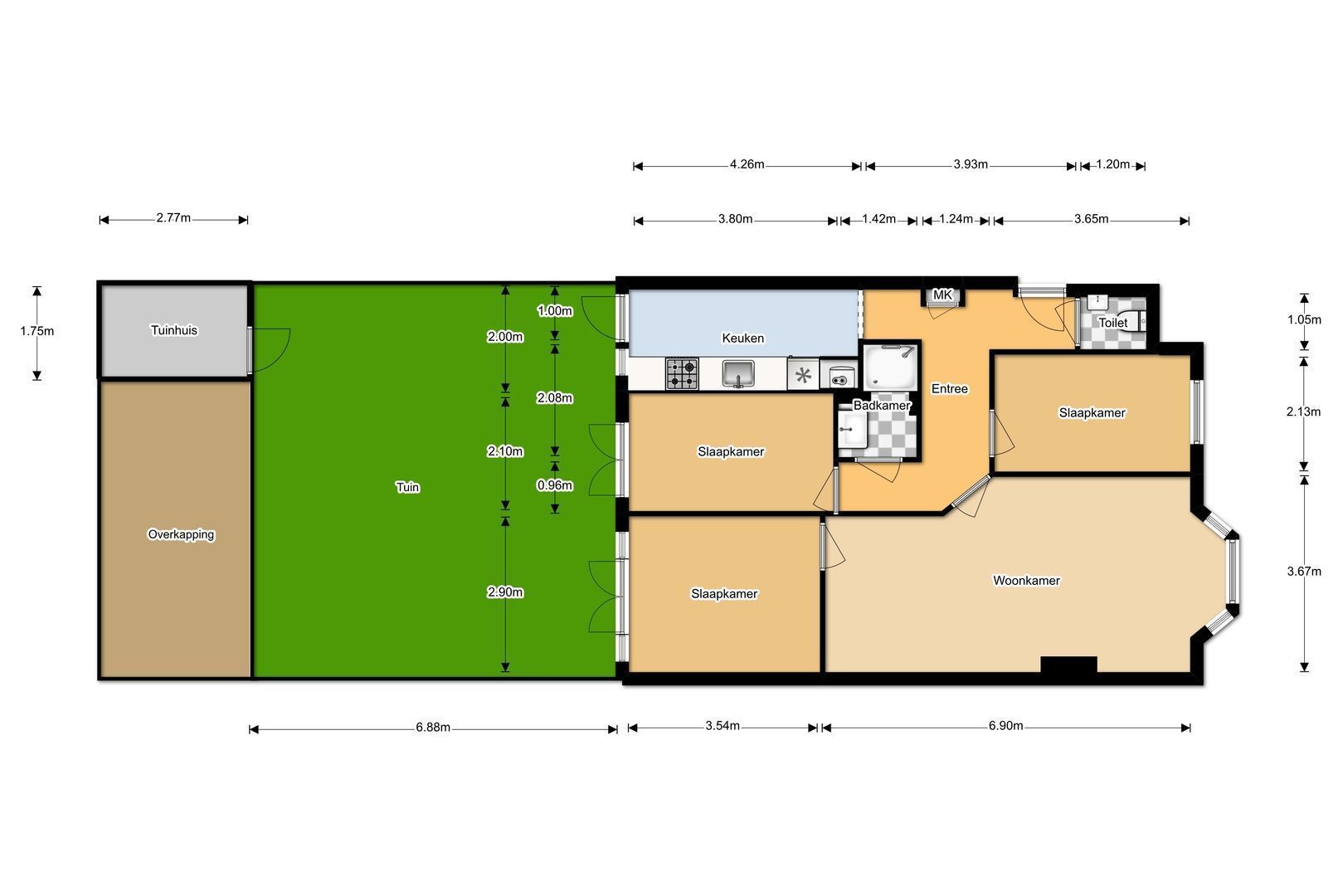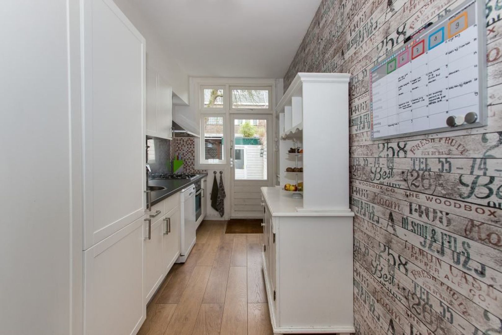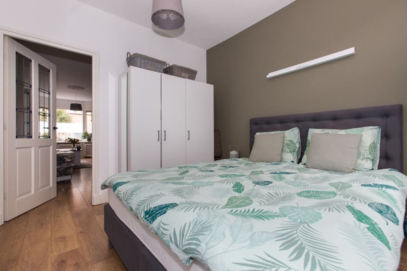 Indeling: ruime voortuin 620x380, entree, speelse u-vormige hal, meterkast, toegang tot de woonkamer 690x367 voorzien van een sfeervolle brede houten planken vloer, erker en radiatorombouwen. Ruime achterslaapkamer 354x290 met 2 openslaande deuren naar de riante achtertuin 975x729 welke zonnig is gelegen (ZO) en is voorzien van een fraaie veranda en berging. Terug naar vernoemde hal: Modern betegelde badkamer met inloopdouche en wastafelmeubel. Achterslaapkamer 380x210 met eveneens 2 openslaande deuren naar de achtertuin. Voorslaapkamer 365x213. Separaat modern betegeld toilet met vrijhangend reservoir en wasfontein. De moderne keuken 426x200 is aan de achterzijde gelegen en is uiteraard voorzien van de benodigde inbouwapparatuur zoals: 4 pits gasfornuis, afzuigkap, oven, koel/vriescombinatie, vaatwasmachine. De opstelplaats voor de wasmachine en droger is keurig netjes in een keukenkast weggewerkt, ook vanuit de keuken toegang tot de achtertuin.