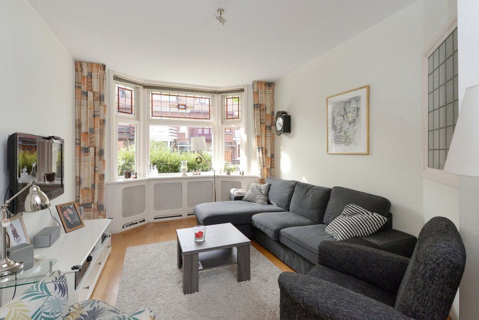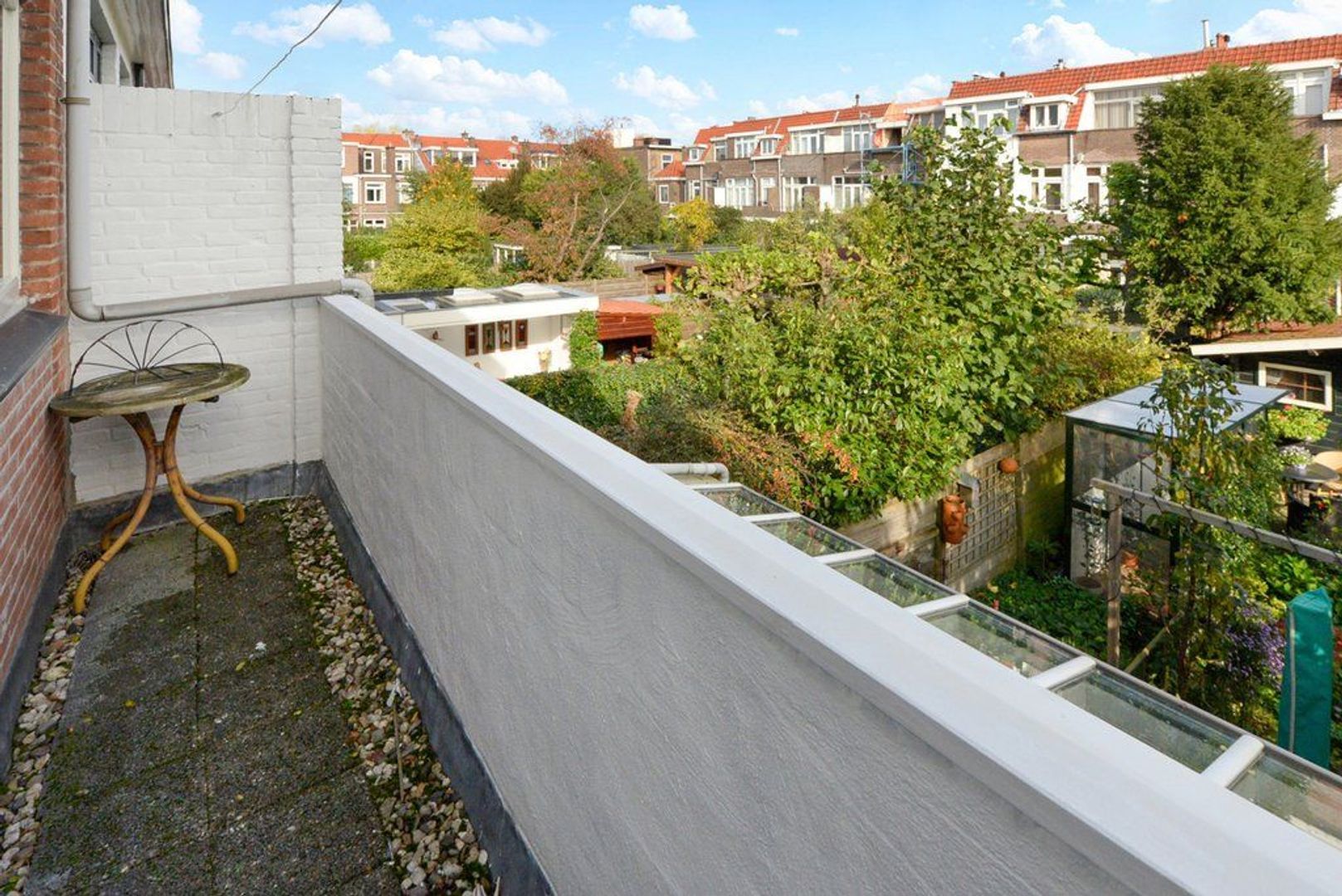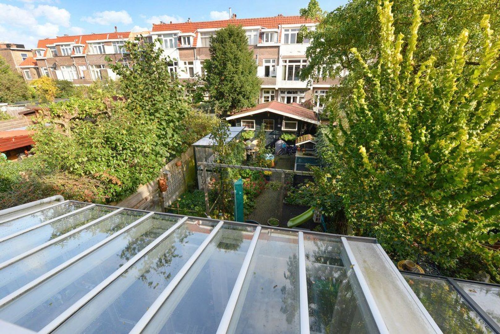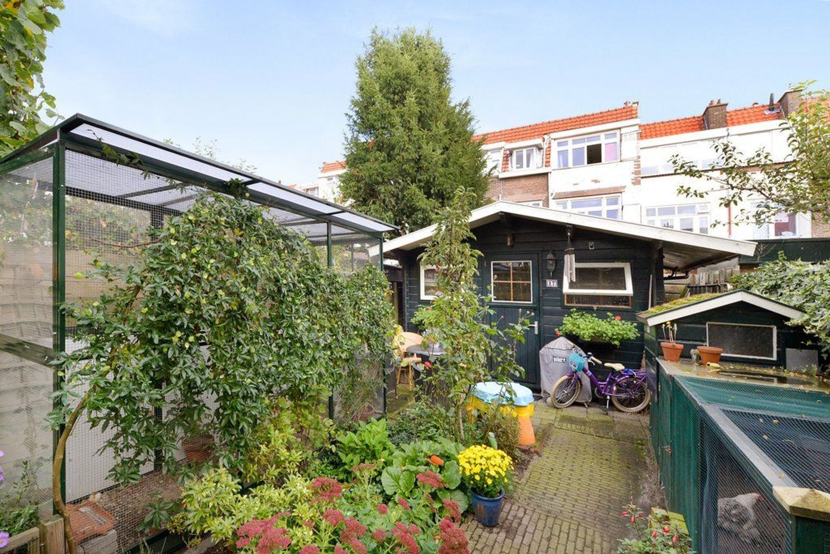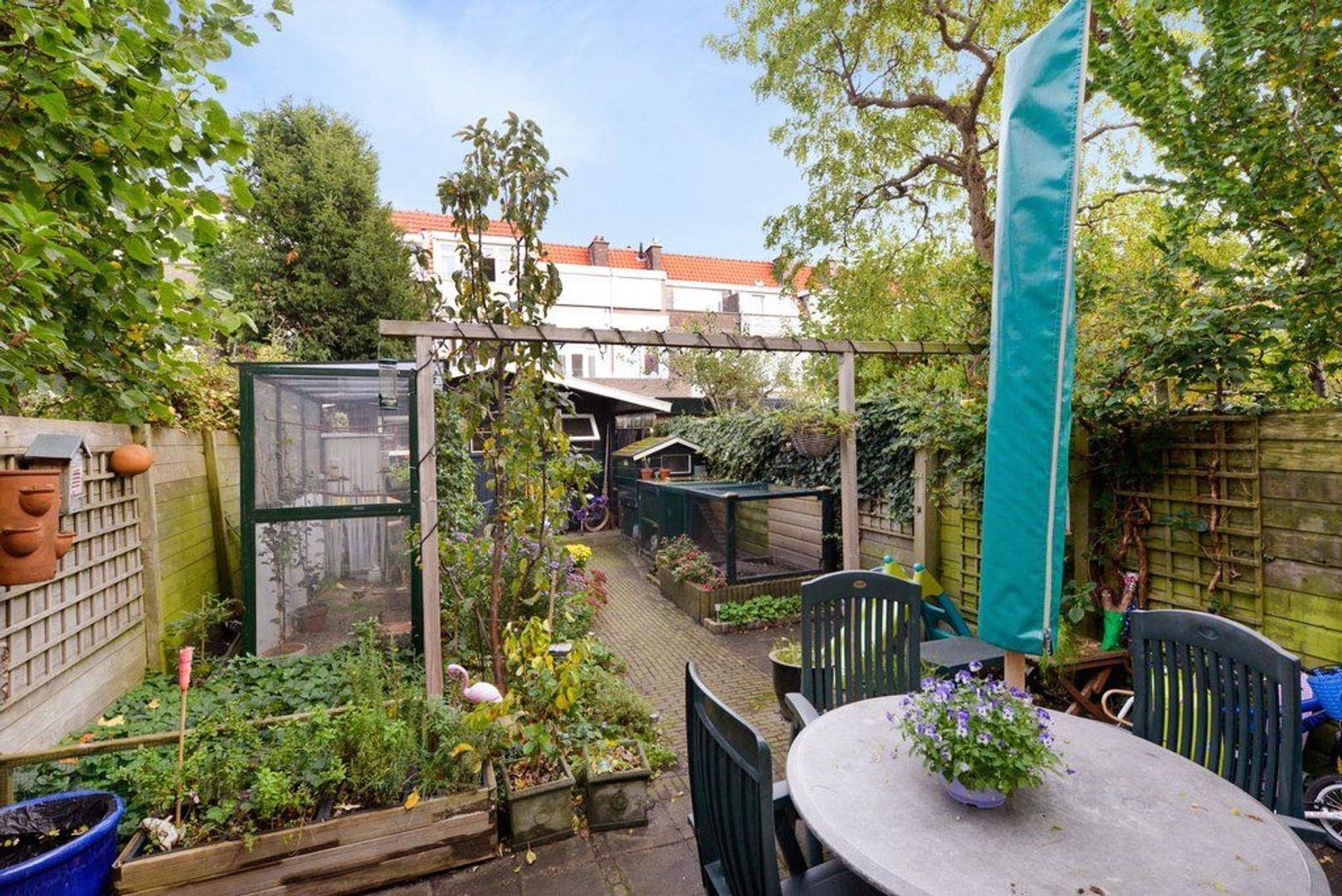 Vanwege de diepte van deze fraai aangelegde tuin 1346x518, met verschillende groene borders, kunt u extra lang van de zon genieten, achterin de tuin bevindt zich nog een royale vrijstaande houten schuur voorzien van elektra.