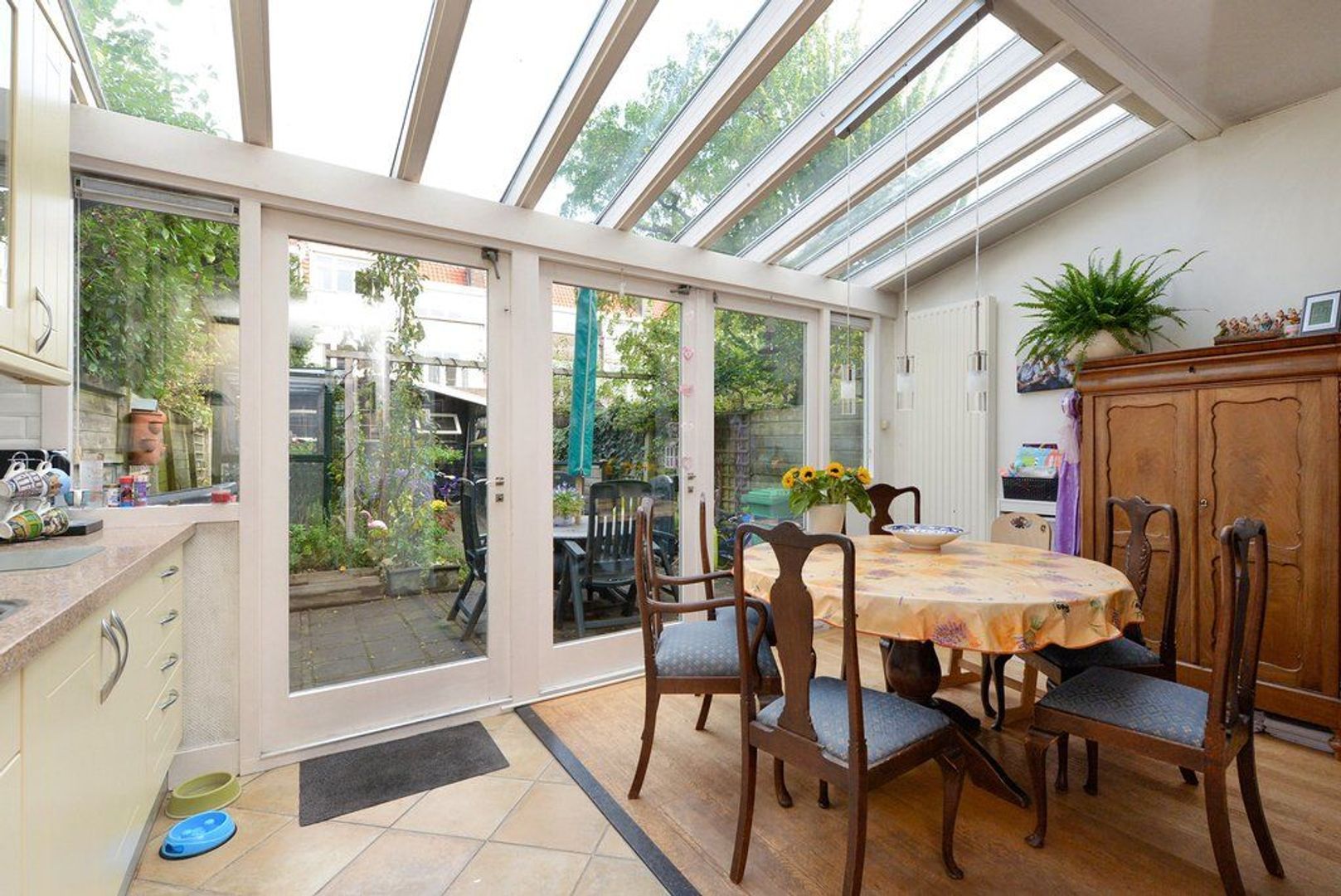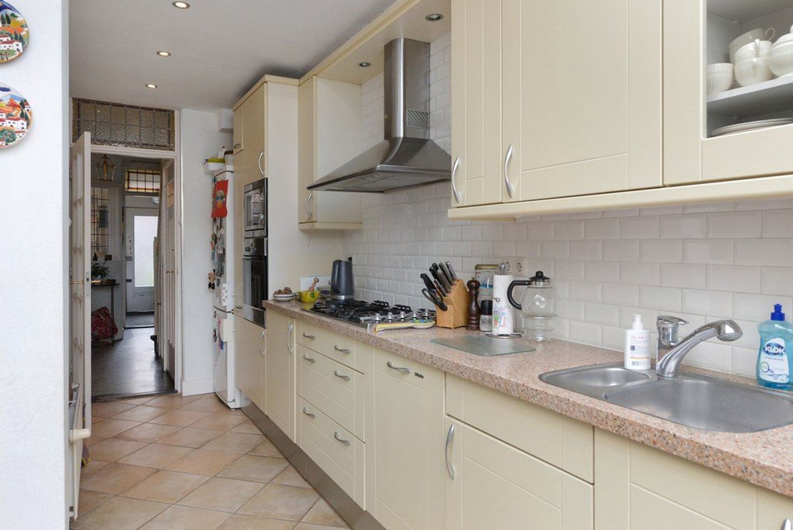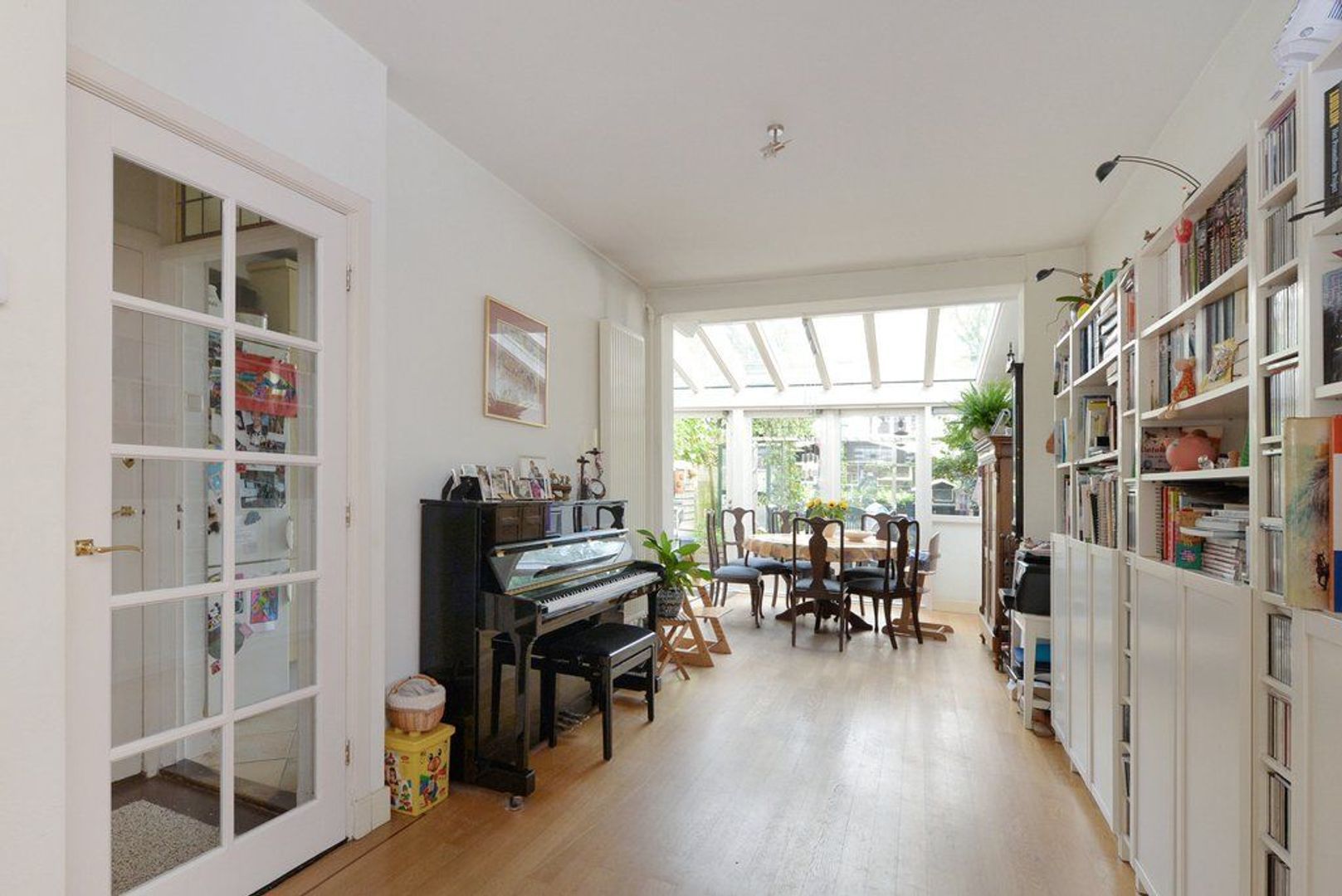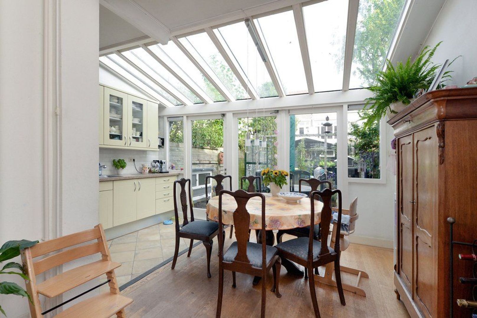 entree, vestibule, elektra installatie met 8 groepen en 2x aardlekschakelaar, fraaie en karakteristieke granitovloer, keurig en modern toilet met wasfontein, entree middels glas in roede deur tot de doorgebroken woon/eetkamer 1302x 345 deels 290, met parketvloer, aan de achterzijde bevindt zich over de volle breedte (4.83 meter) de uitbouw / serre, doordat deze aanbouw over de volle breedte gelegen is heeft de keuken een open karakter gekregen. De keuken is modern en voorzien van inbouwapparatuur zoals: 6 pitsgasfornuis, RVS afzuigkap, oven, magnetron en vaatwasmachine. Aanrechtblad is van natuursteen.