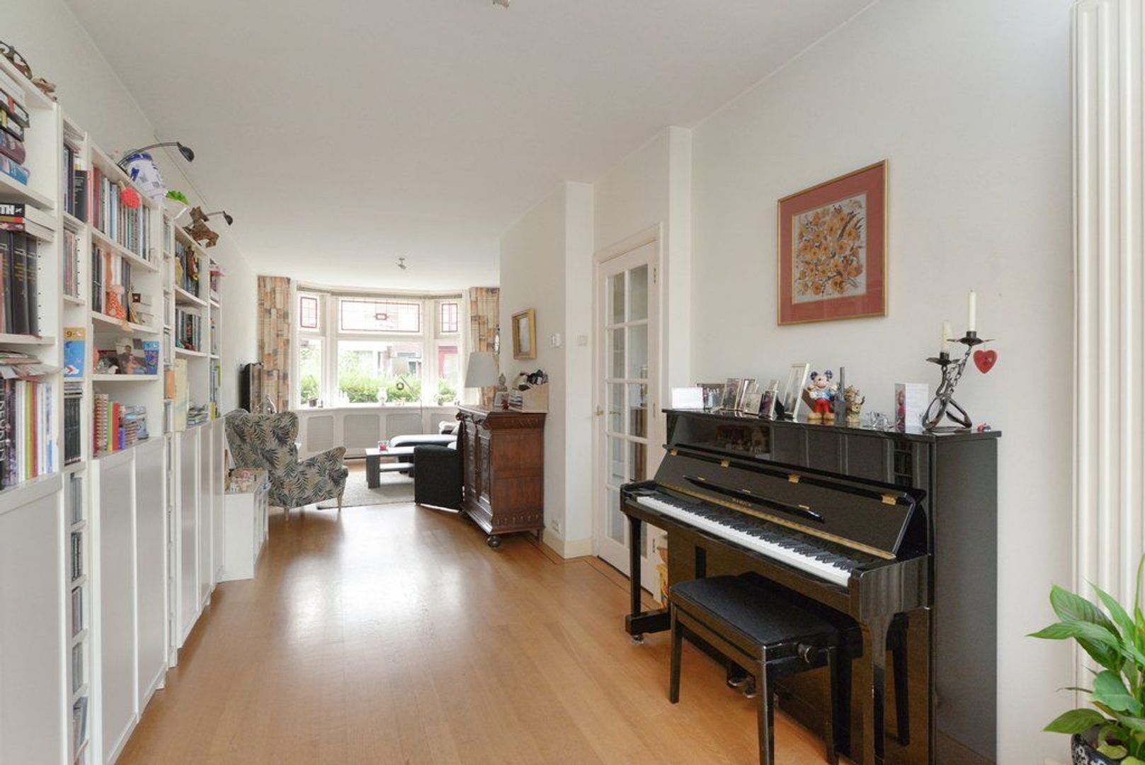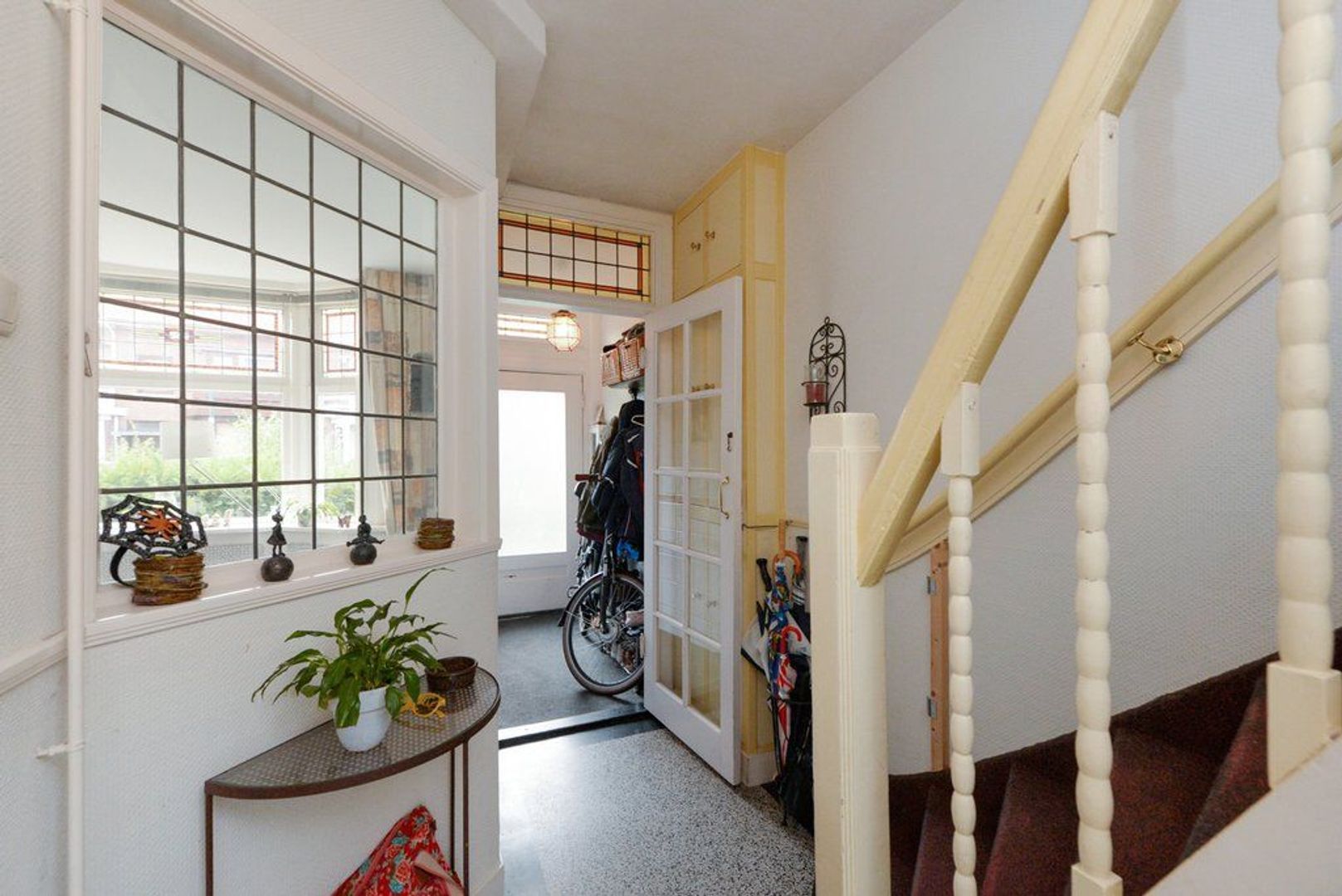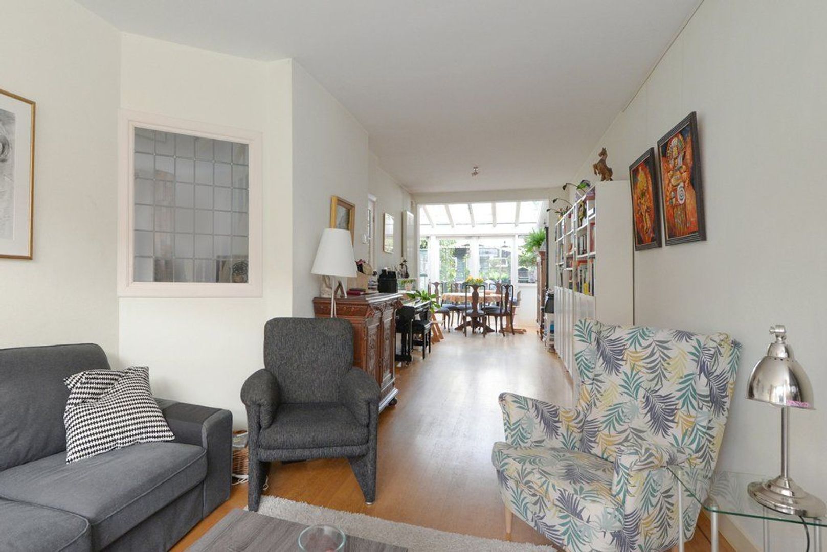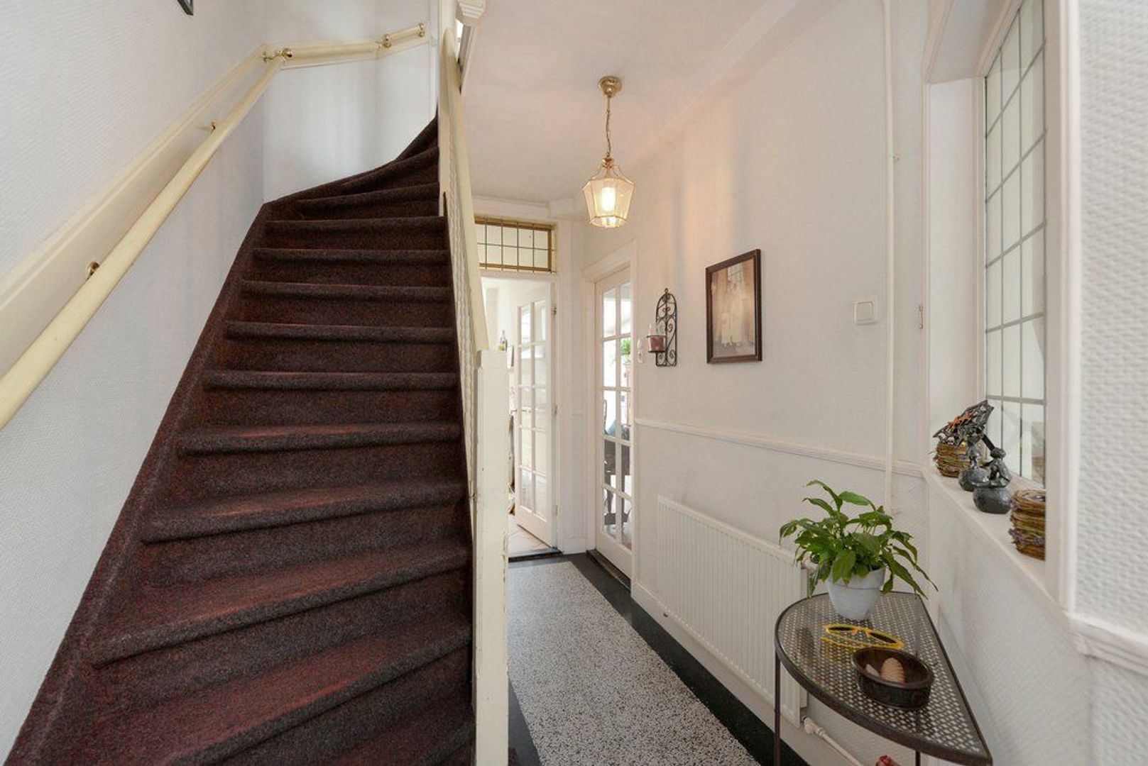entree, vestibule, elektra installatie met 8 groepen en 2x aardlekschakelaar, fraaie en karakteristieke granitovloer, keurig en modern toilet met wasfontein, entree middels glas in roede deur tot de doorgebroken woon/eetkamer 1302x 345 deels 290, met parketvloer, aan de achterzijde bevindt zich over de volle breedte (4.83 meter) de uitbouw / serre, doordat deze aanbouw over de volle breedte gelegen is heeft de keuken een open karakter gekregen. De keuken is modern en voorzien van inbouwapparatuur zoals: 6 pitsgasfornuis, RVS afzuigkap, oven, magnetron en vaatwasmachine. Aanrechtblad is van natuursteen.