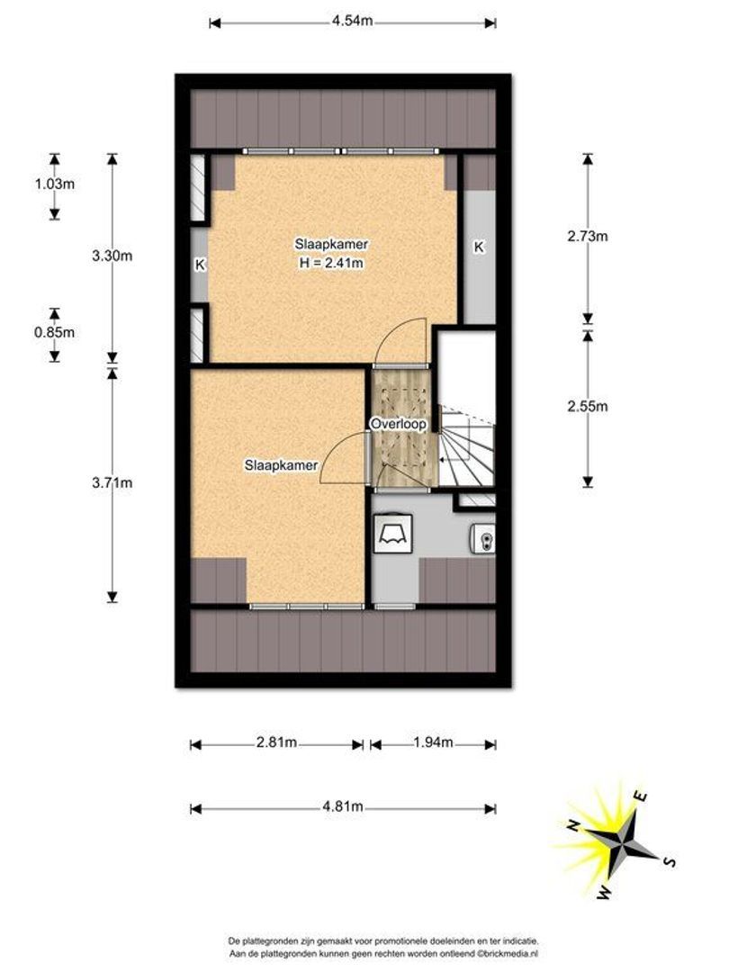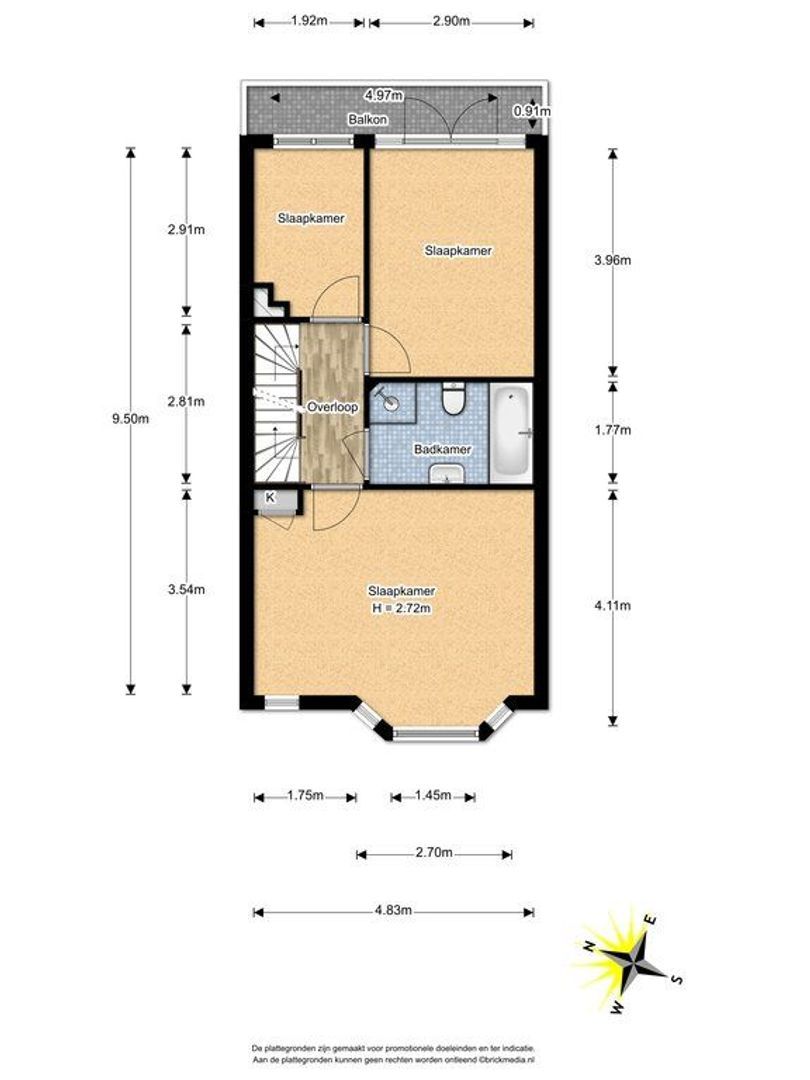 Trap naar 1e etage, overloop, op deze verdieping bevindt zich een drietal slaapkamers. De 2 aan de achterzijde gelegen meten: 291x192 en 396x290, laatste genoemde kamer heeft toegang tot het balkon. De hoofdslaapkamer bevindt zich aan de voorzijde en is over de volle breedte gelegen 411x483. Tussen de slaapkamers in bevindt zich de keurige en moderne badkamer 177x290 welke is voorzien van een wastafelmeubel, hoek douchecabine, ligbad en 2e toilet.