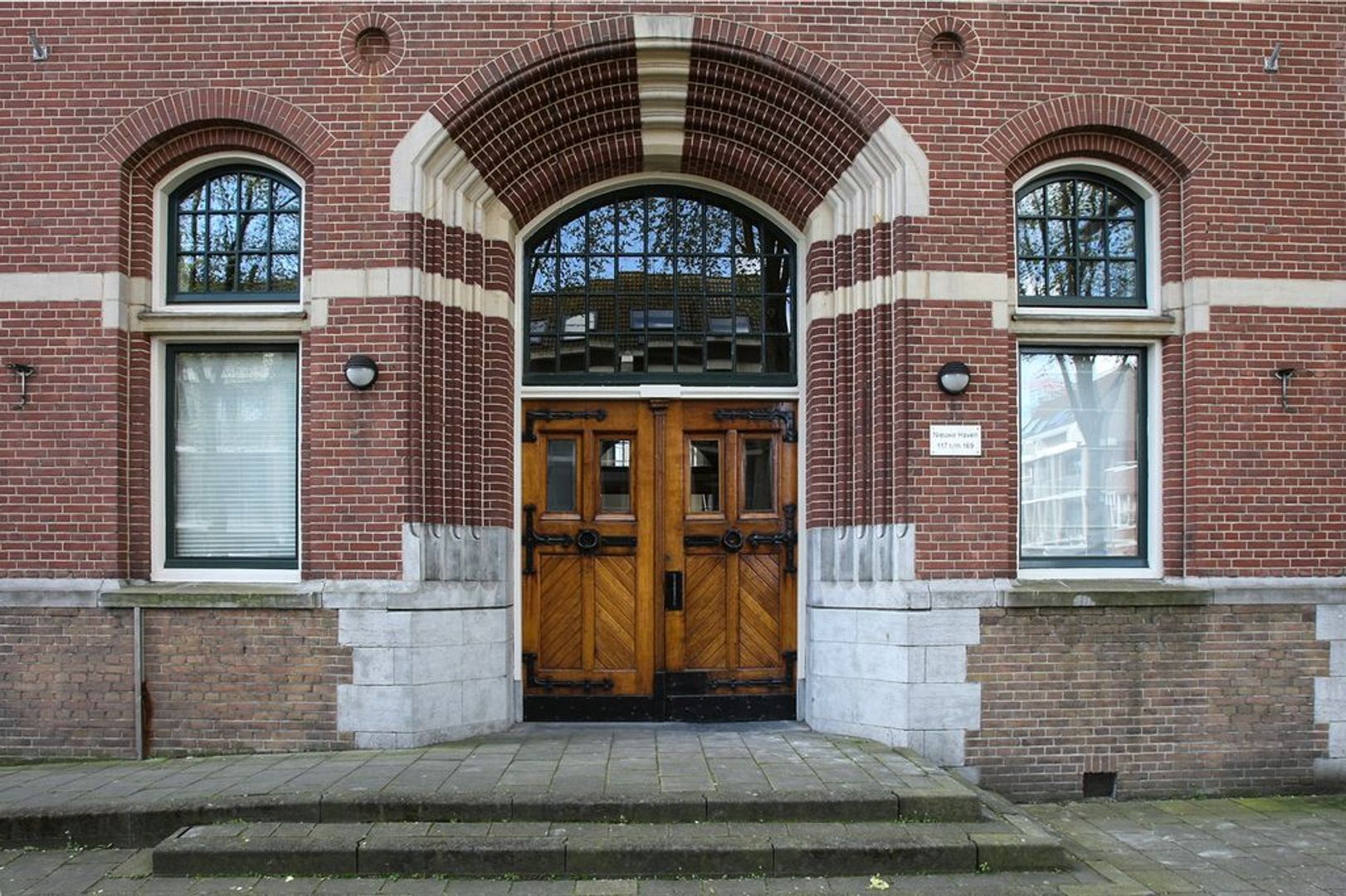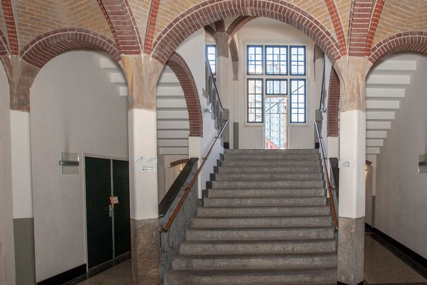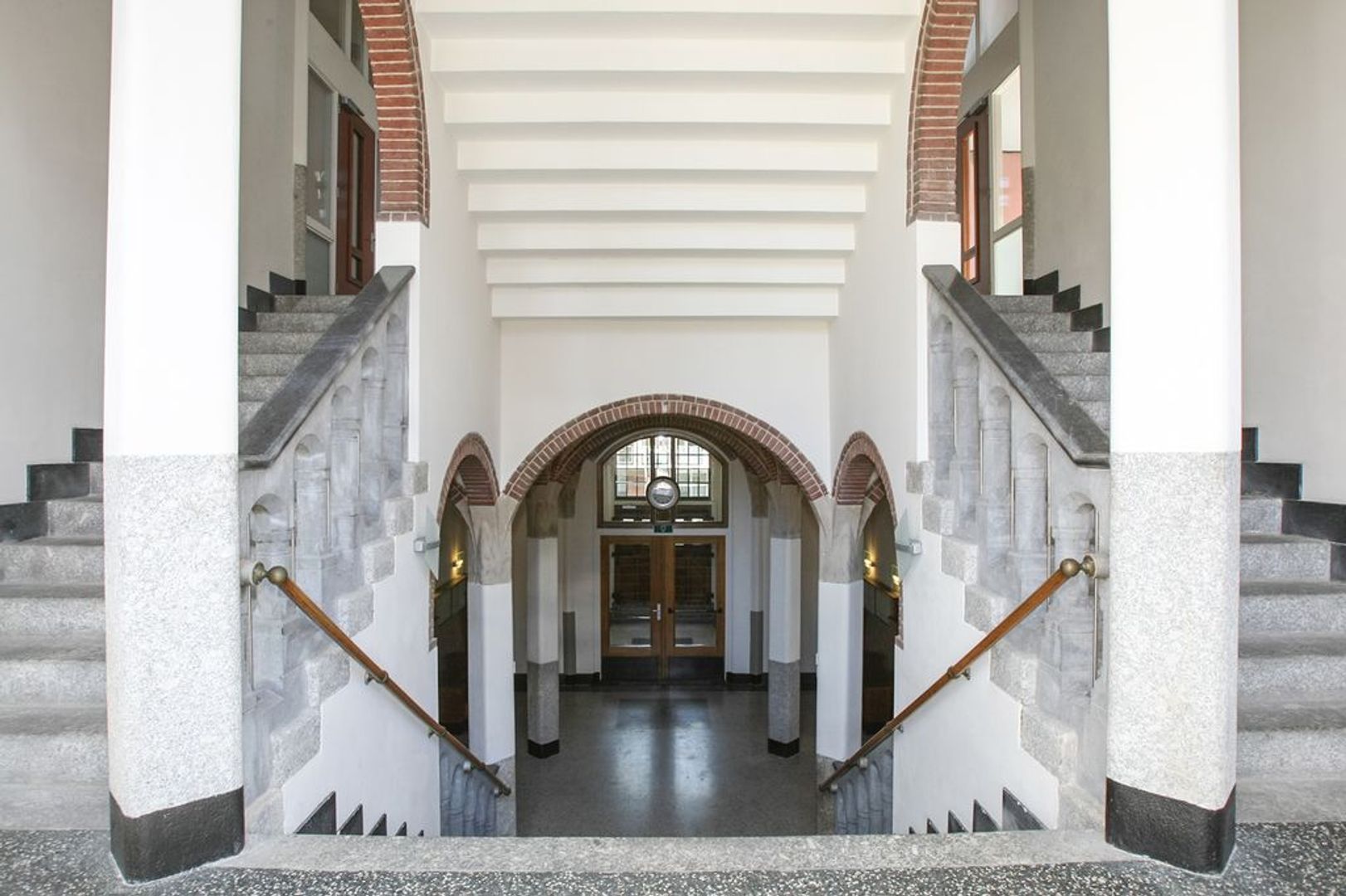 Hoofdentree (trap- en/of liftopgang) via afgesloten gezamenlijke hal van de voormalige Ambachtsschool met daarachter een hof met een goed onderhouden binnentuin met middag- en avondzon.