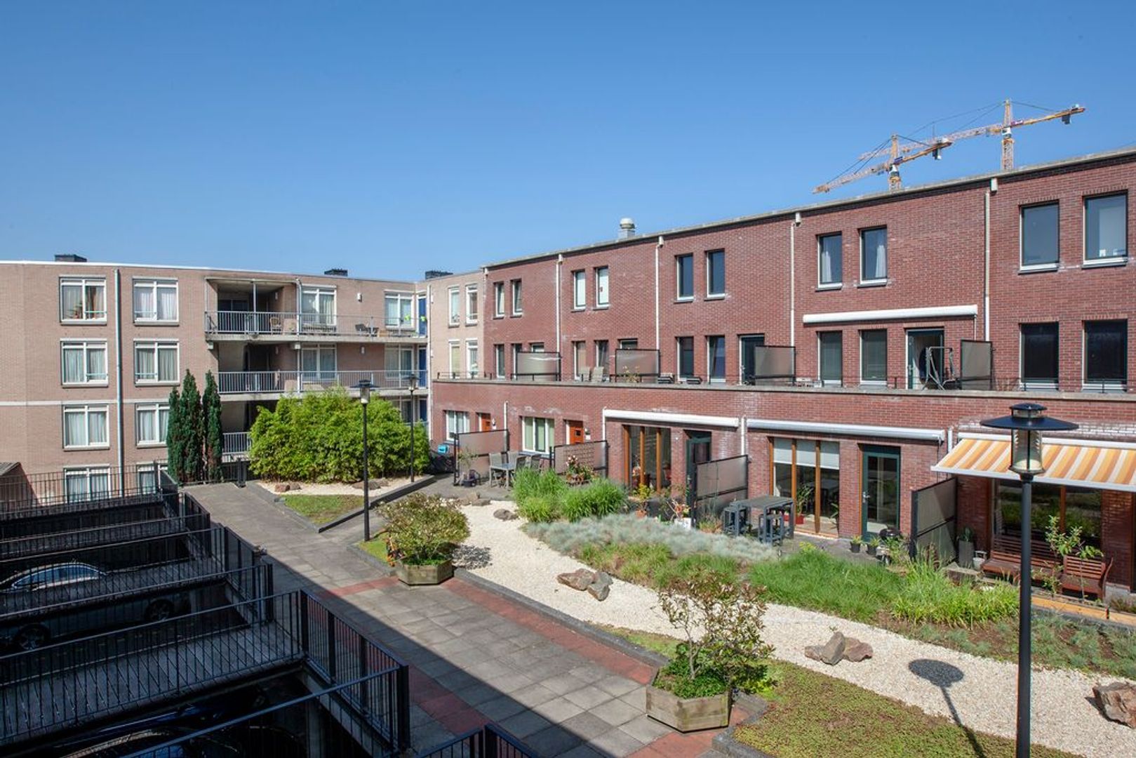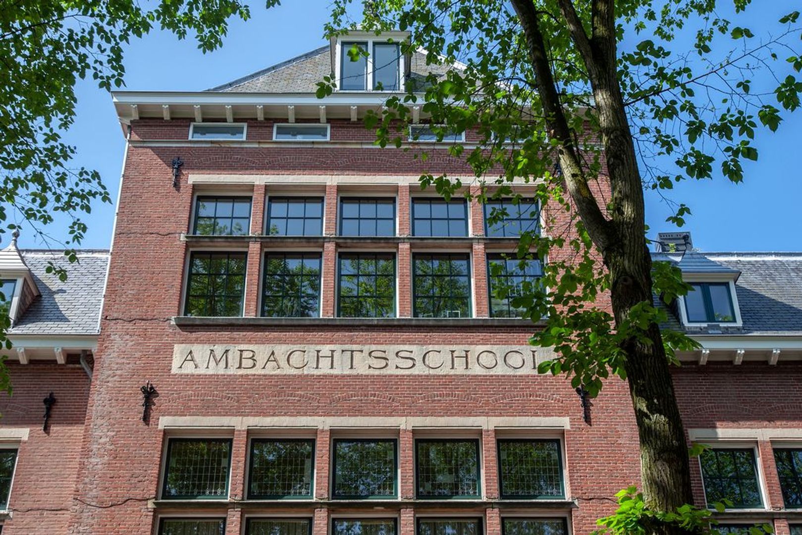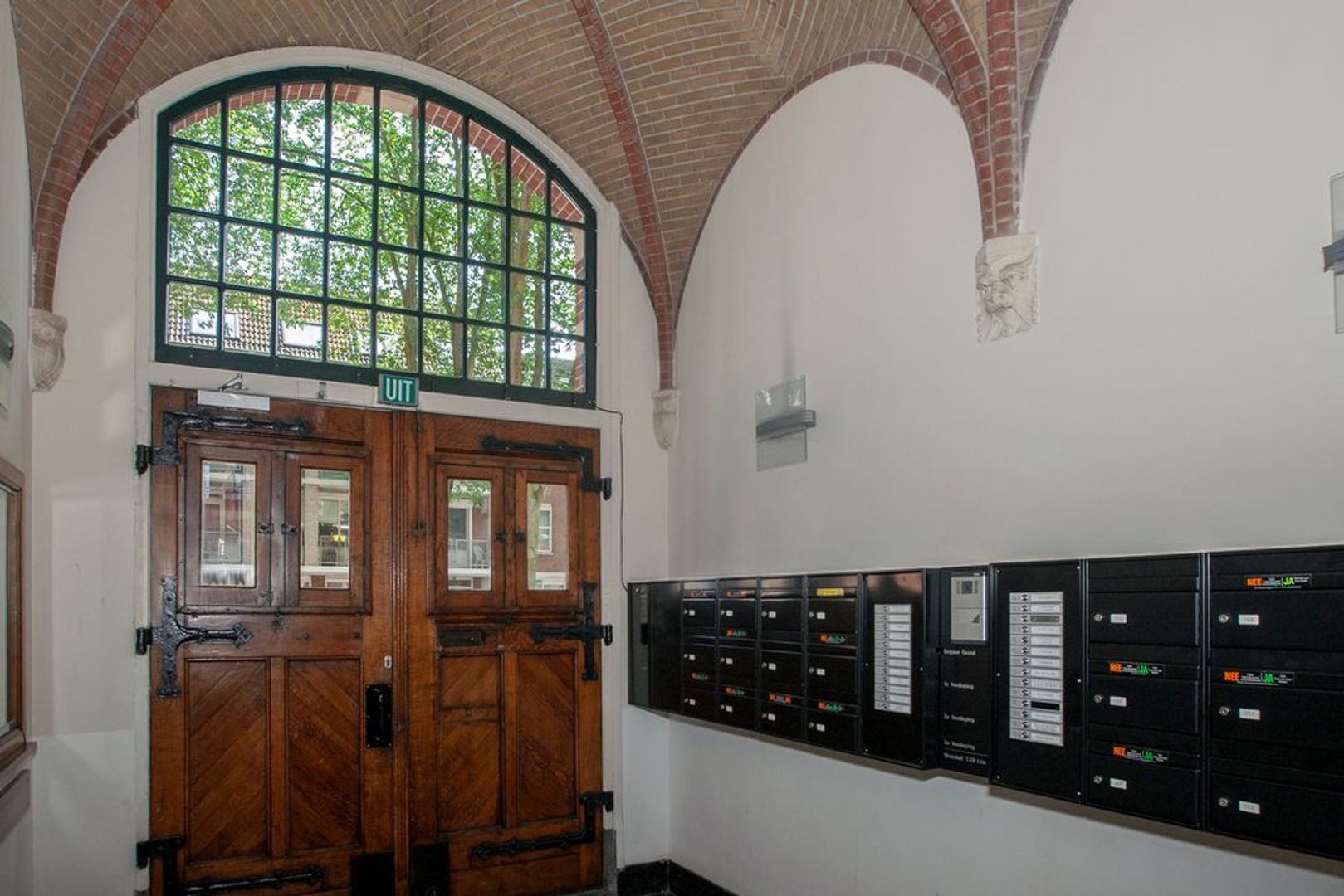 Hoofdentree (trap- en/of liftopgang) via afgesloten gezamenlijke hal van de voormalige Ambachtsschool met daarachter een hof met een goed onderhouden binnentuin met middag- en avondzon.