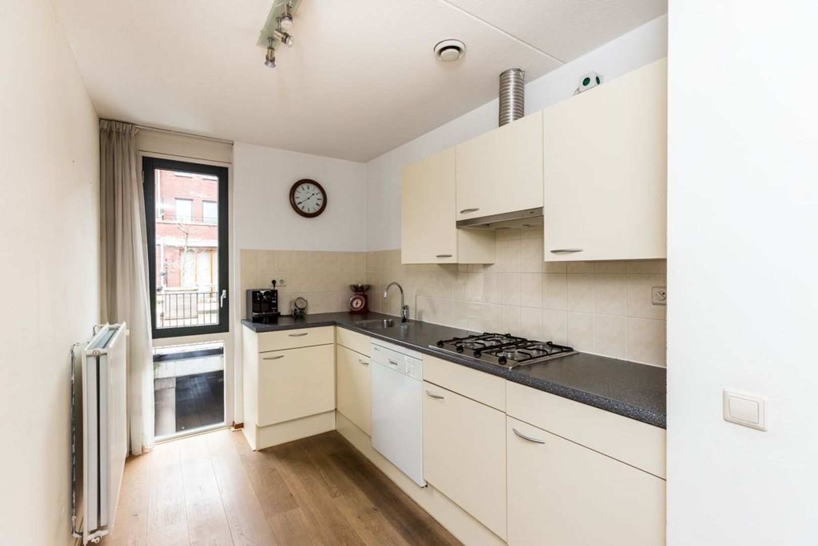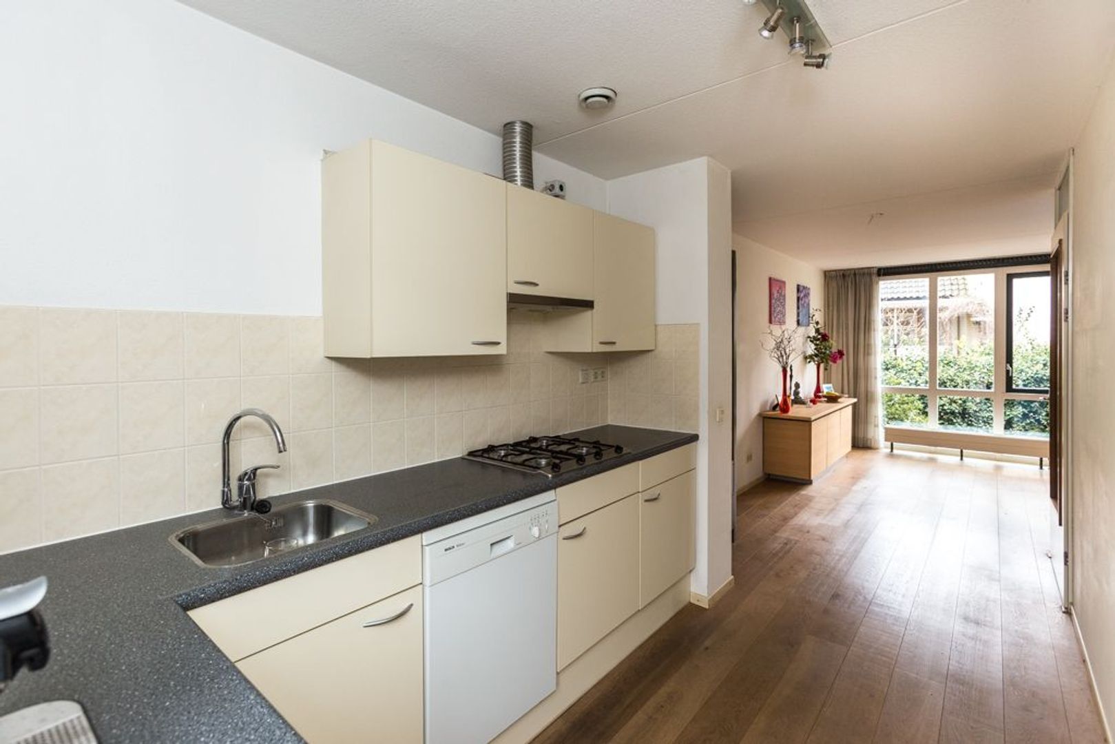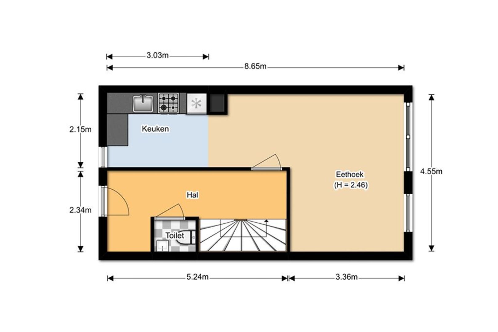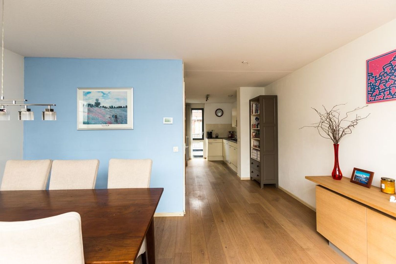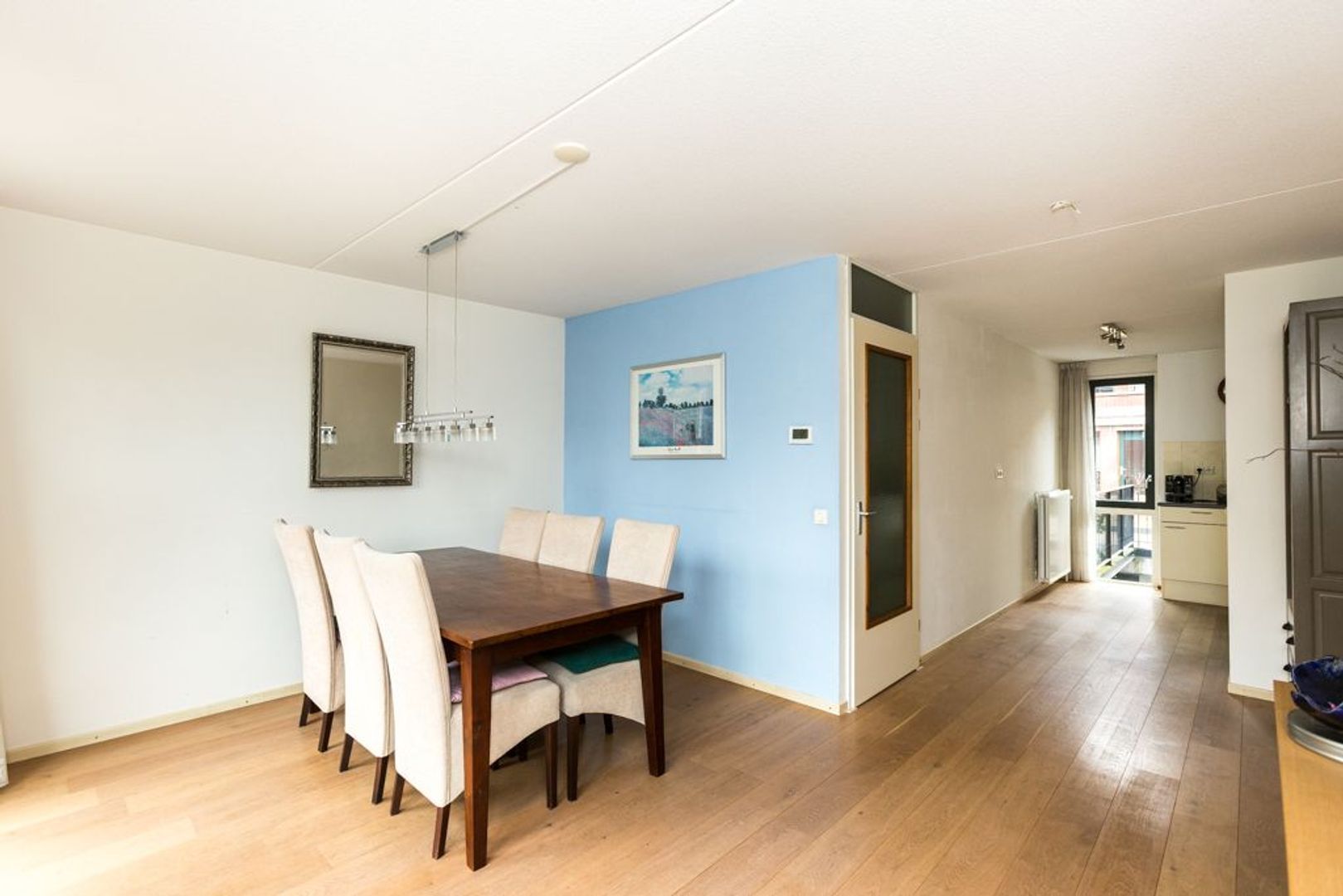 Entree van de woning op de eerste etage via loopbrug, hal met toilet met fonteintje, ruime en lichte L-vormige eetkamer (4.55x3.36/5.62) met zicht op de tuin en half open, nette keuken (ca. 3.03x2.15) voorzien van gasfornuis, afzuigkap, vaatwasser, rvs spoelbak en koelkast.