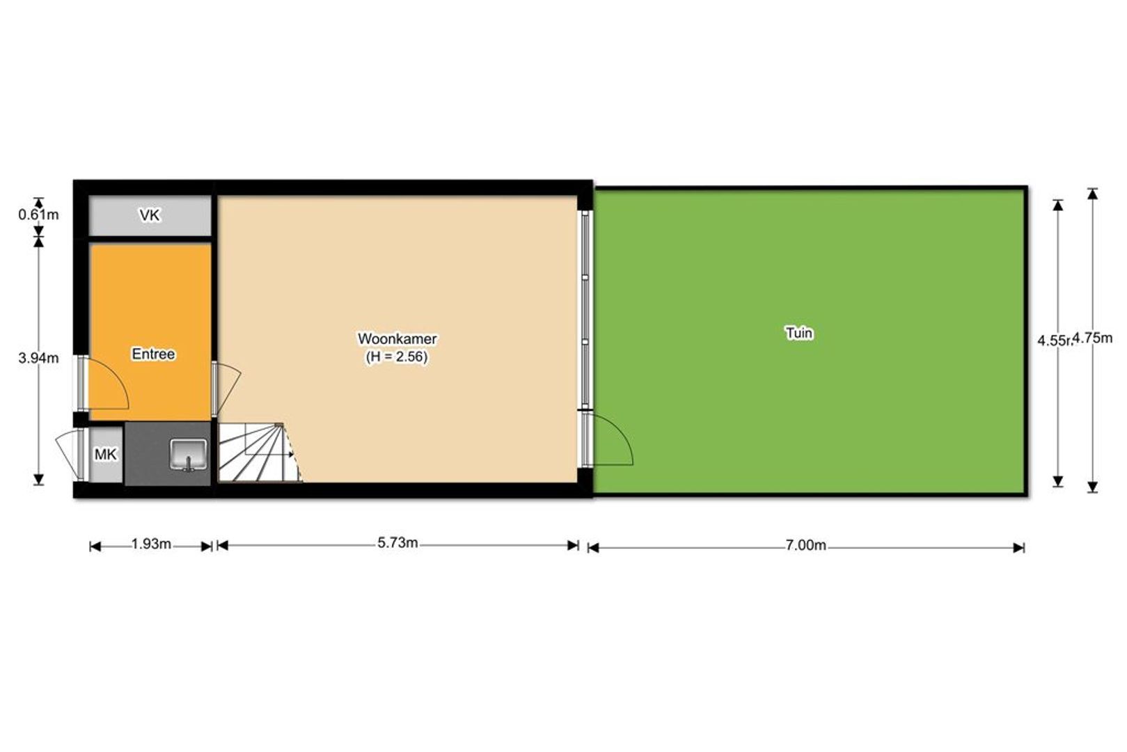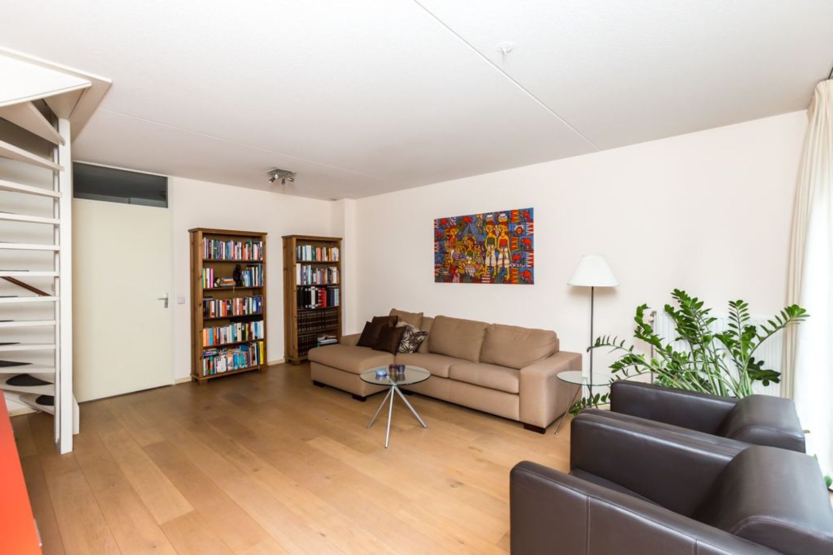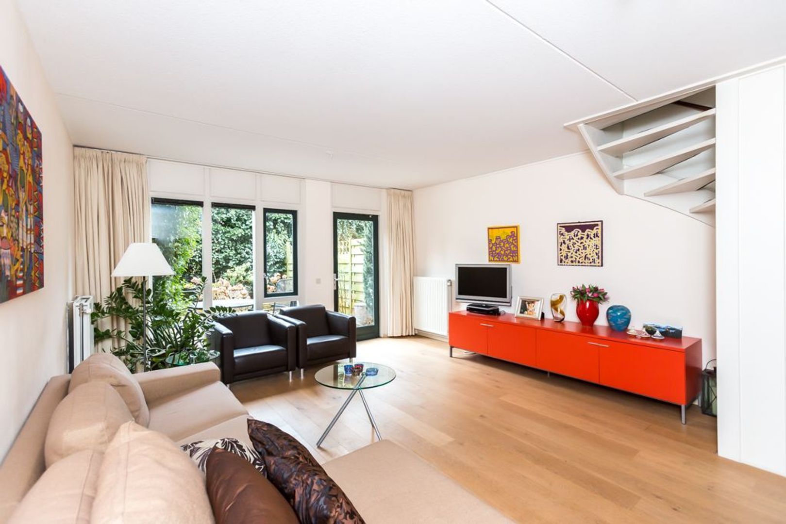 Heerlijk lichte woonkamer (ca. 5.73x4.55) met open trap naar de 2e etage en toegang tot de achtertuin (ca. 7.00x4.75), gelegen op het noordoosten.