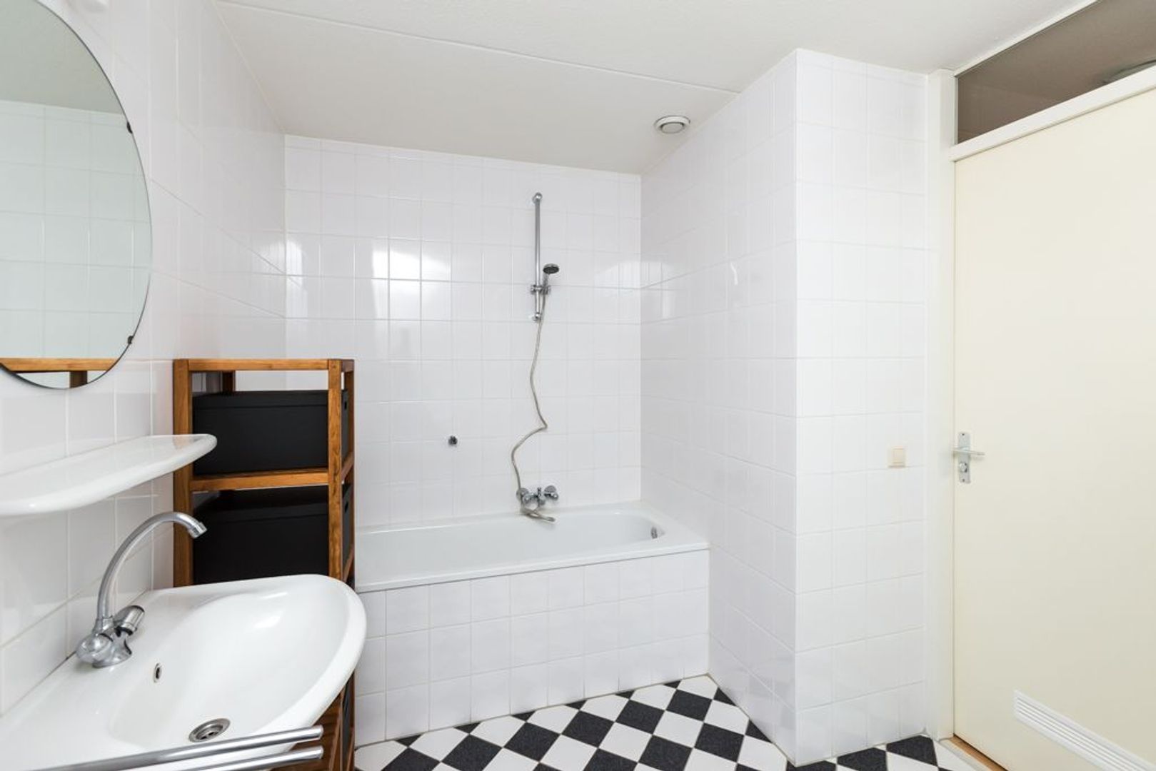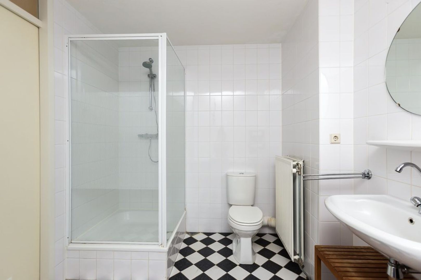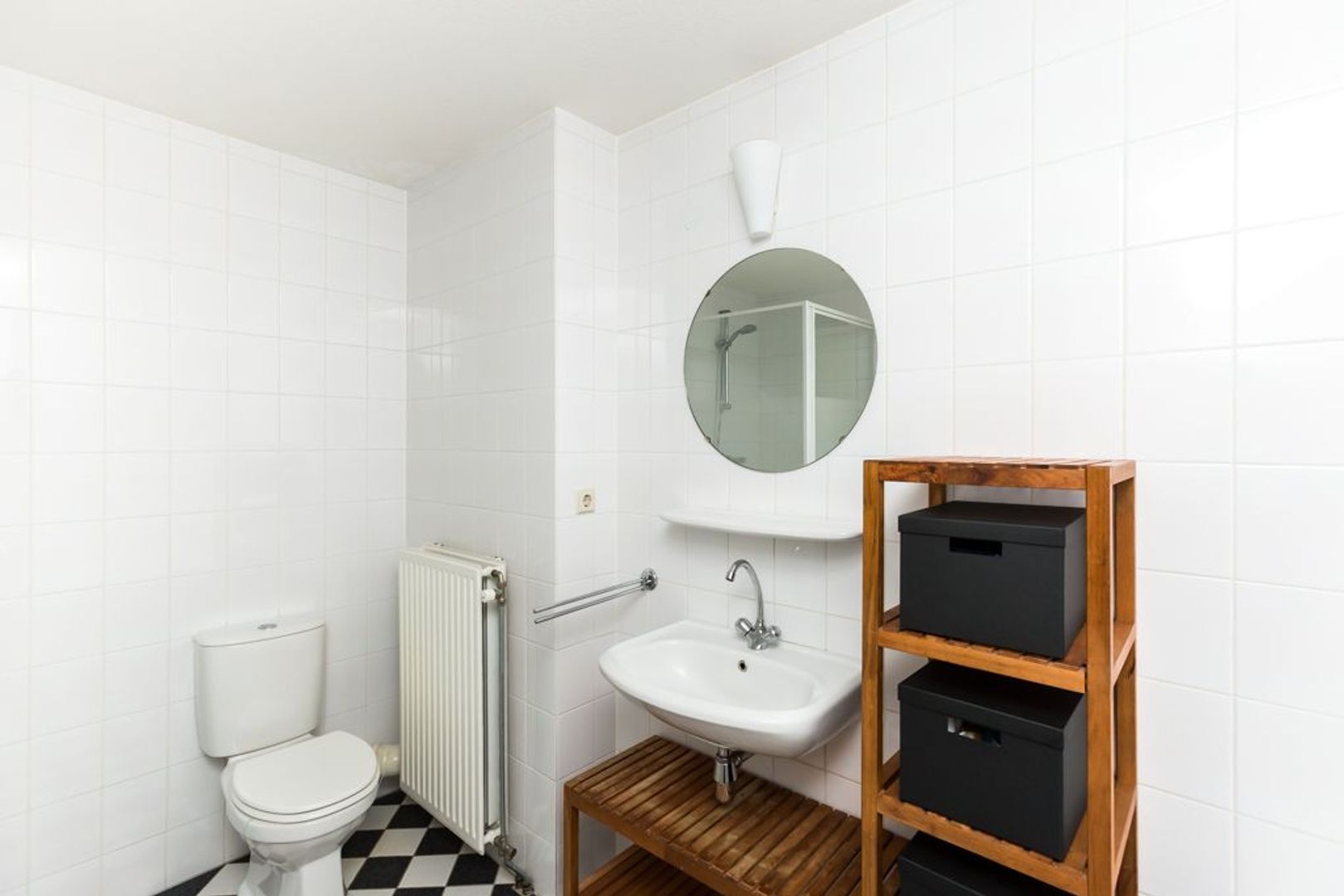 Tussengelegen betegelde badkamer met ligbad met mengkraan en handdouche, separate douchecabine met thermostaatkraan en handdouche, tweede toilet, wastafel met planchet en spiegel.