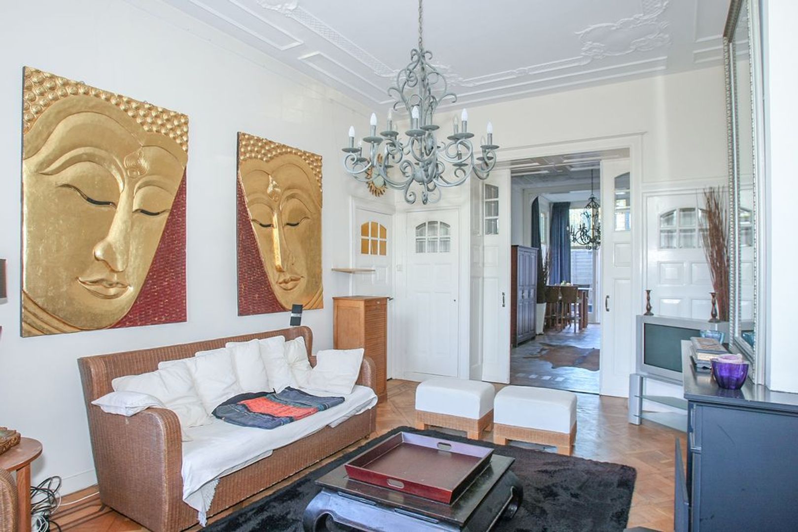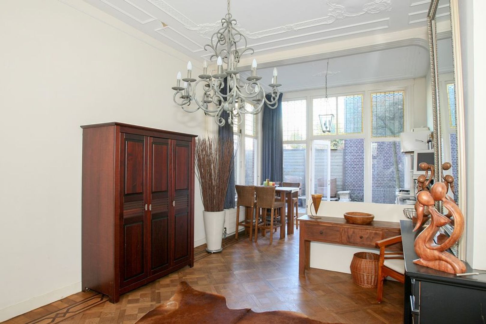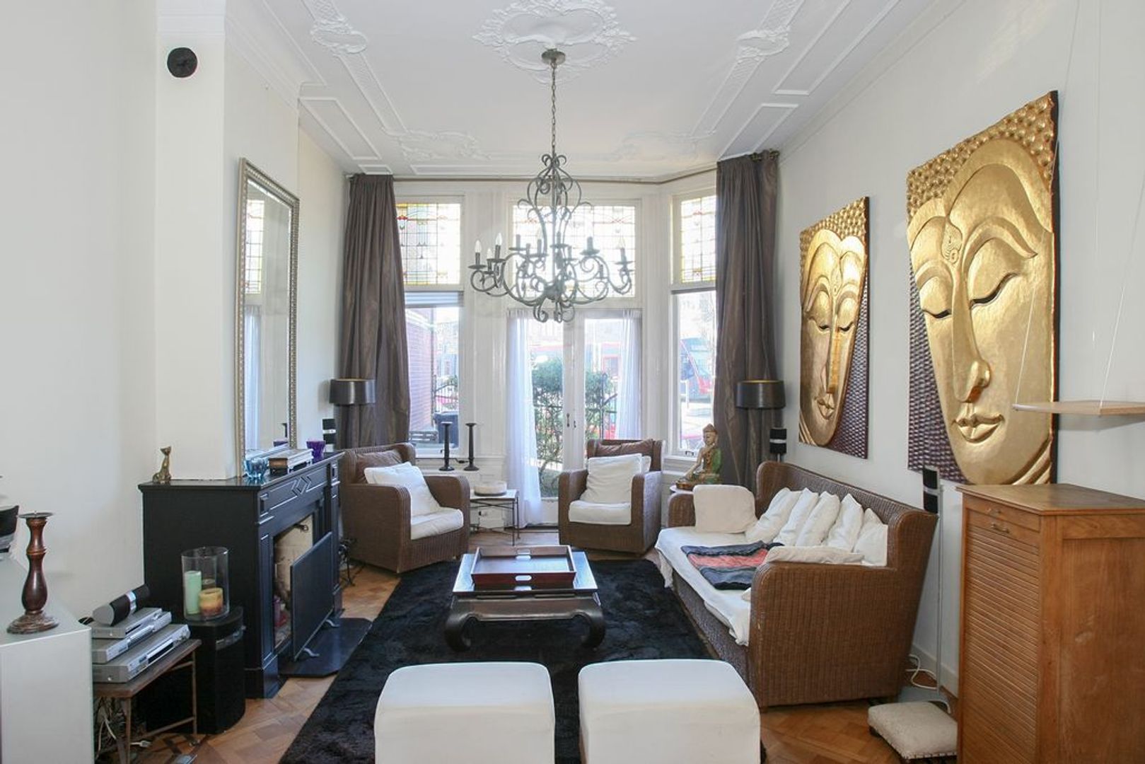 De woonkamer is voorzien van lijstenplafonds en een parketvloer.