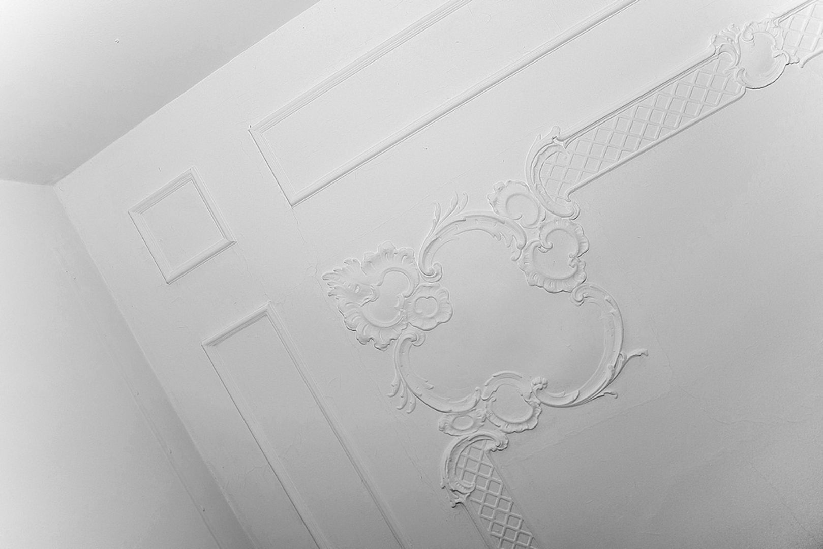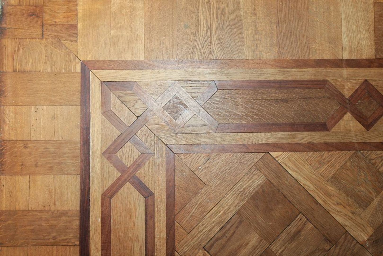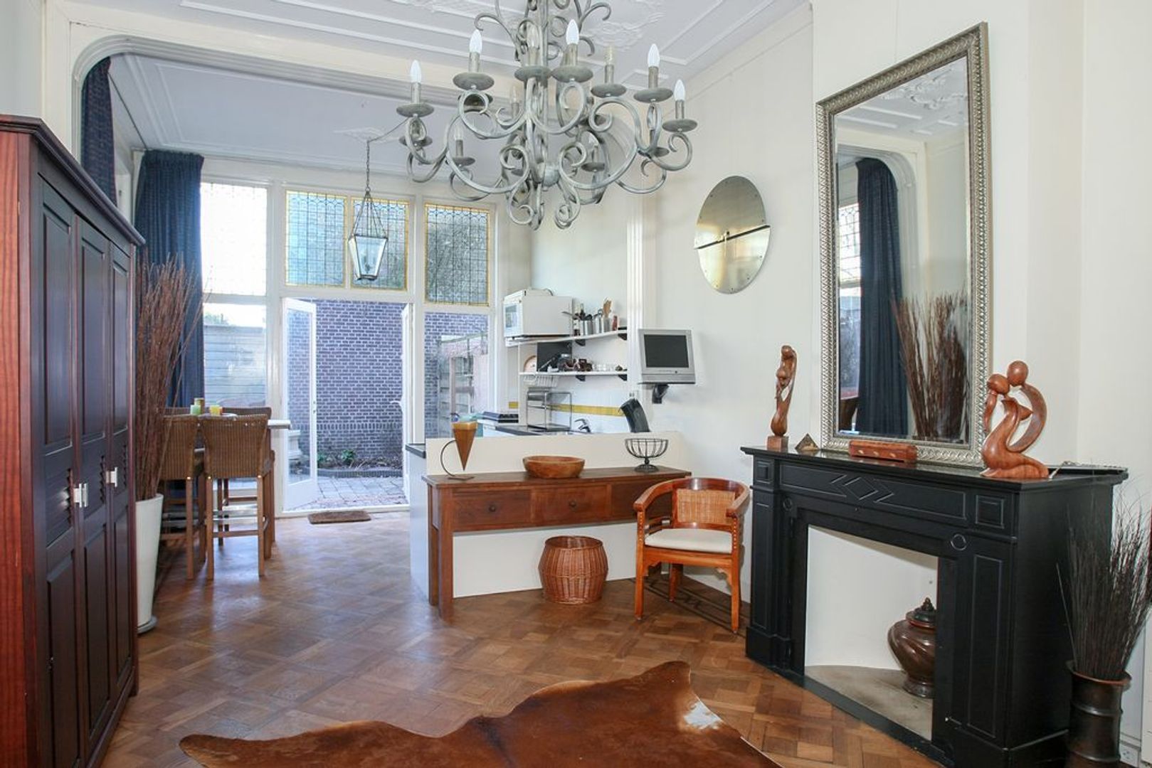De woonkamer is voorzien van lijstenplafonds en een parketvloer.