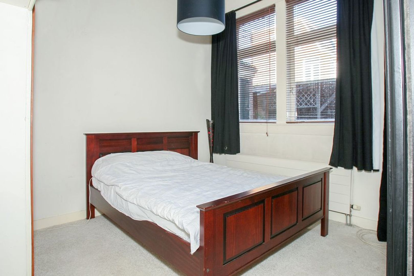 Slaapkamer (ca. 3.35x3.65) met toegang tot de berging (tevens toegankelijk vanuit de achtertuin), en deur naar de achtertuin.