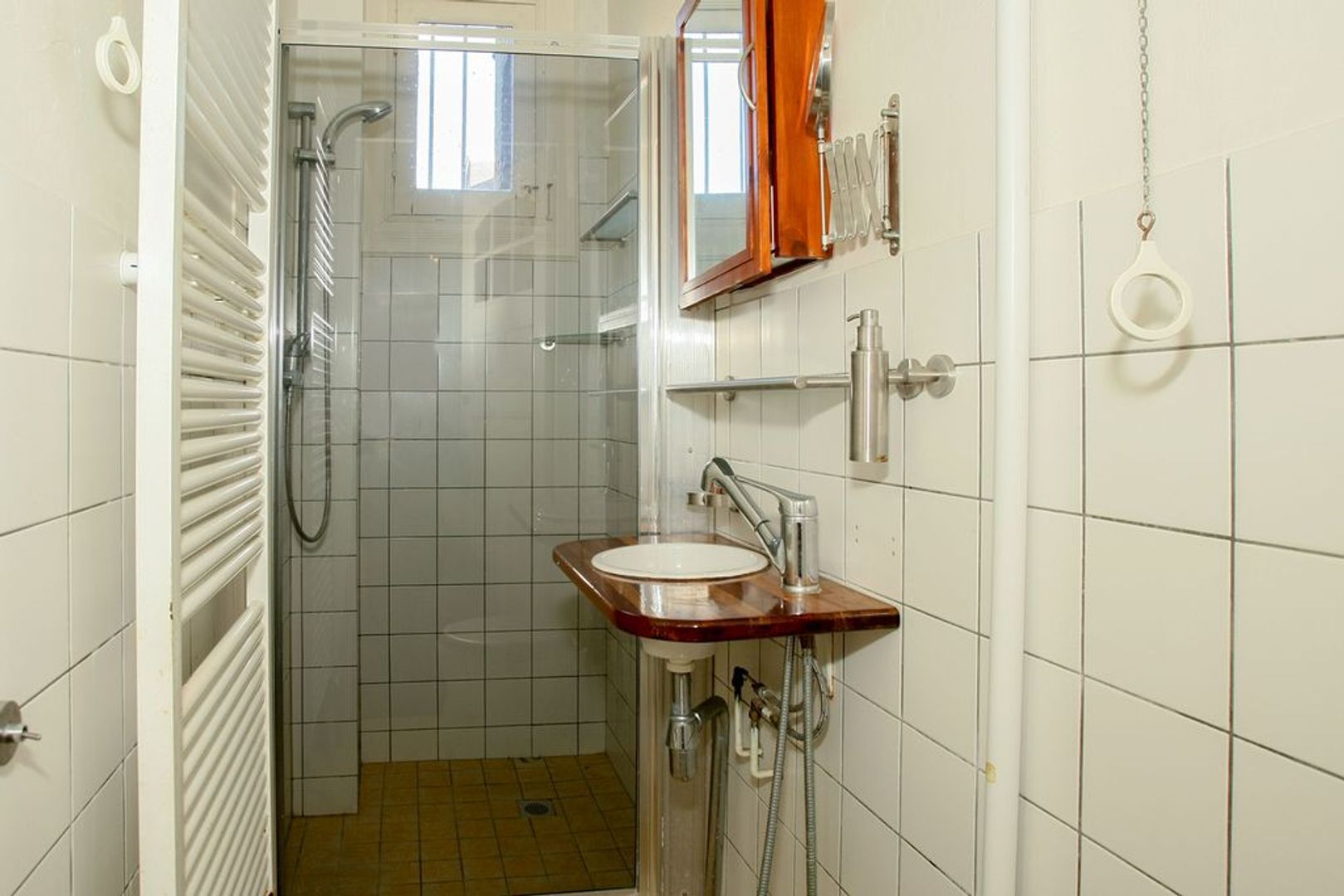 Entrance apartment via enclosed porch with meter cupboard, hall, with access to the tiled bathroom (approx. 2.33x1.01) with shower cabin, sink, toilet and towel radiator.