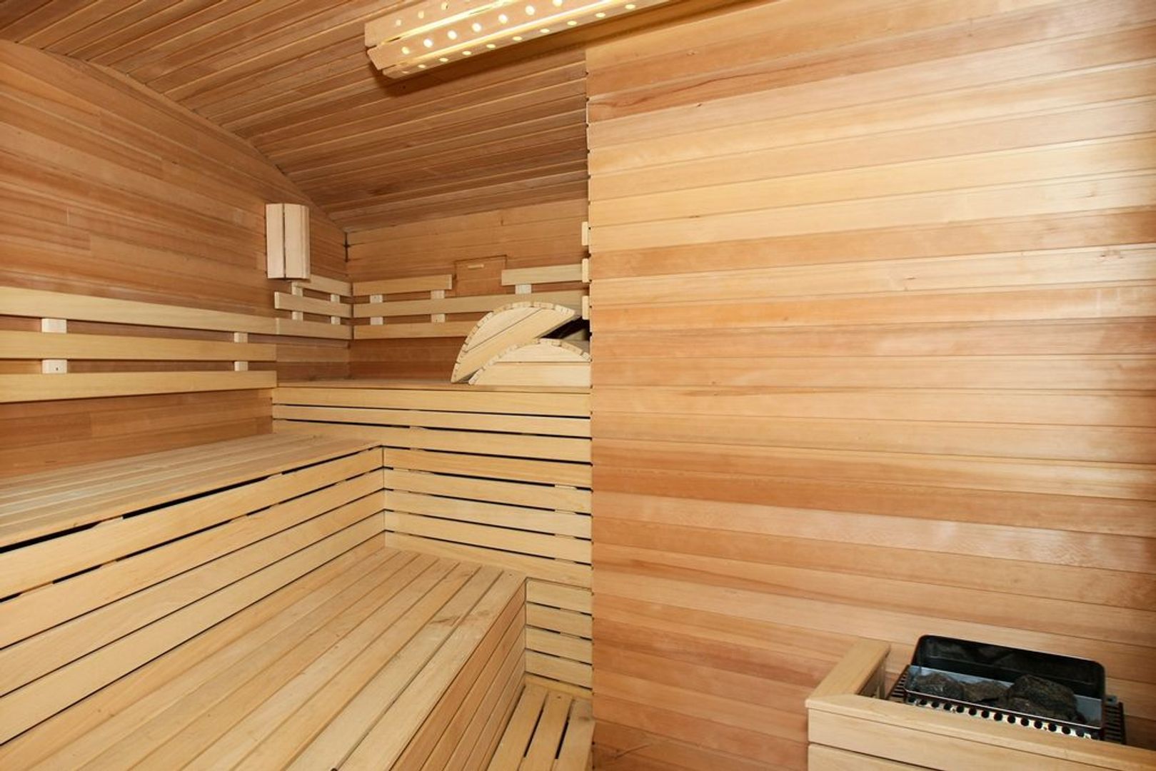 Spacious living room ensuite, front room (approx. 6.42x3.94) with mantelpiece and French doors to the front garden, suite separation with cupboards to the back room (approx. 8.26x3.94) with fireplace and open kitchen and French doors to the backyard ( approx. 11.24 / 6.52 / 4.91) with sauna, jacuzzi and rear entrance, facing North-East.