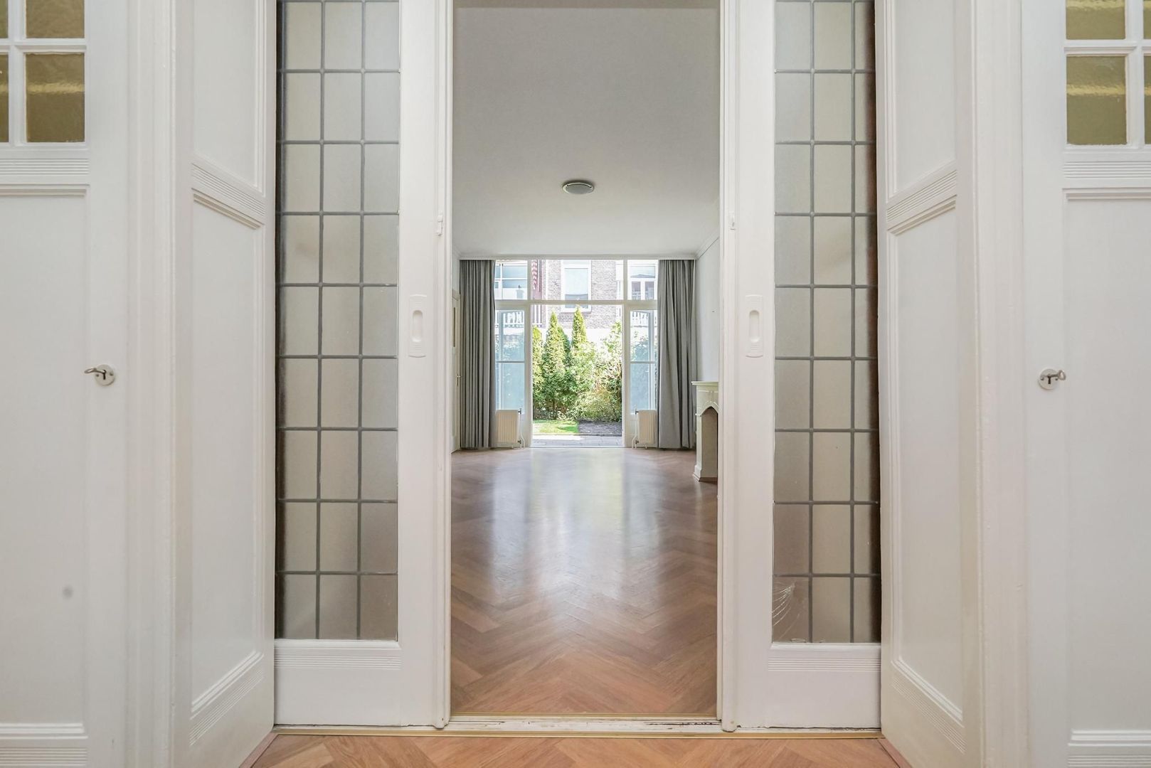 Entree appartement, vestibule met granito vloer en elektravoorziening, vervolgens bereikt u zeer fraaie, ruime en statige centrale hal met een zeer mooie karakteristieke granitovloer. Alle vertrekken hebben hun entree gelegen aan deze hal. Royale woon/eetkamer ensuite 1251x353, de mooie ensuite separatie met schuifdeuren voorzien van glas in lood en 4 vaste kasten met paneeldeuren, in visgraat gelegde laminaatvloer en hoge plafonds. Vanuit de achterzijde heeft u middels 2 openslaande deuren toegang tot de groene tuin gelegen op het Zuid Oosten.