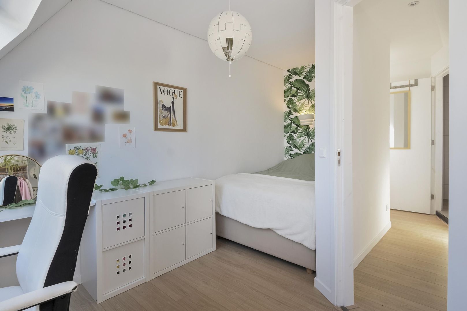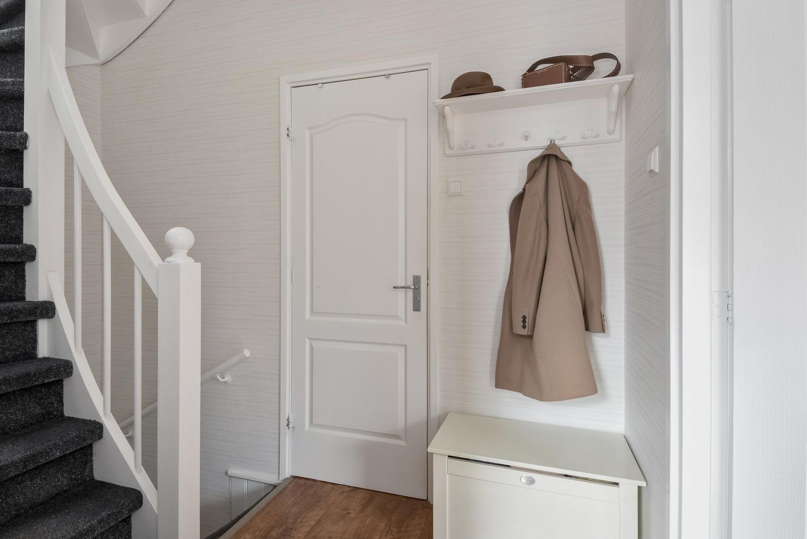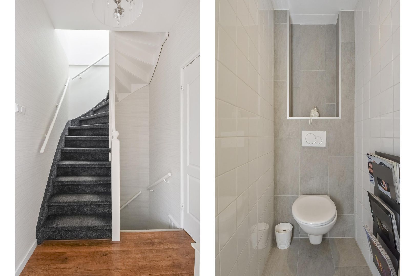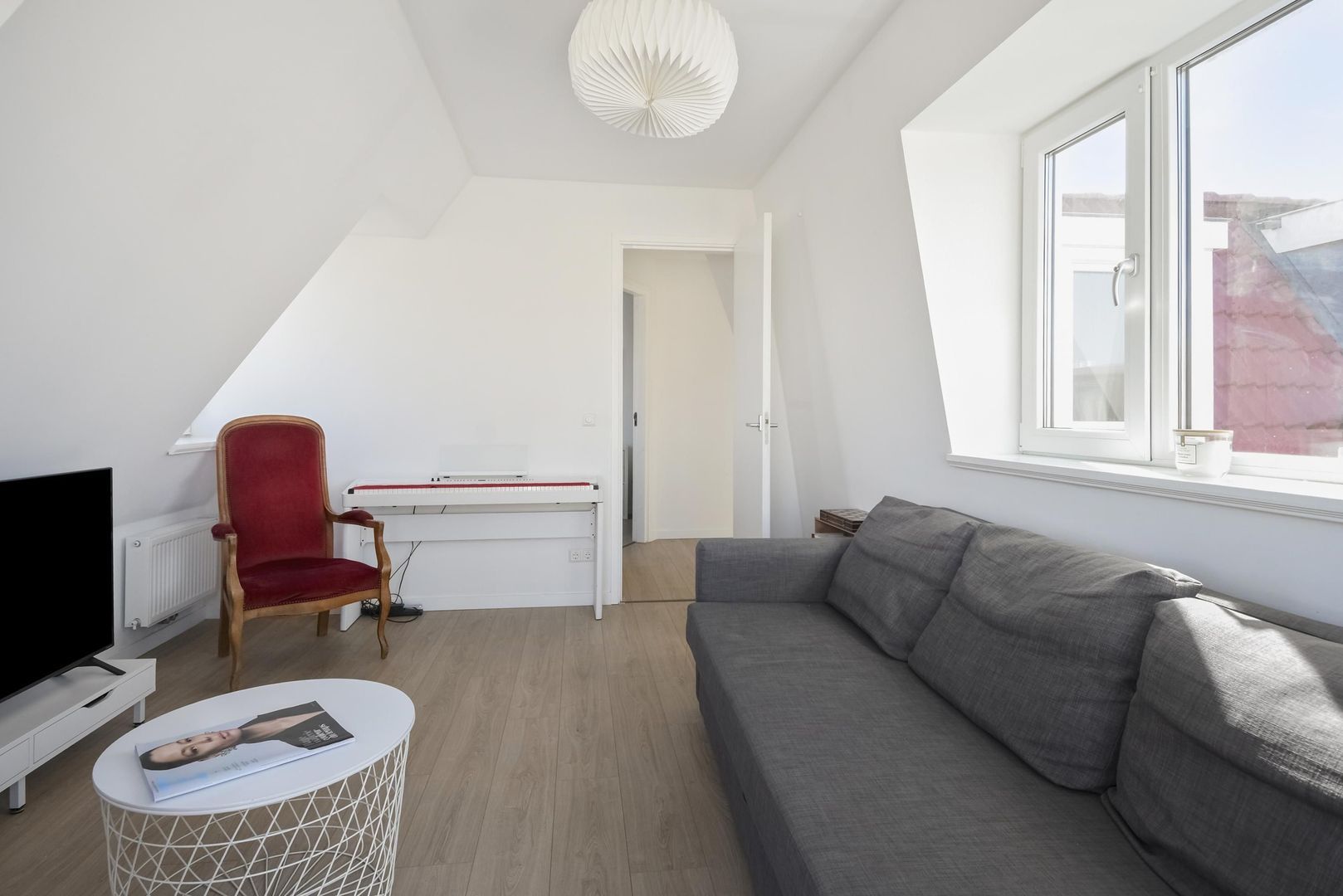 Entrance to the home, meter cupboard, stairs to the 1st floor, modern toilet and space for a washing machine and dryer, landing with access to a spacious and very bright living room with a small balcony at the front offering an unobstructed view over the square with a playground and green trees. Due to its corner location, the living room remains very bright and atmospheric even on dark days.