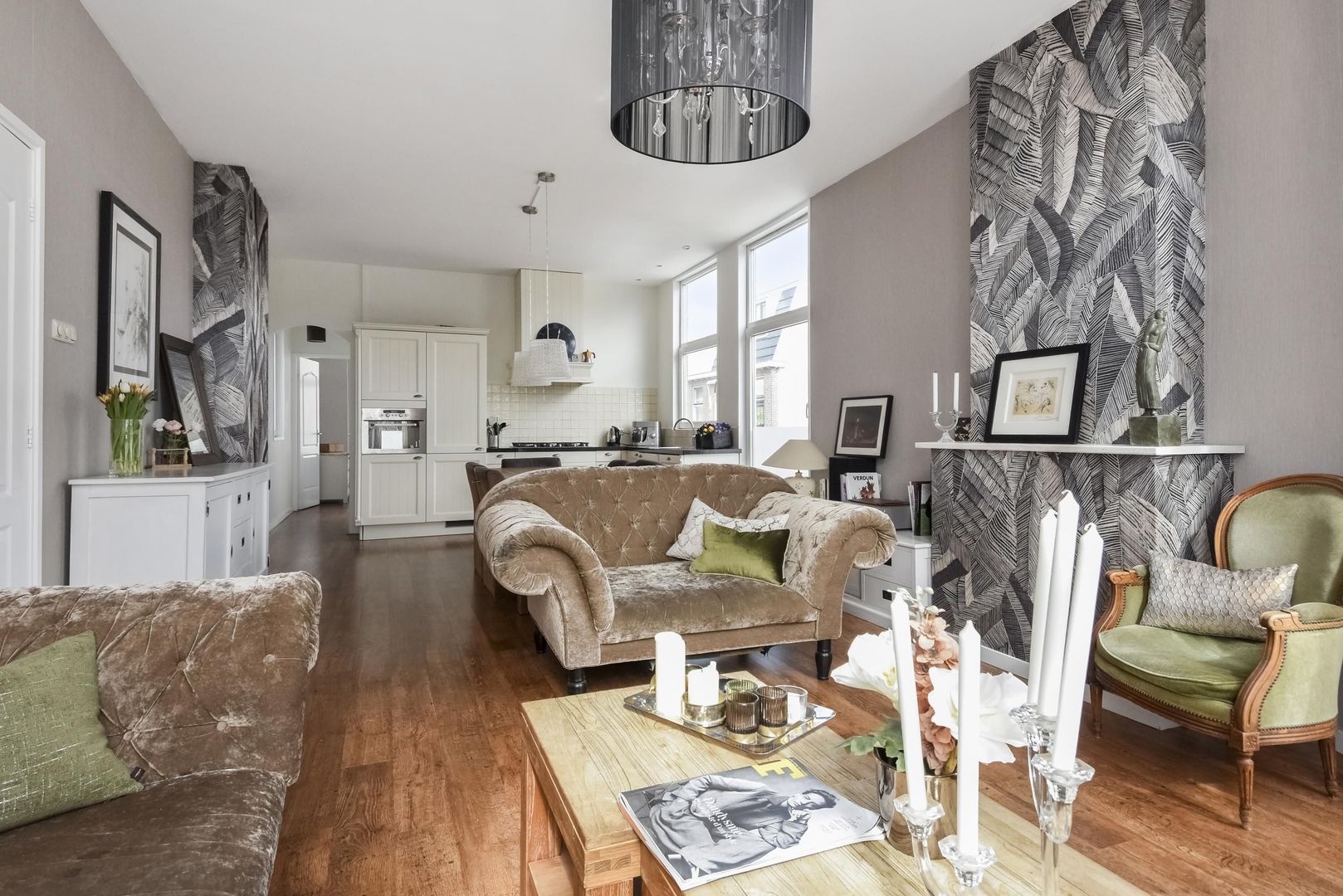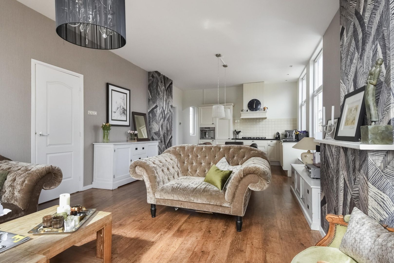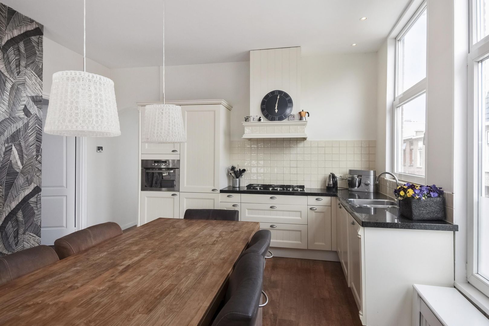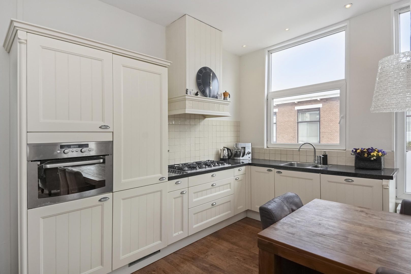 Een L-vormige charmante open keuken met inbouwapparatuur, 5 pits gasfornuis met afzuigkap, combi oven, koel-/vriescombinatie en een vaatwasser.
