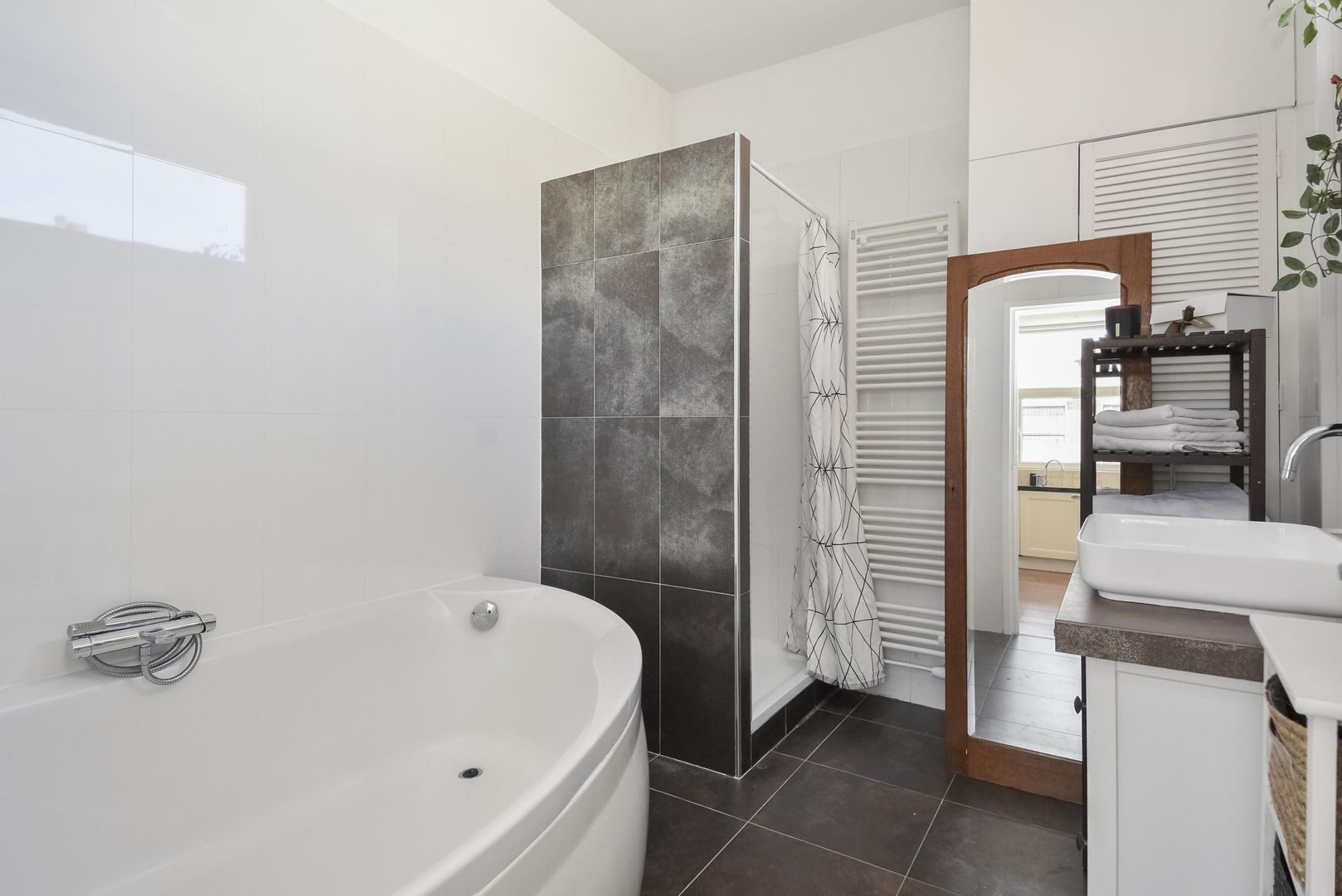 Moderne badkamer met groot ligbad, inloopdouche met regendouche, wastafel meubel en de hybride ketel is weggewerkt in de kast.