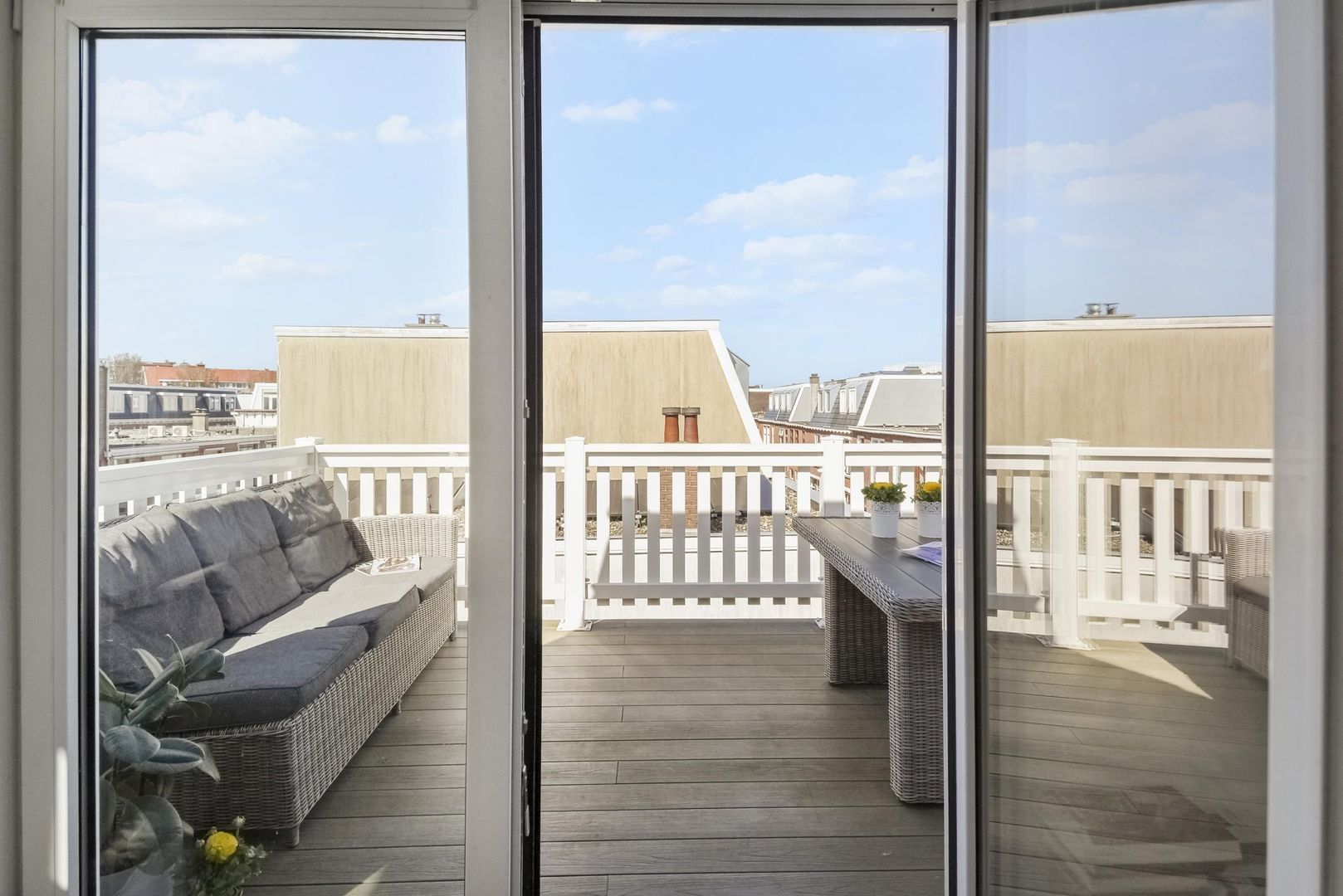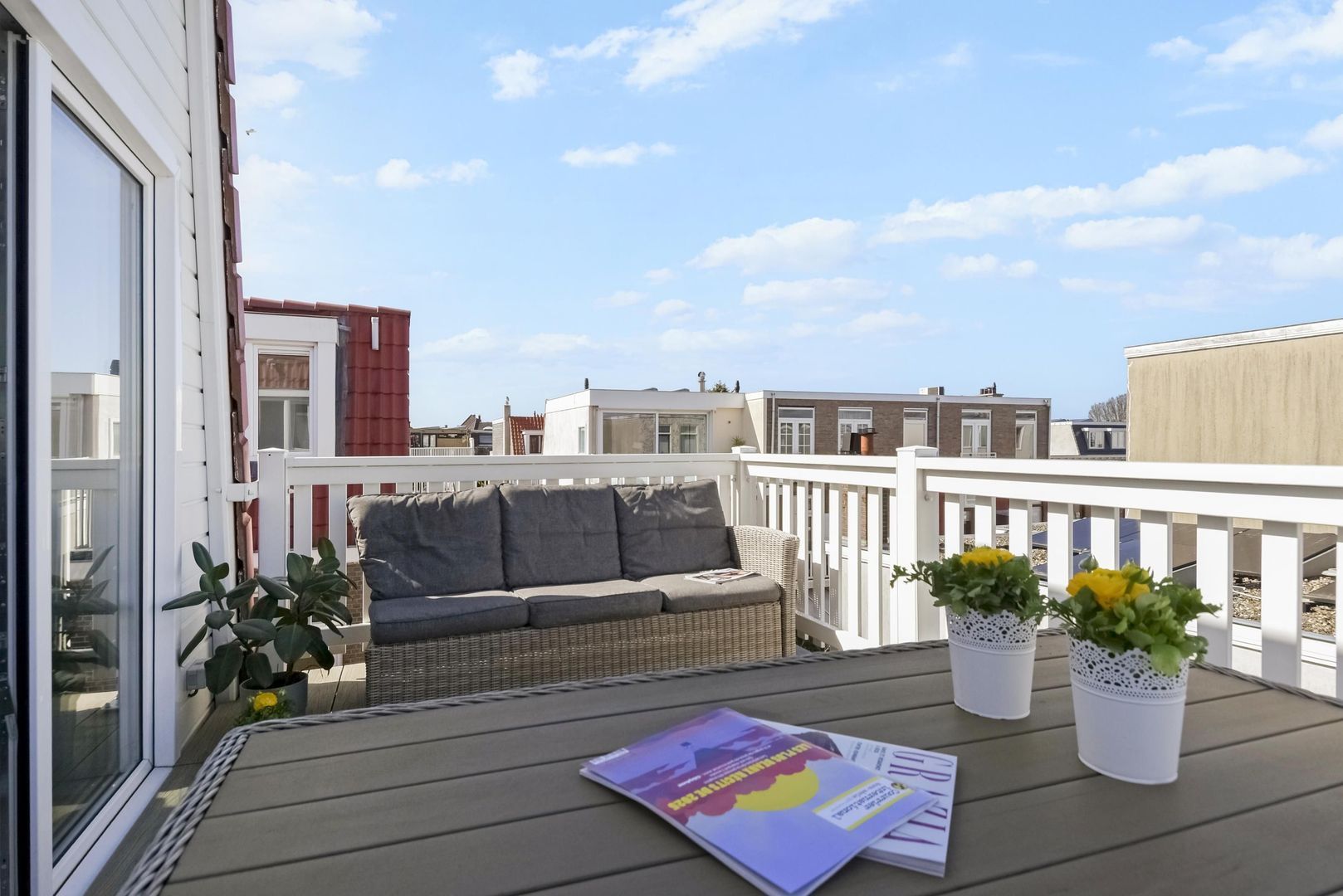 De zon staat vanaf de ochtend en middag aan de voorzijde van de woning en op het balkon, waarbij nu al in het voorjaar heerlijk is om de dubbel openslaande deuren open te zetten.