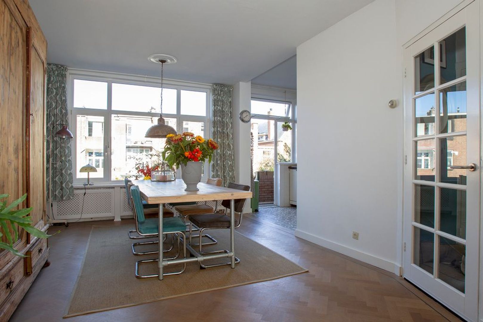 Lichte woon-/eetkamer (ca. 11.69x3.59) voorzien van fraaie visgraatparketvloer met bies doorlopend in de hal, erker aan de voorzijde en (gas-)open haard.