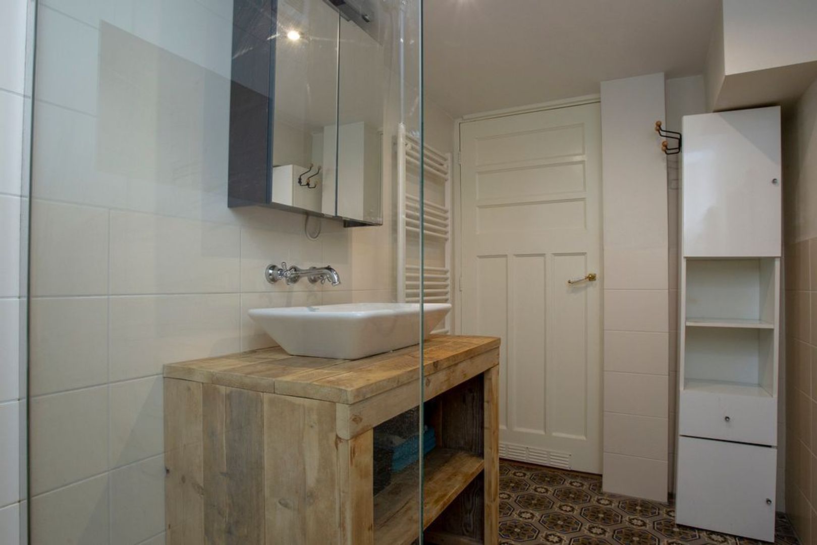 Binnentrap van begane grond naar souterrain, overloop met meterkast en deels betegelde badkamer (ca. 3.05x1.64) voorzien van inloopdouche, wastafel met meubel en bovenkast en designradiator.