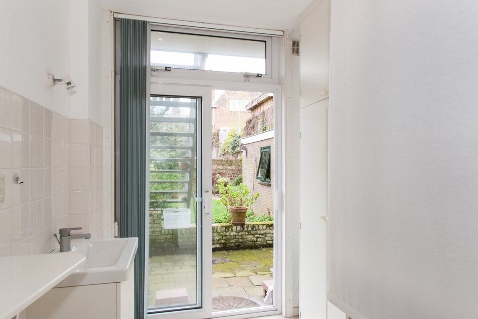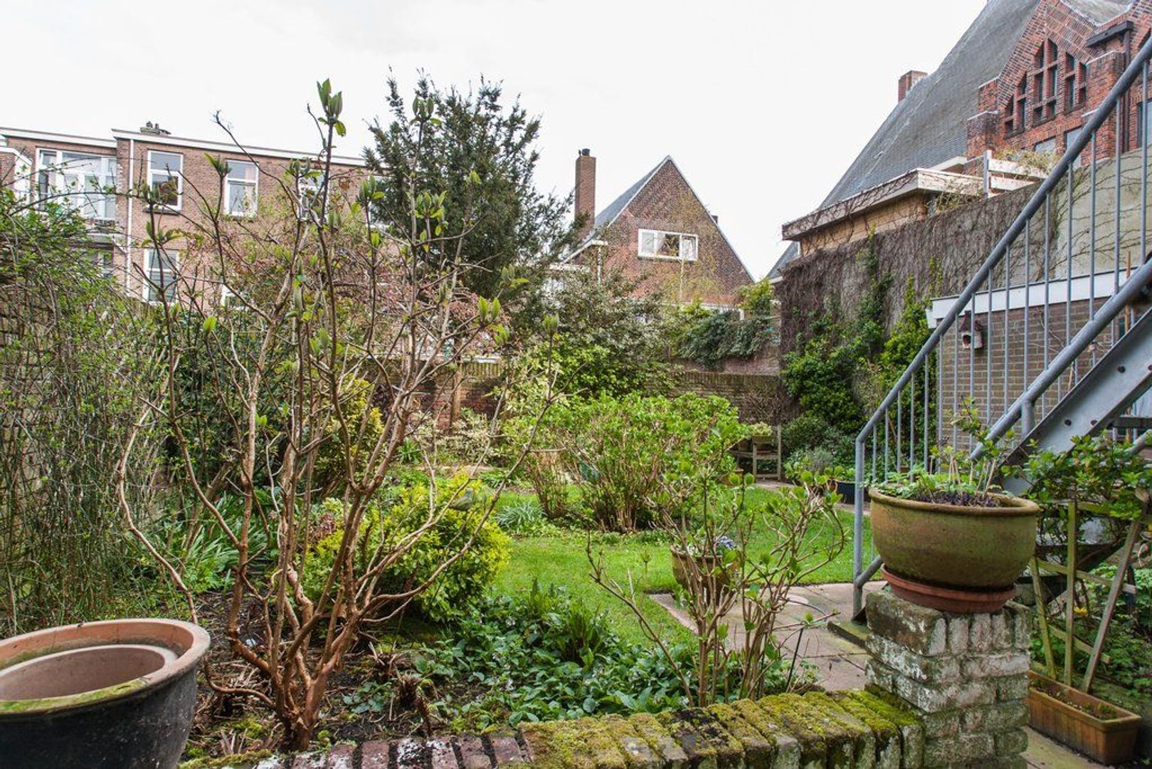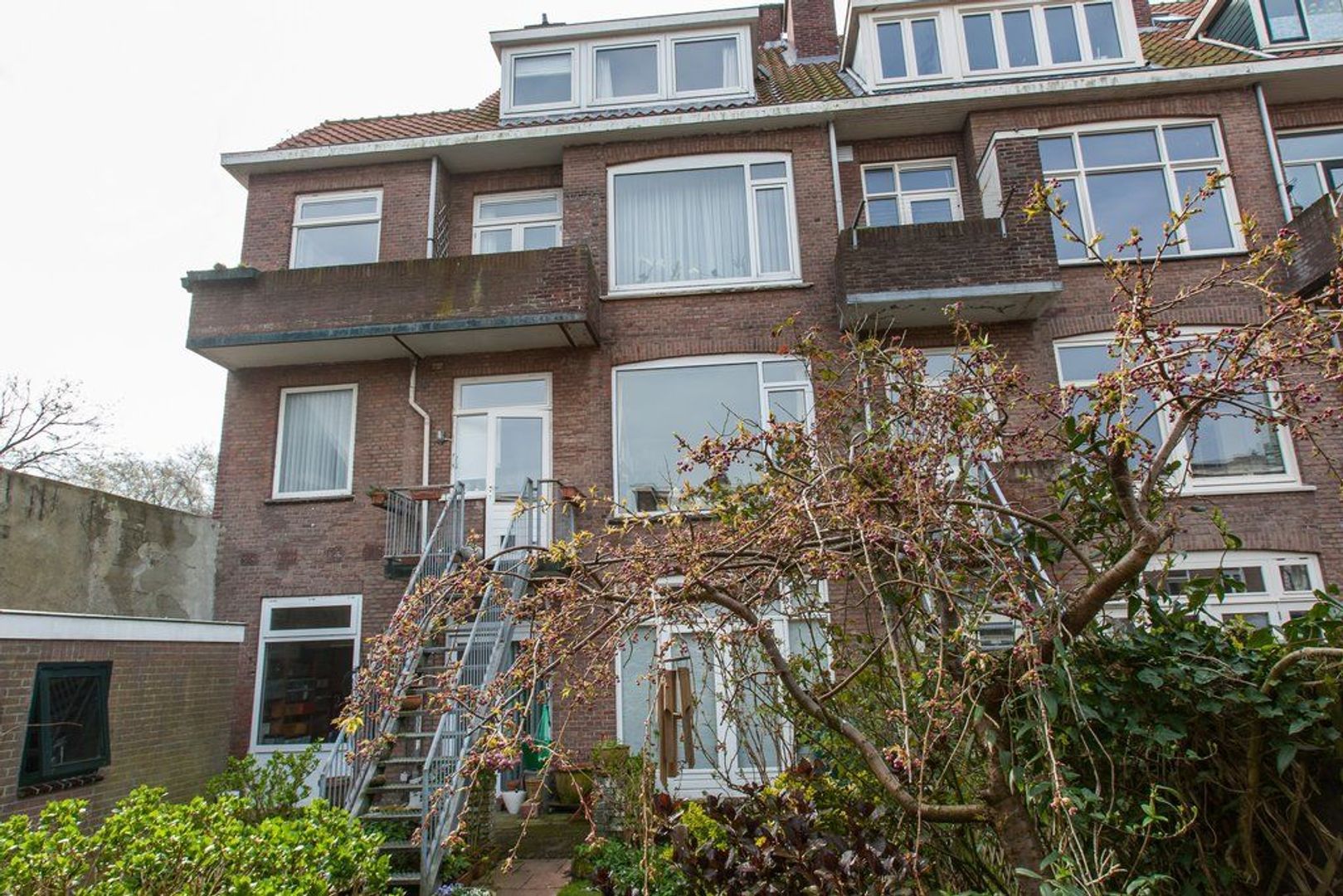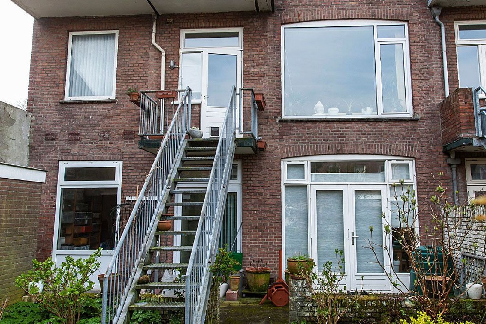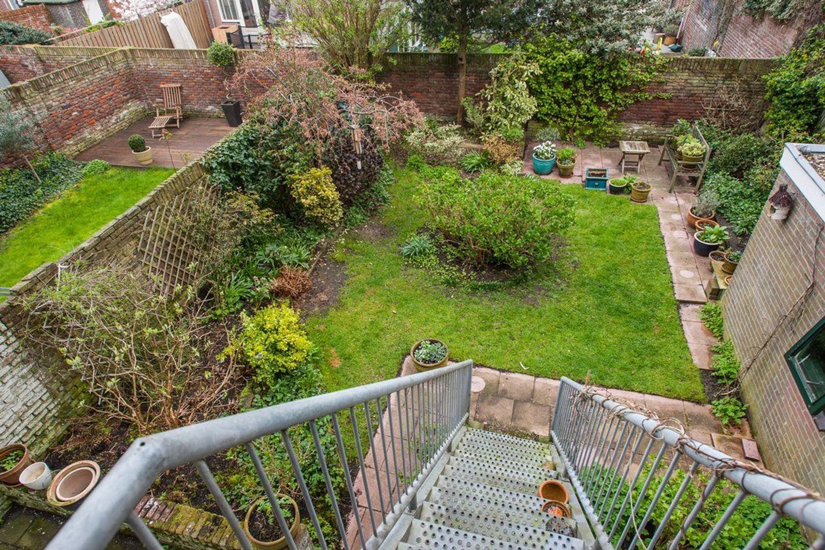 Balkon (ca. 2.00x0.94) met buitentrap naar de fraai aangelegde achtertuin met nagenoeg gehele dag zon, 12 meter diep en 8meter70 breed, dankzij de ernaast gelegen garage is de tuin extra breed en daardoor 1 van de grotere uit de straat.