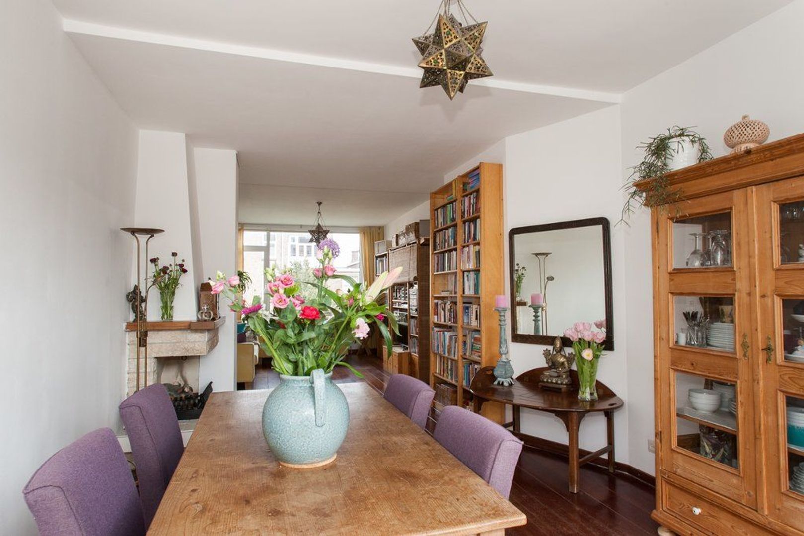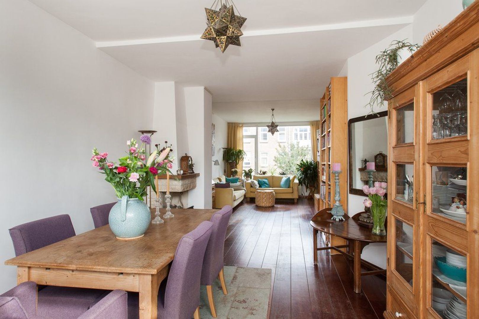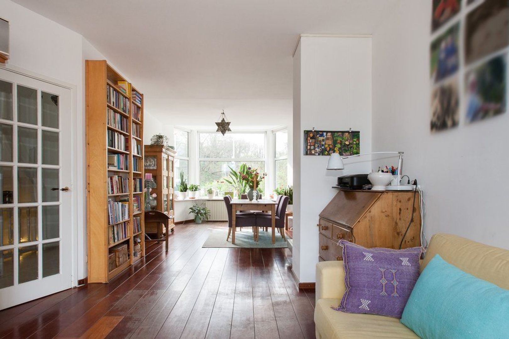 Lichte woon-/eetkamer (ca. 11.65x3.60) voorzien van houten vloer, erker aan de voorzijde en (gas-)open haard.