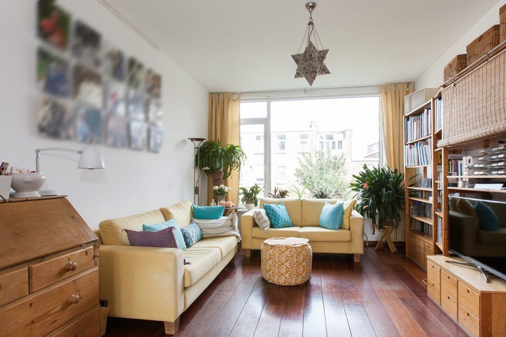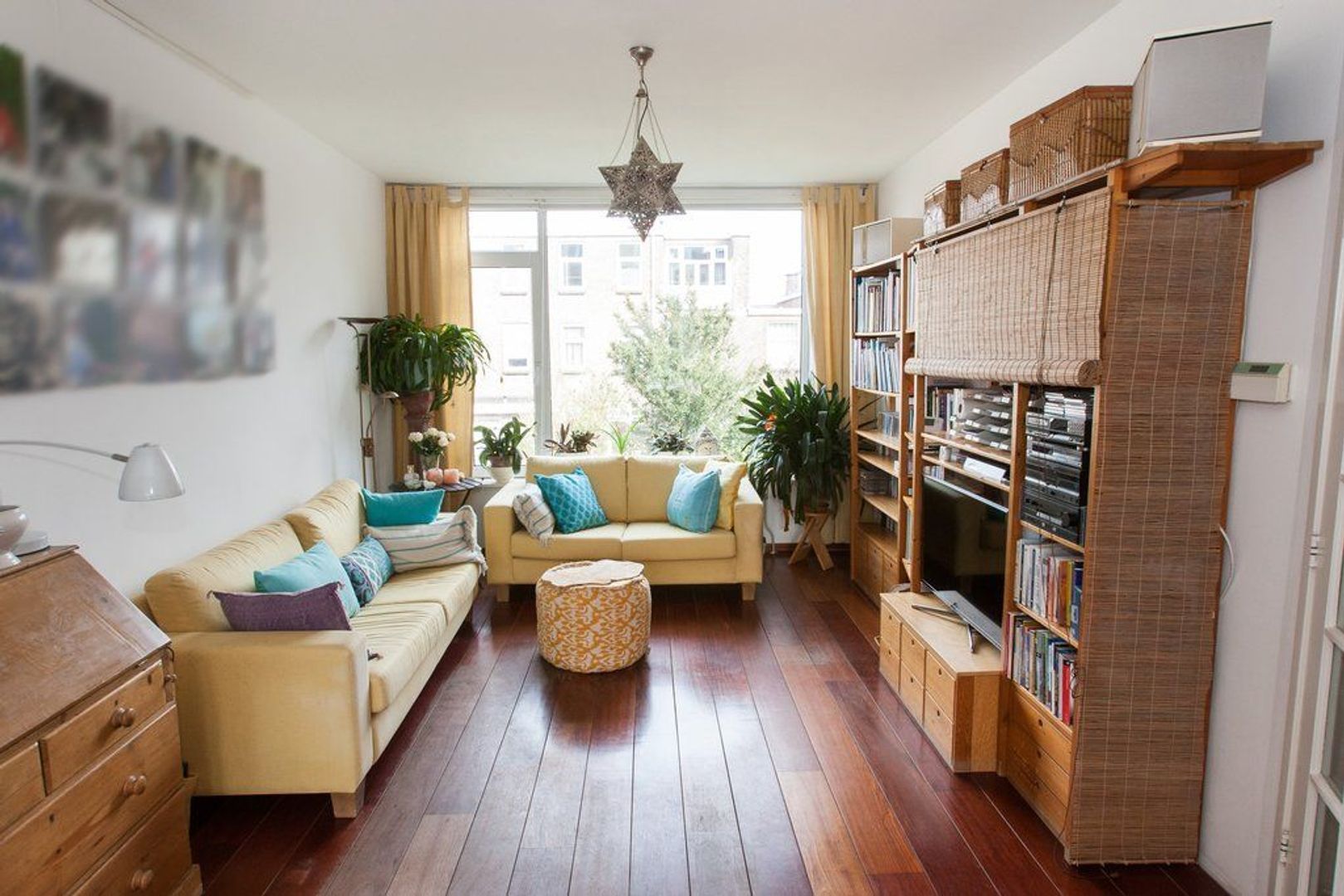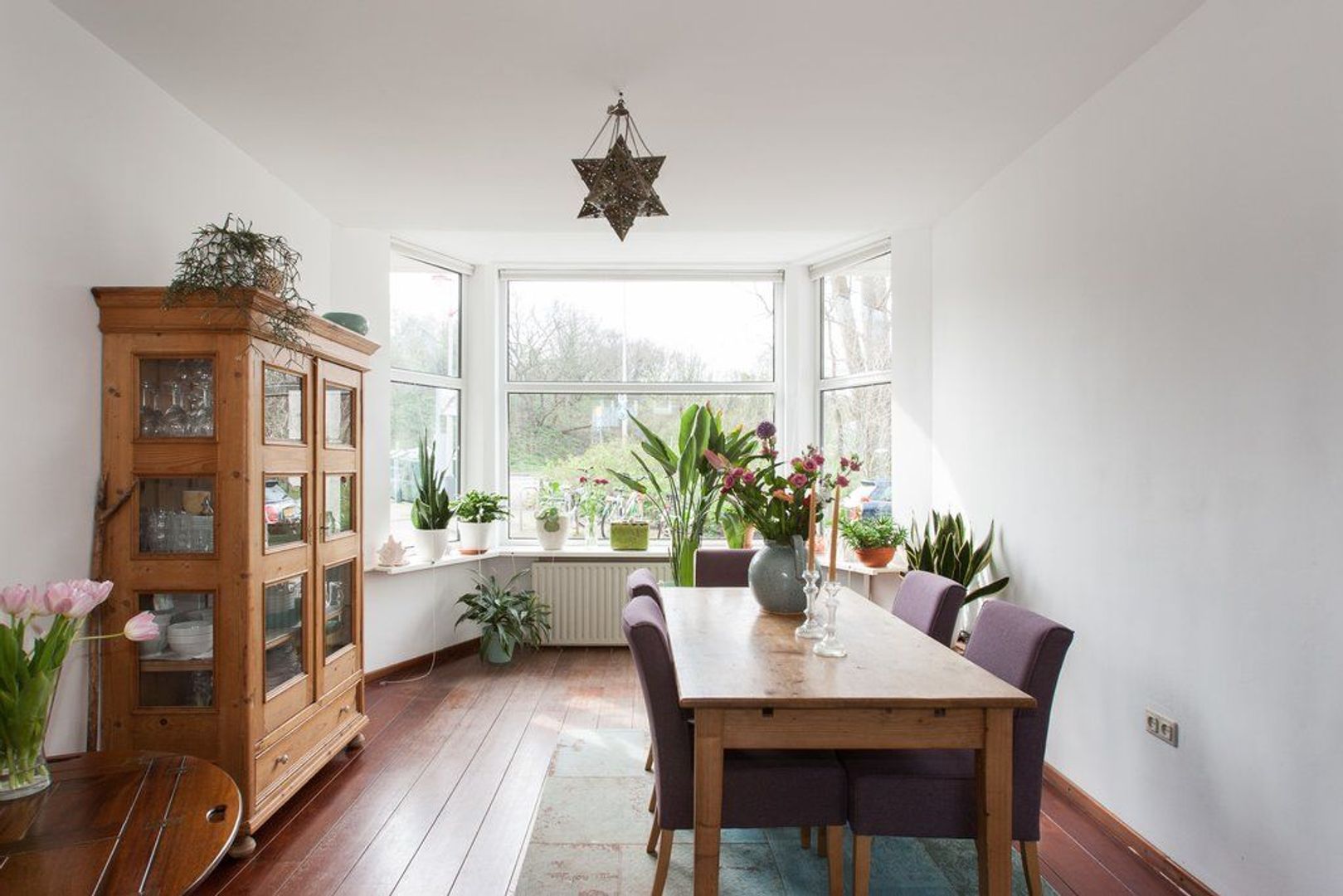 Lichte woon-/eetkamer (ca. 11.65x3.60) voorzien van houten vloer, erker aan de voorzijde en (gas-)open haard.
