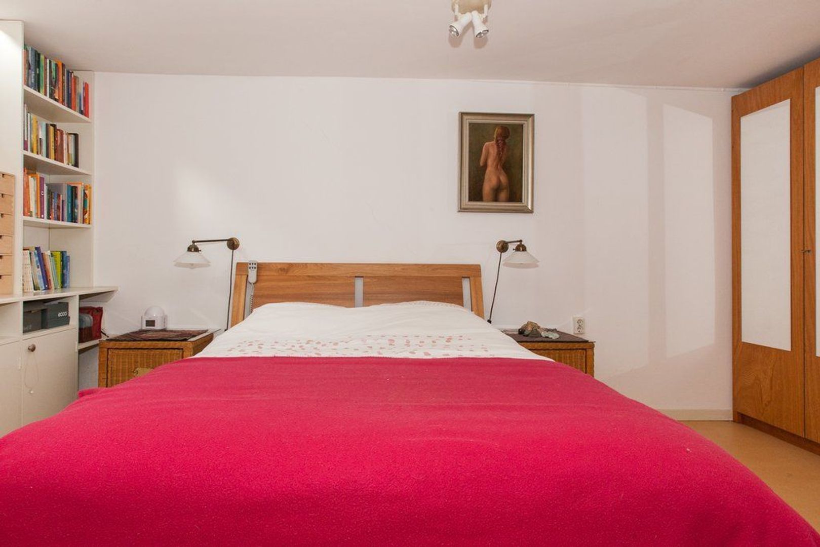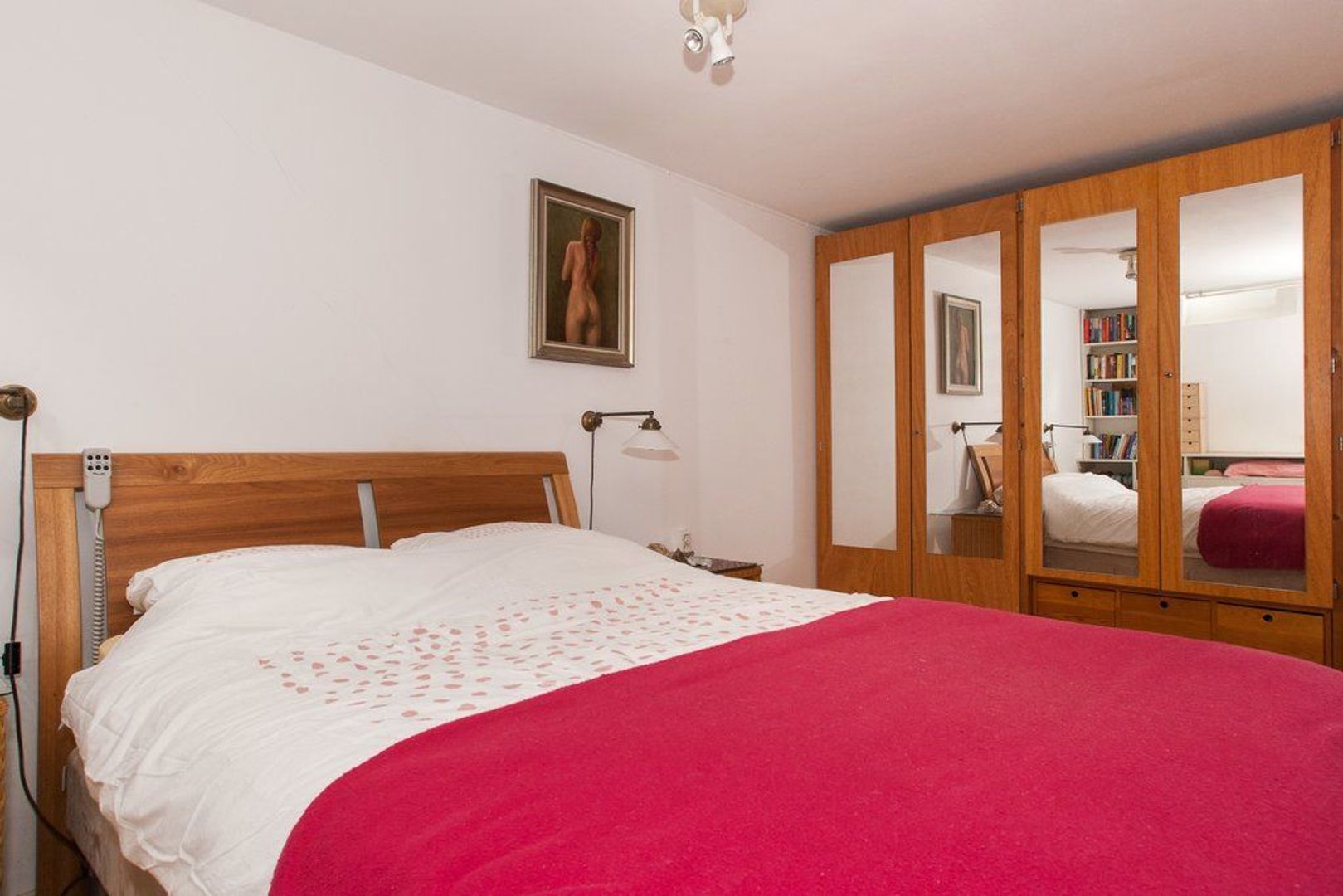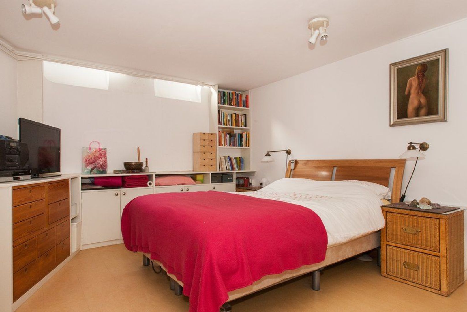 Via drie traptreden naar lager gelegen hal met toilet. Hoofdslaapkamer (ca. 6.38x3.55) met toegang tot de eerdergenoemde achtertuin. Slaapkamer thans waskamer (ca.2.35x1.87) met toegang tot de achtertuin. Slaapkamer 455x253. Keurige badkamer met douche, ligbad en vaste wastafel.