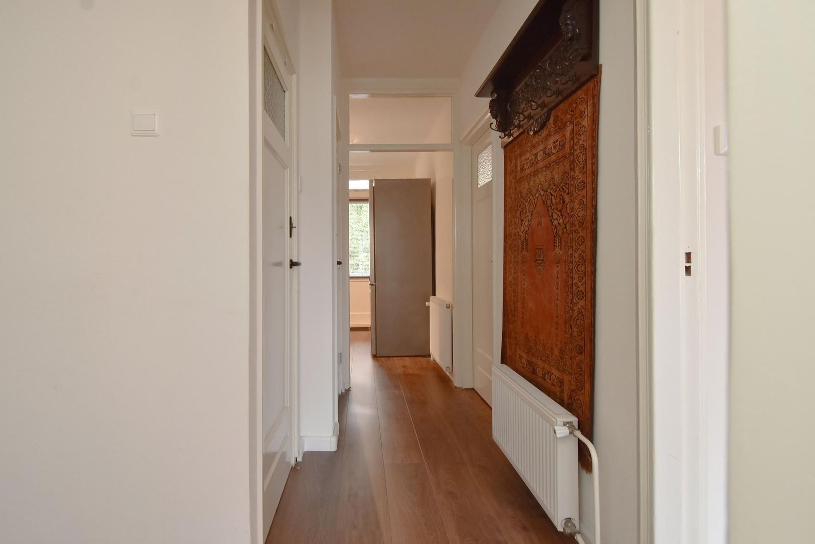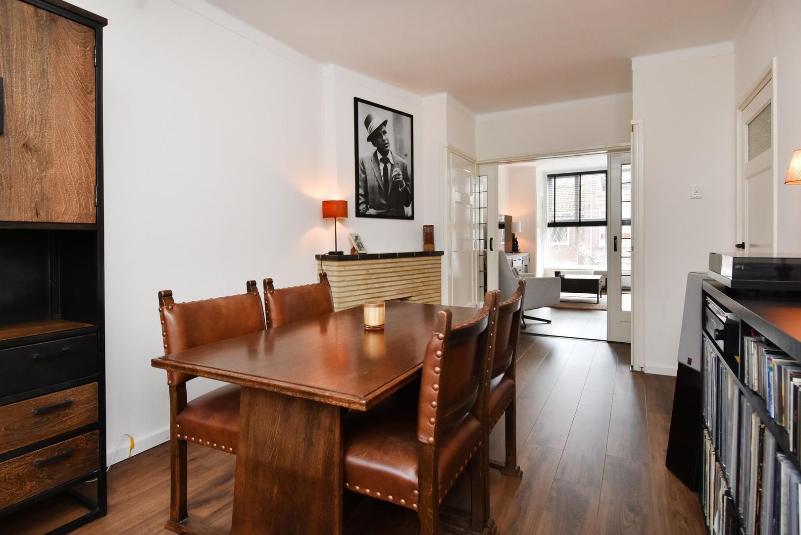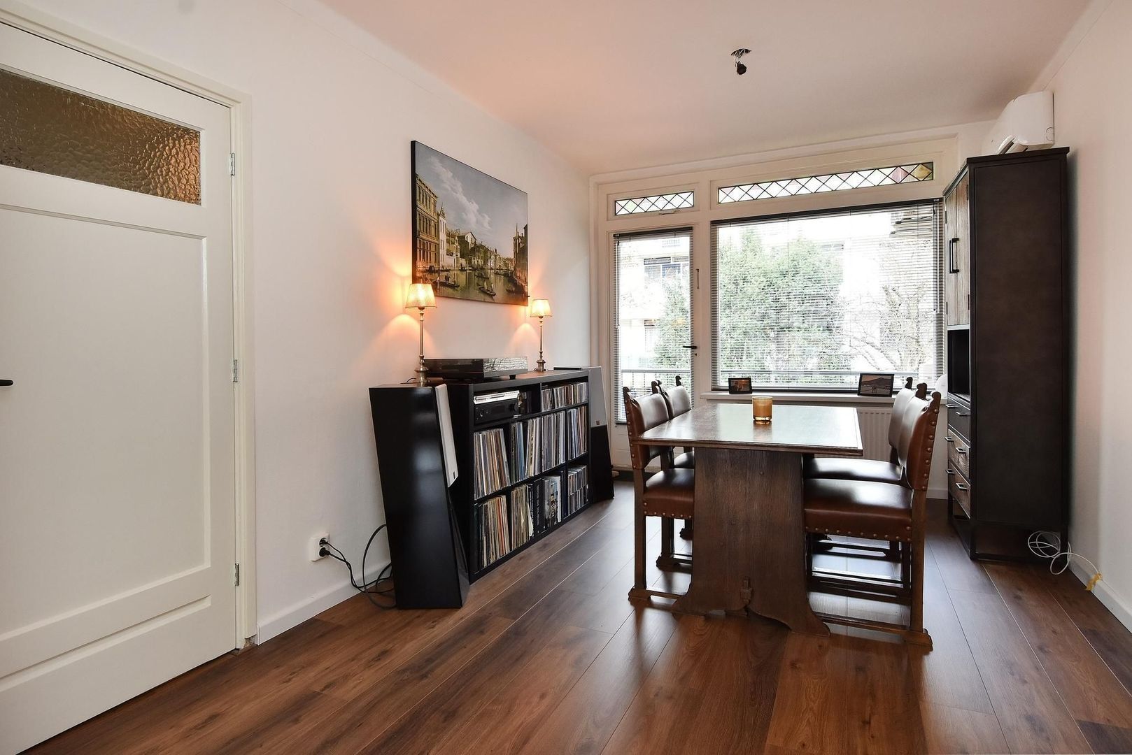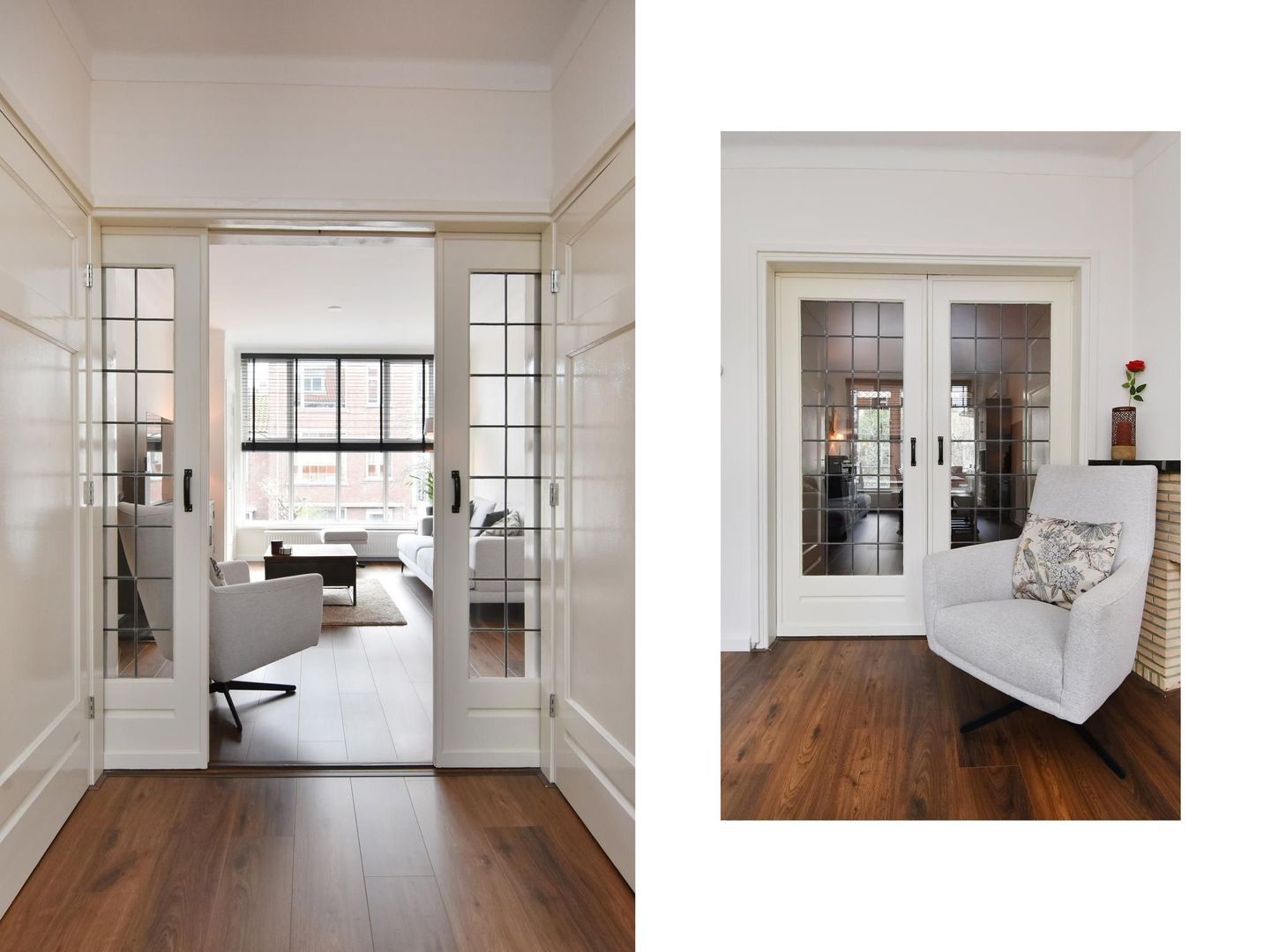gesloten entree met brievenbus- en bellentableaus, entree appartement op de 1e etage, L-vormige gang, meterkast, slaapkamer aan de voorzijde 313x194. Sfeervolle woon/eetkamer ensuite 1038x340/300 met fraaie suite separatie met glas in lood schuifdeuren en vaste kasten, voorzijde kunststofkozijnen met fraaie roede verdeling en 2 oorspronkelijke schouwen. De vloer is voorzien van een mooie laminaatvloer (in het gehele appartement gelegen). Vanuit het eetgedeelte is het op de middag- en avondzon gelegen balkon aan de achterzijde bereikbaar. Eventueel is de achterkamer als ruime slaapkamer te benutten.
