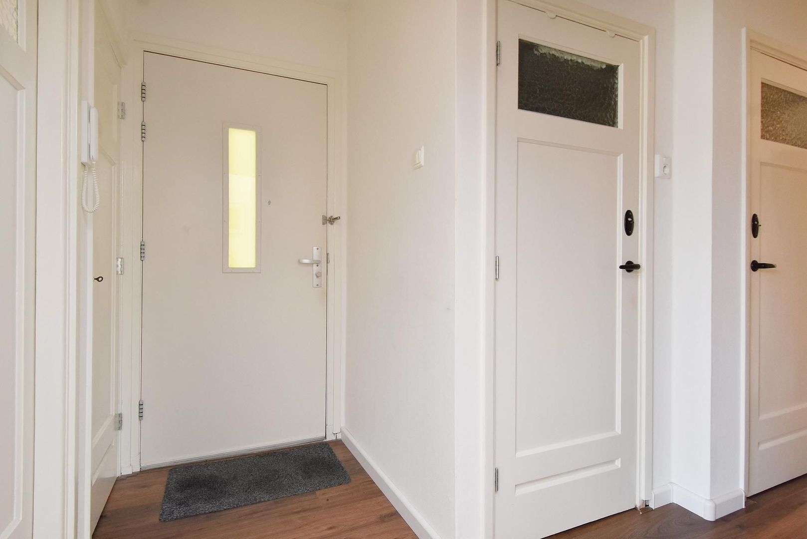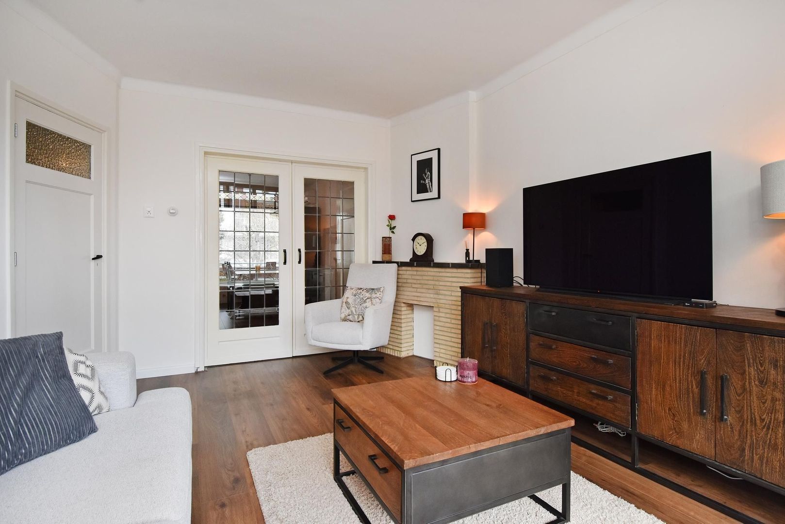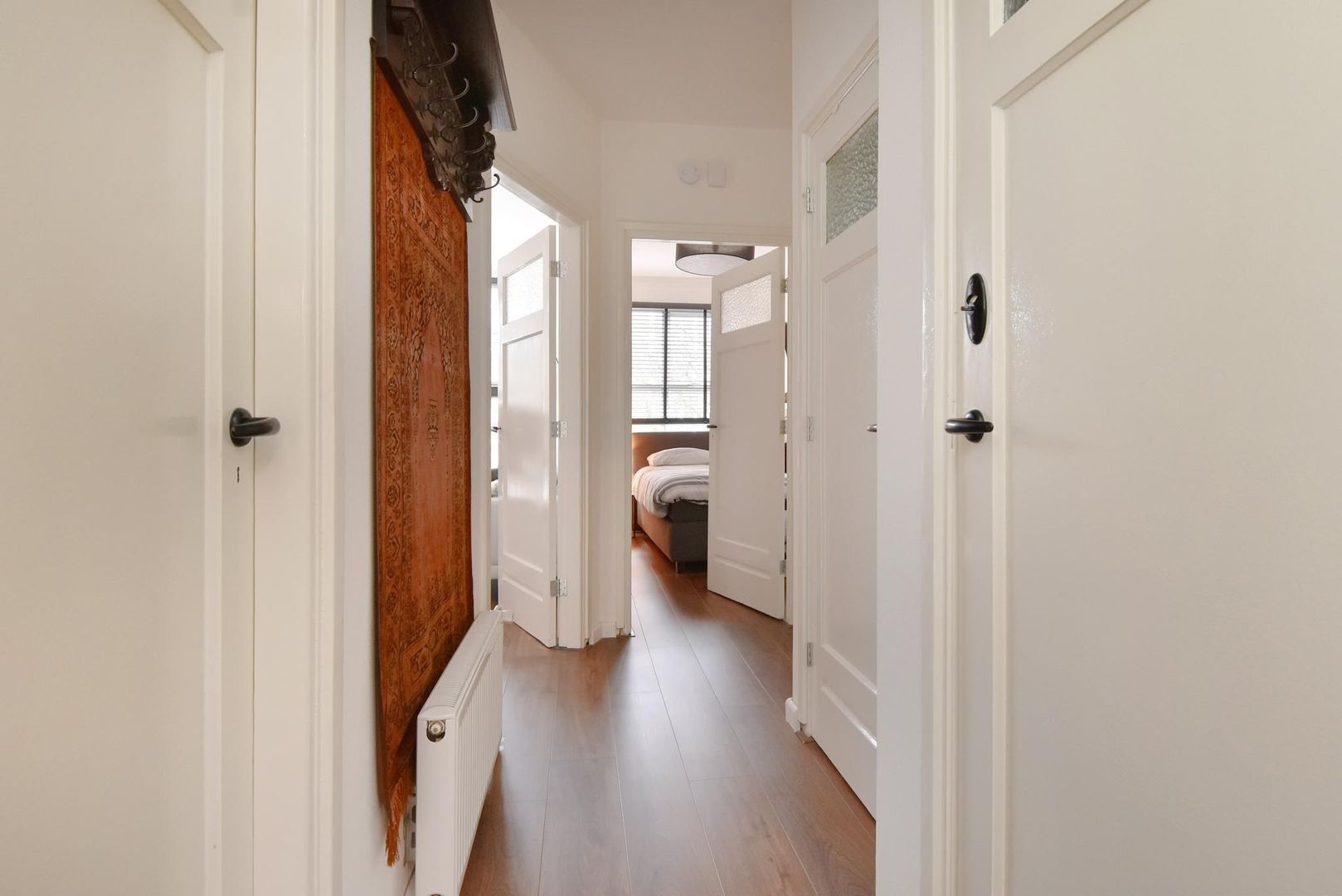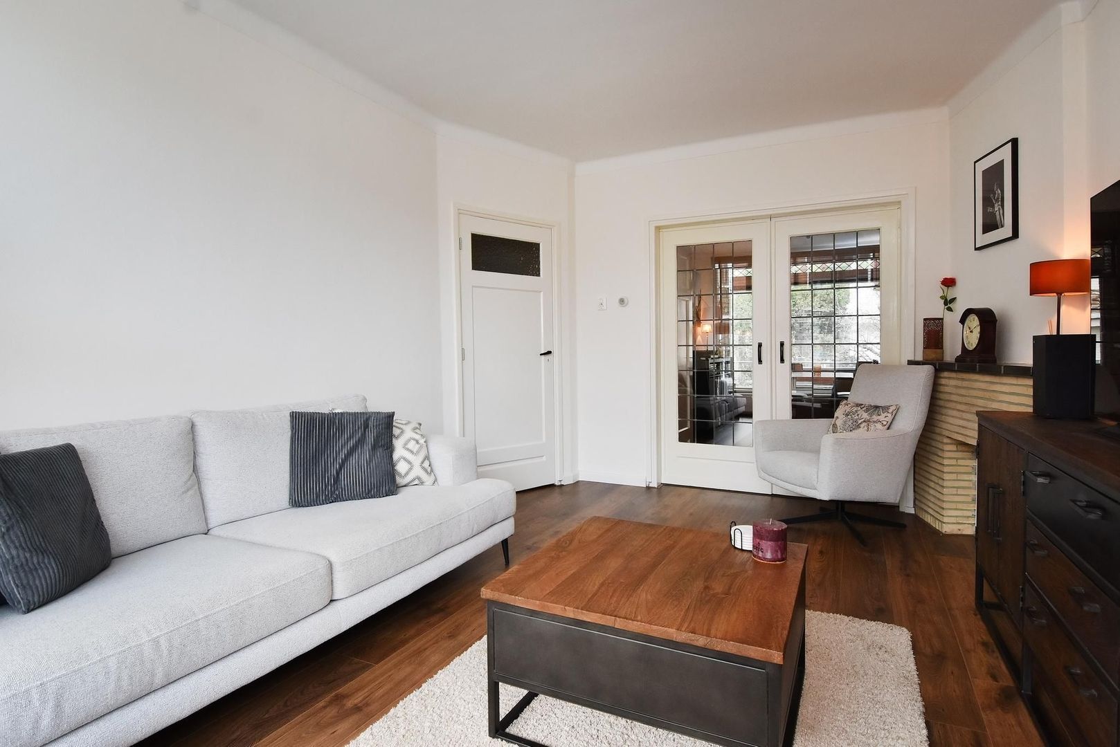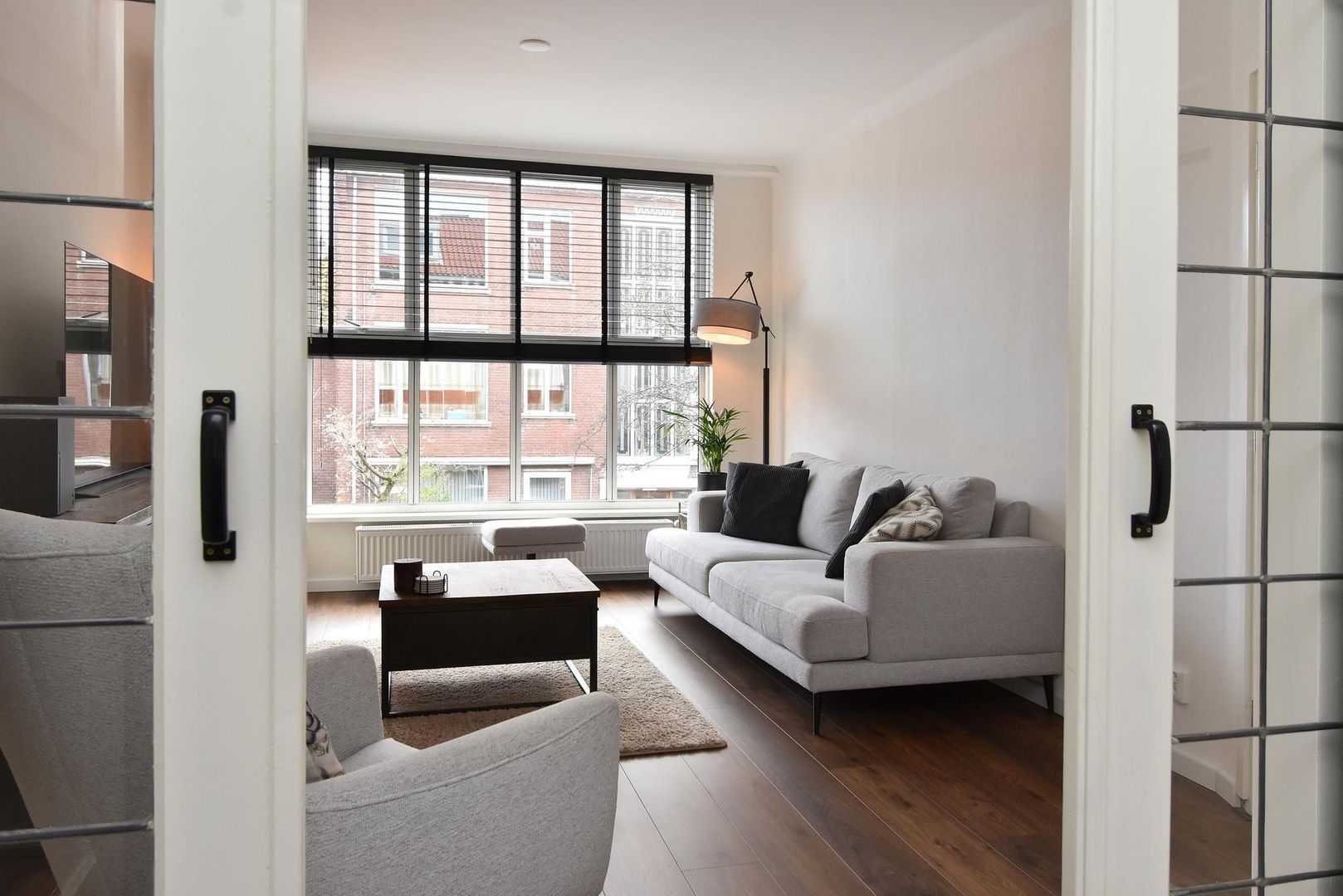 gesloten entree met brievenbus- en bellentableaus, entree appartement op de 1e etage, L-vormige gang, meterkast, slaapkamer aan de voorzijde 313x194. Sfeervolle woon/eetkamer ensuite 1038x340/300 met fraaie suite separatie met glas in lood schuifdeuren en vaste kasten, voorzijde kunststofkozijnen met fraaie roede verdeling en 2 oorspronkelijke schouwen. De vloer is voorzien van een mooie laminaatvloer (in het gehele appartement gelegen). Vanuit het eetgedeelte is het op de middag- en avondzon gelegen balkon aan de achterzijde bereikbaar. Eventueel is de achterkamer als ruime slaapkamer te benutten.