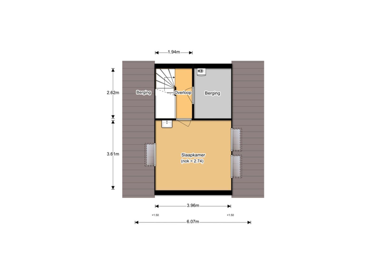 Zolderverdieping, trap naar de 2e etage, overloop met veel bergruimte achter de knieschotten, royale inpandige berging/stookruimte en als laatste een royale zolderkamer met veluxdakramen.