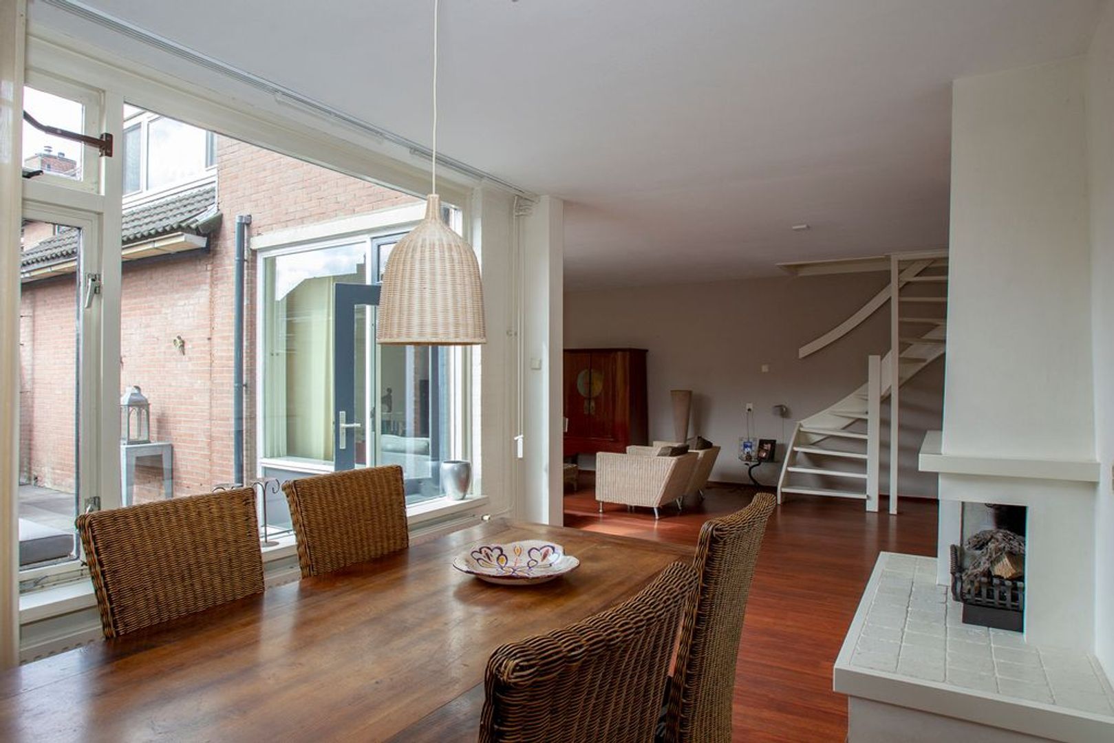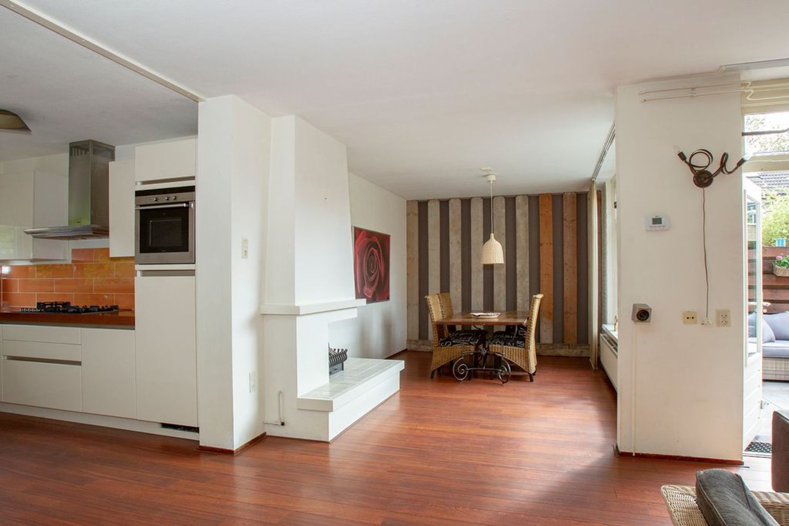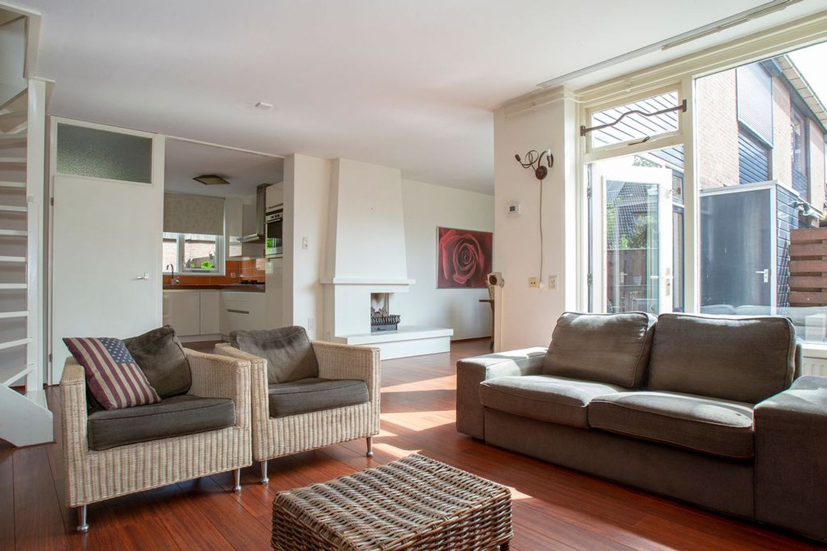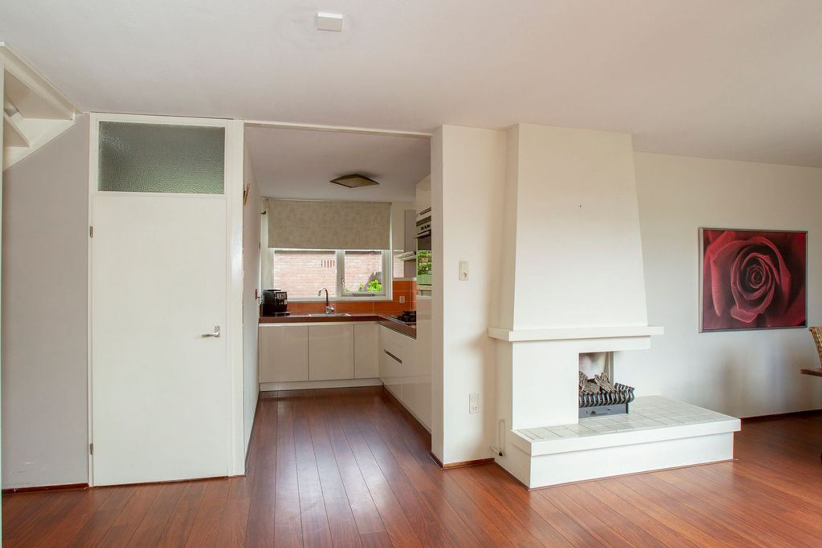 Voortuin met (fietsen-)berging, entree woning, hal met meterkast en keurig toilet. Lichte en ruime woon-/eetkamer met open haard en moderne open keuken voorzien van kookplaat, afzuigkap, combi-oven/magnetron, koelkast, vriezer en vaatwasser.