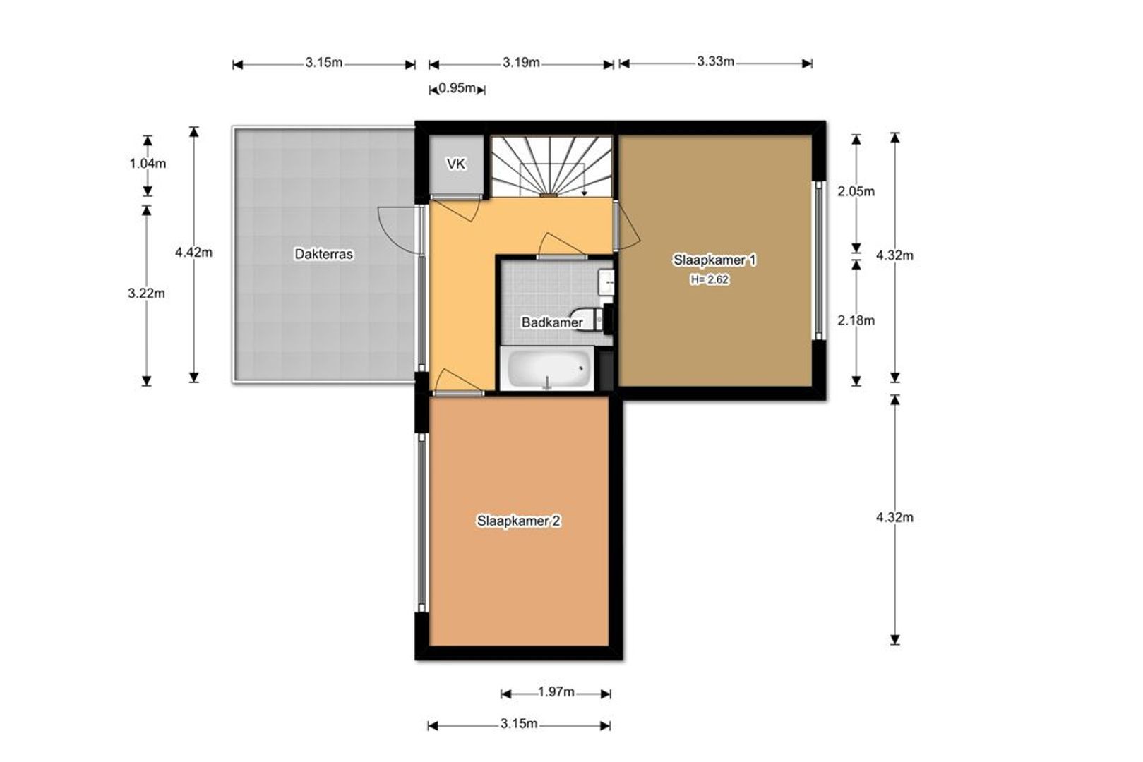 Slaapkamer 1 (ca. 4.32x3.33), slaapkamer 2 (ca. 4.32x3.15) en betegelde badkamer (ca. 2.18x1.97) voorzien van ligbad met douchecombinatie, tweede toilet, wastafel met meubel en bovenkast, handdoekradiator en wasmachine-aansluiting.