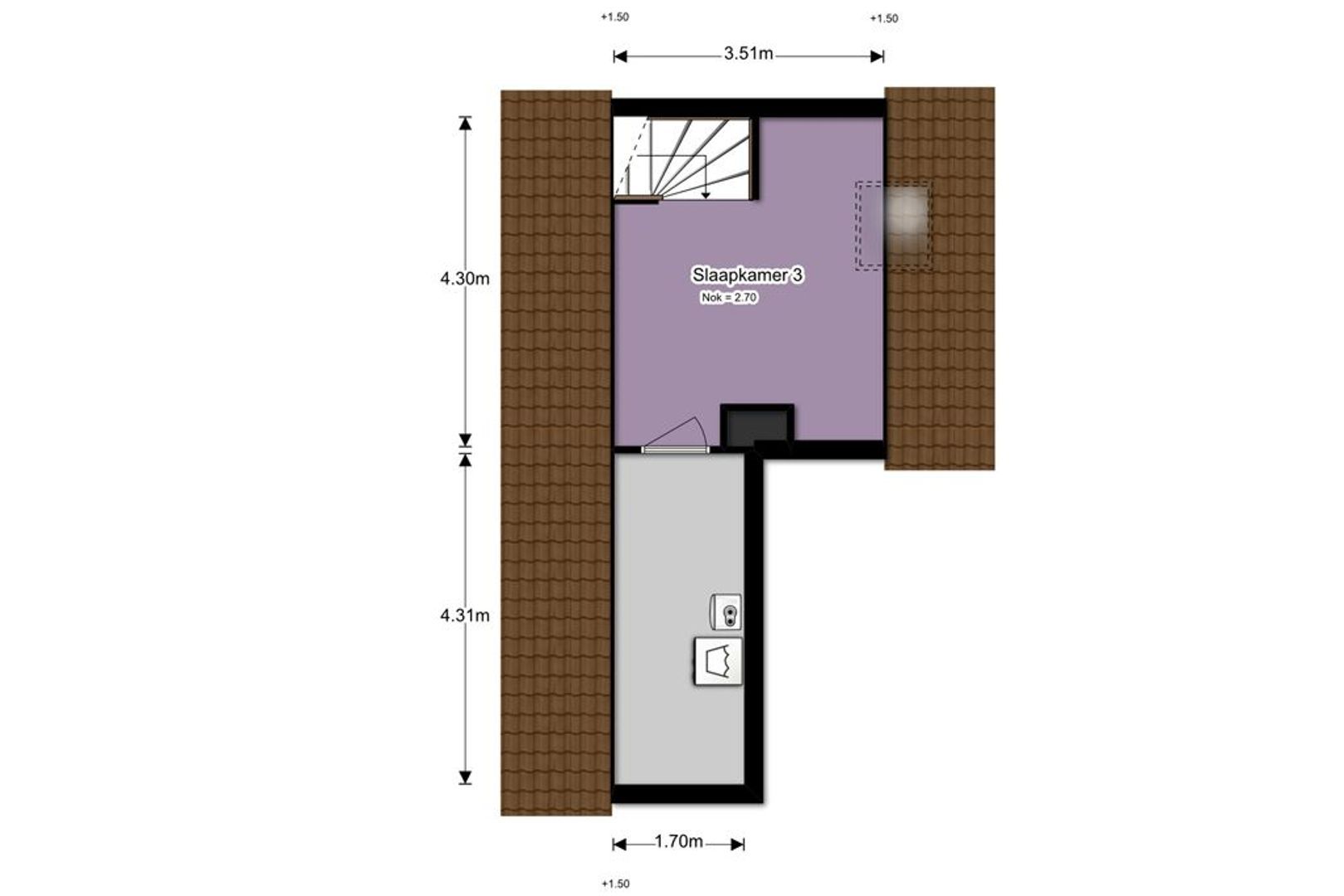 2e etage: ruime zolderetage met 3e slaapkamer (ca. 4.30x3.51) en grote bergruimte (ca. 4.31x1.70) met opstelplaats cv-ketel.